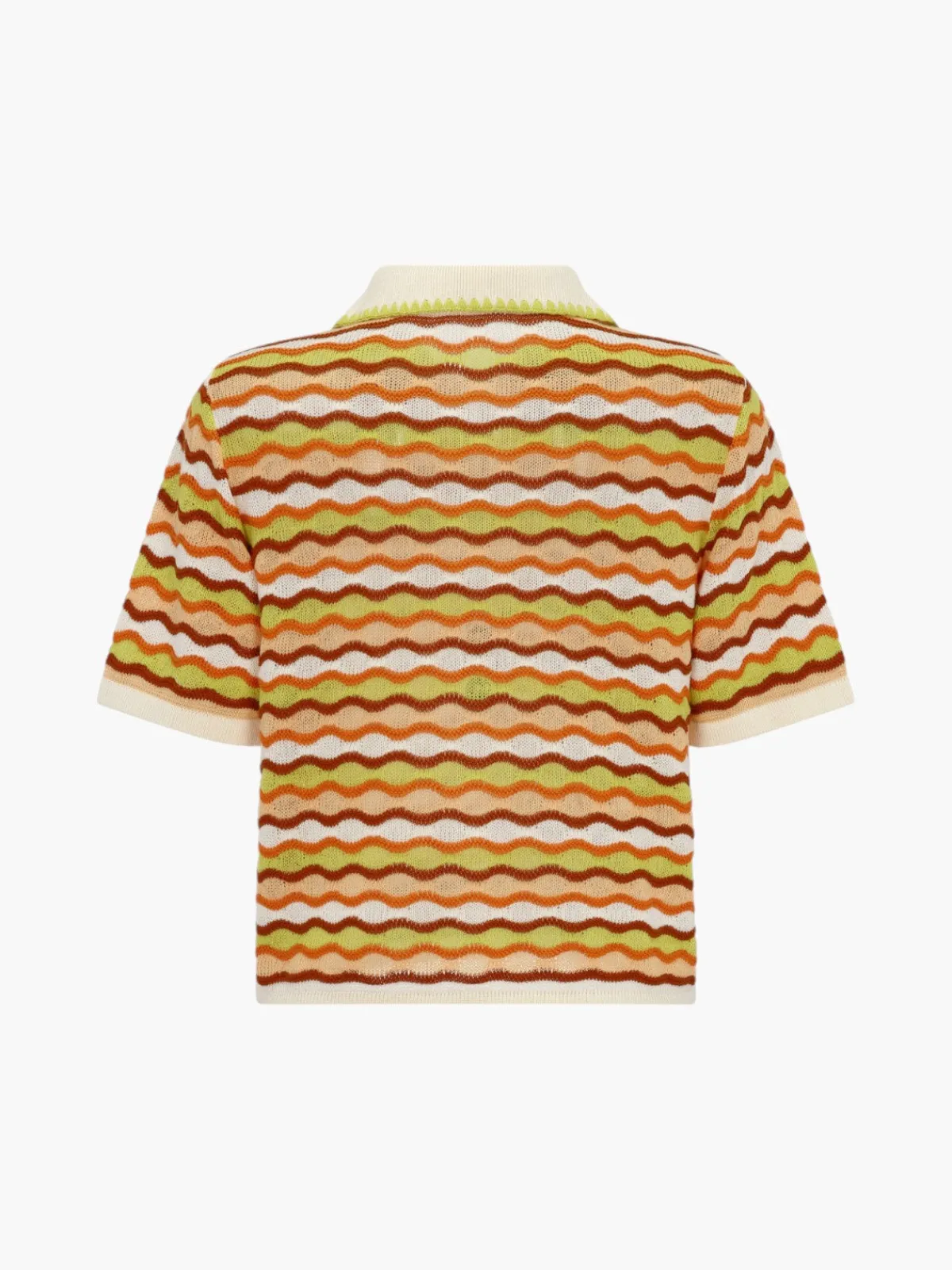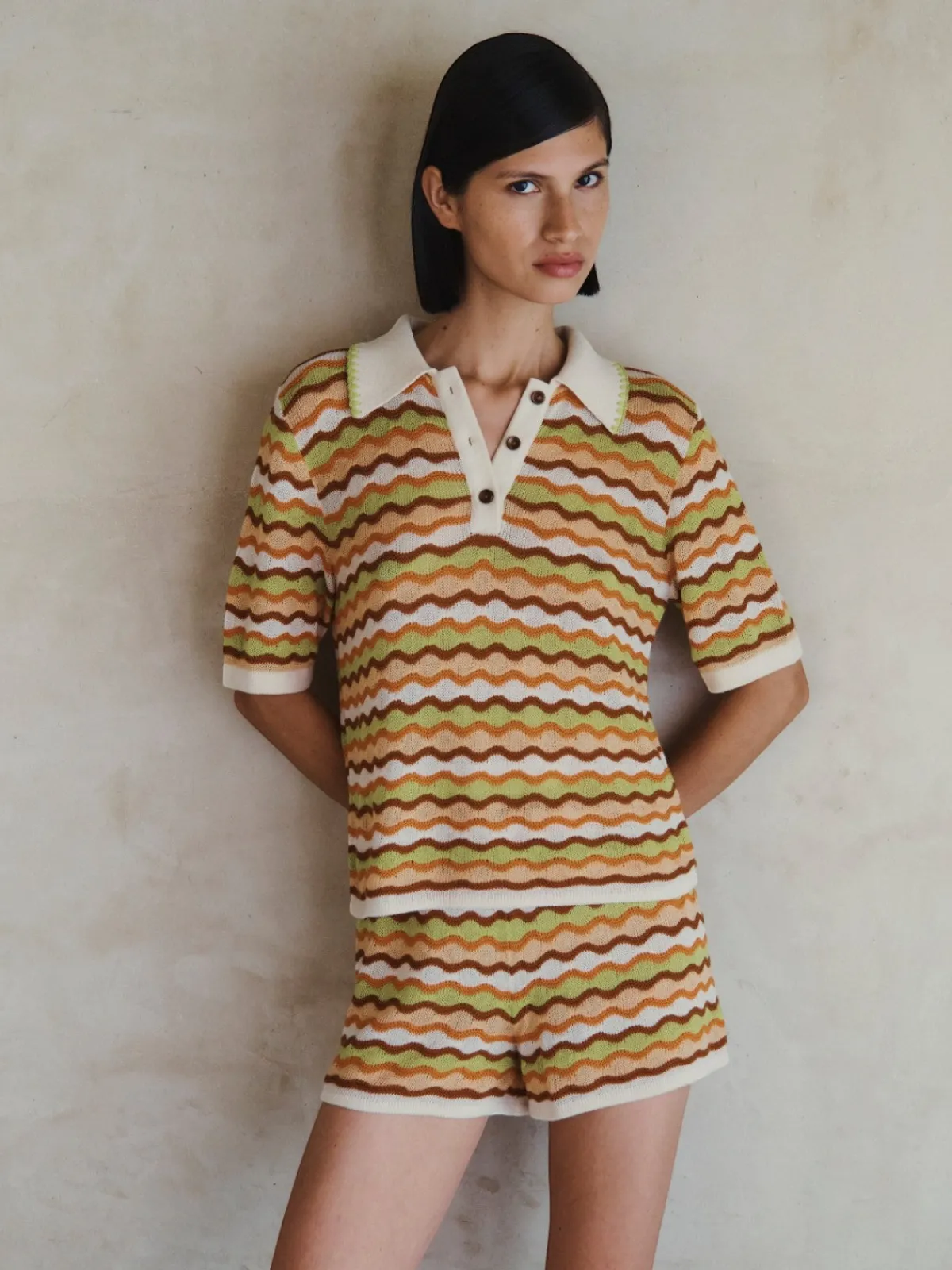 Our ESCVDO Mullu Polo Shirt in Orange/Lime is a short sleeve polo in a multi color wavey print with front buttons. Pair it with the matching Mullu Shorts for a full set. Handcrafted by female artisans in Peru.