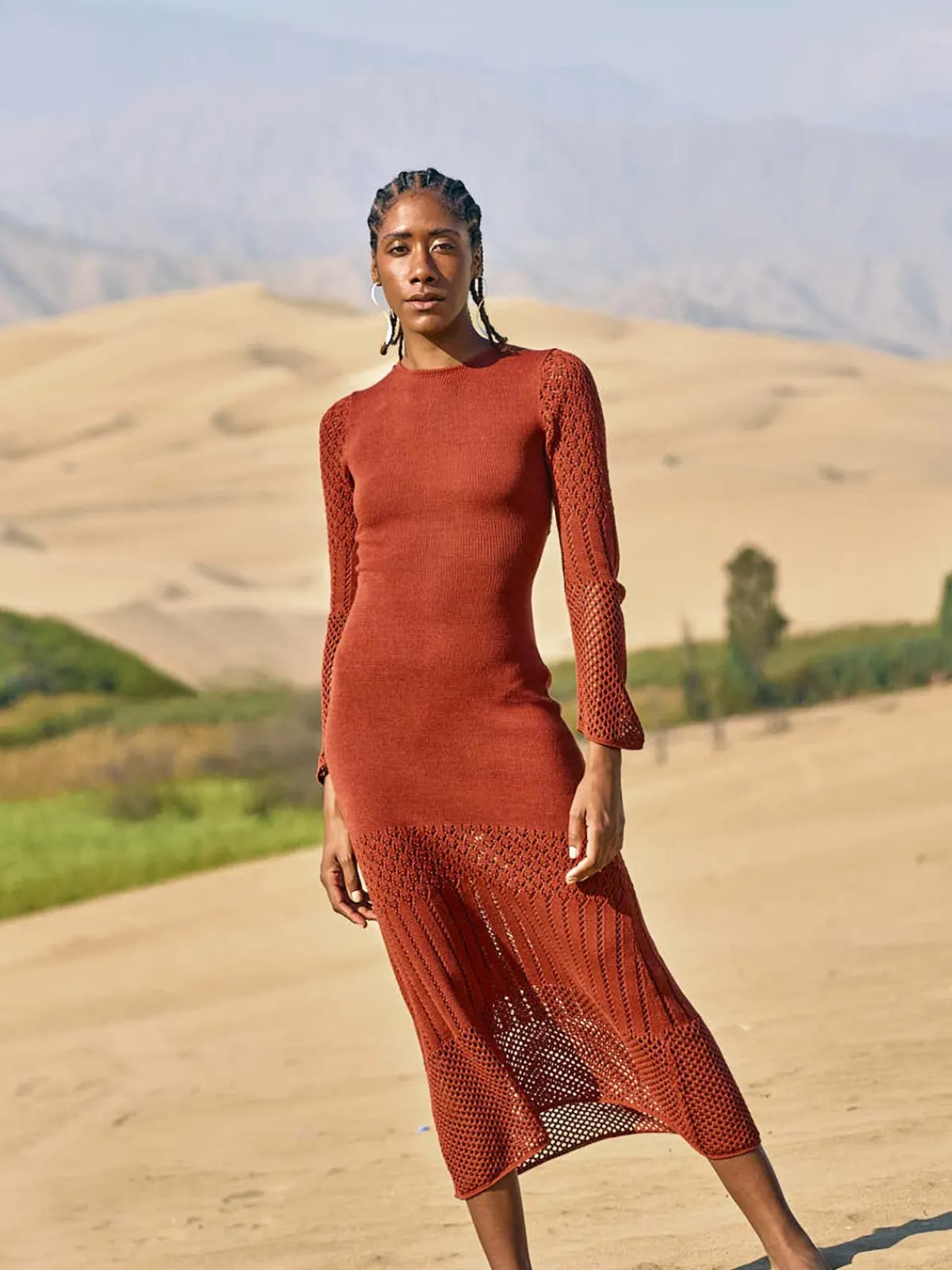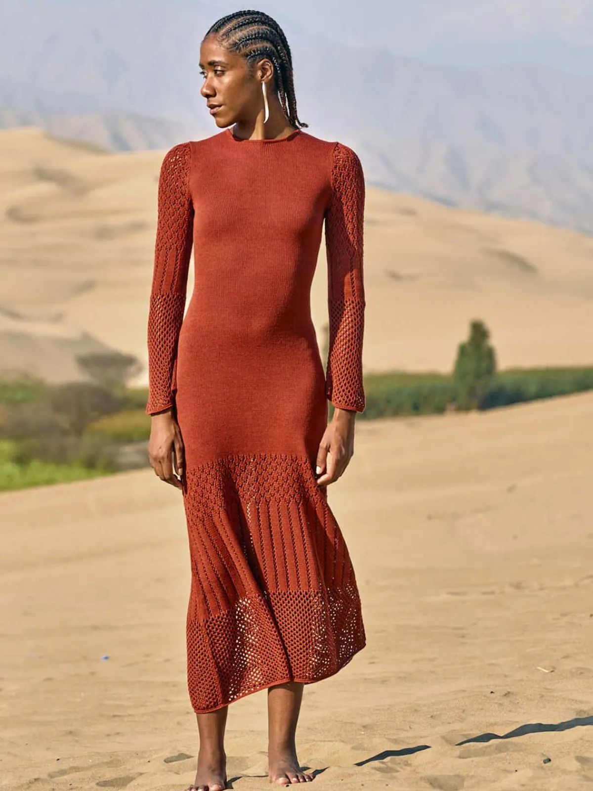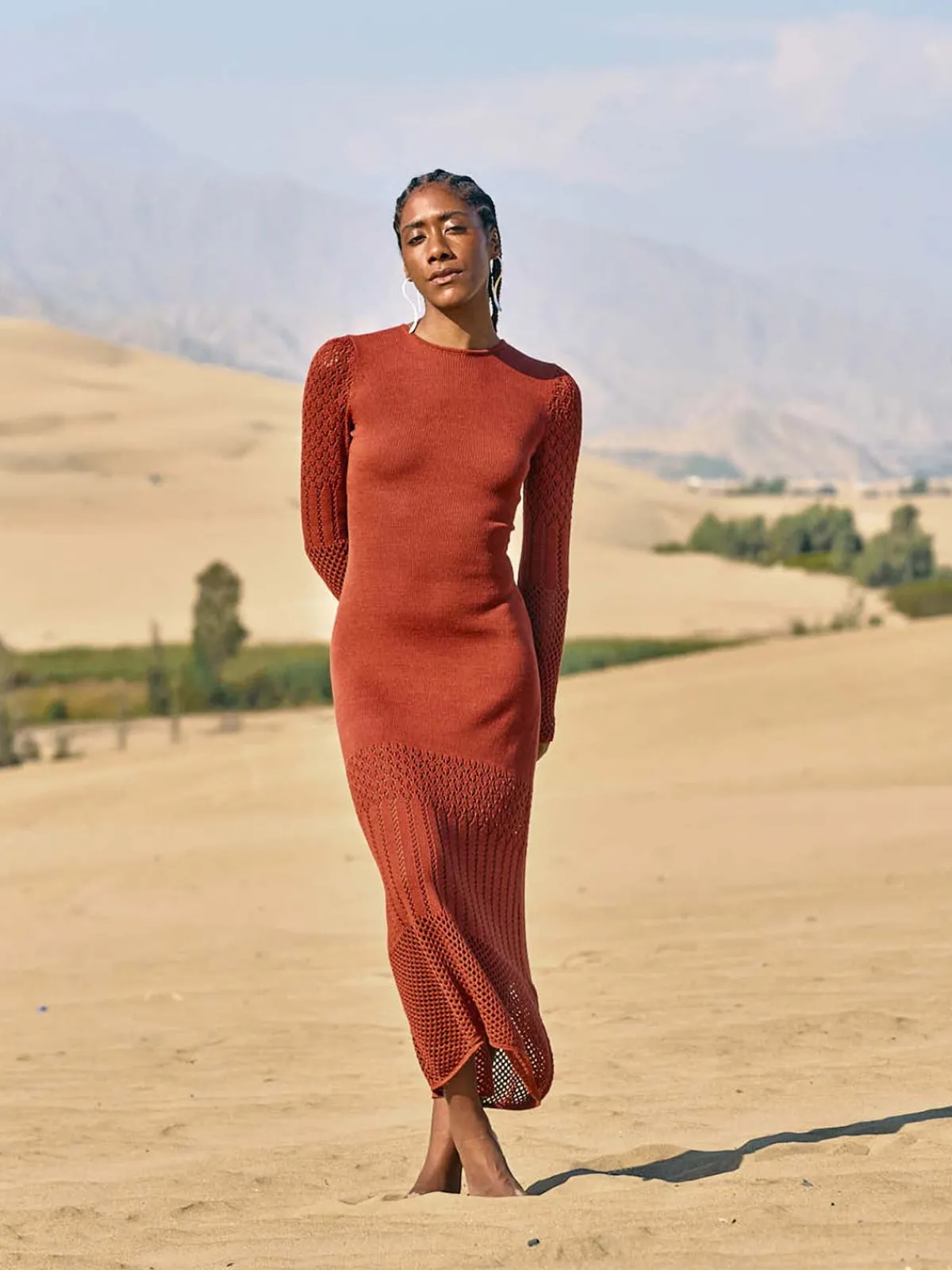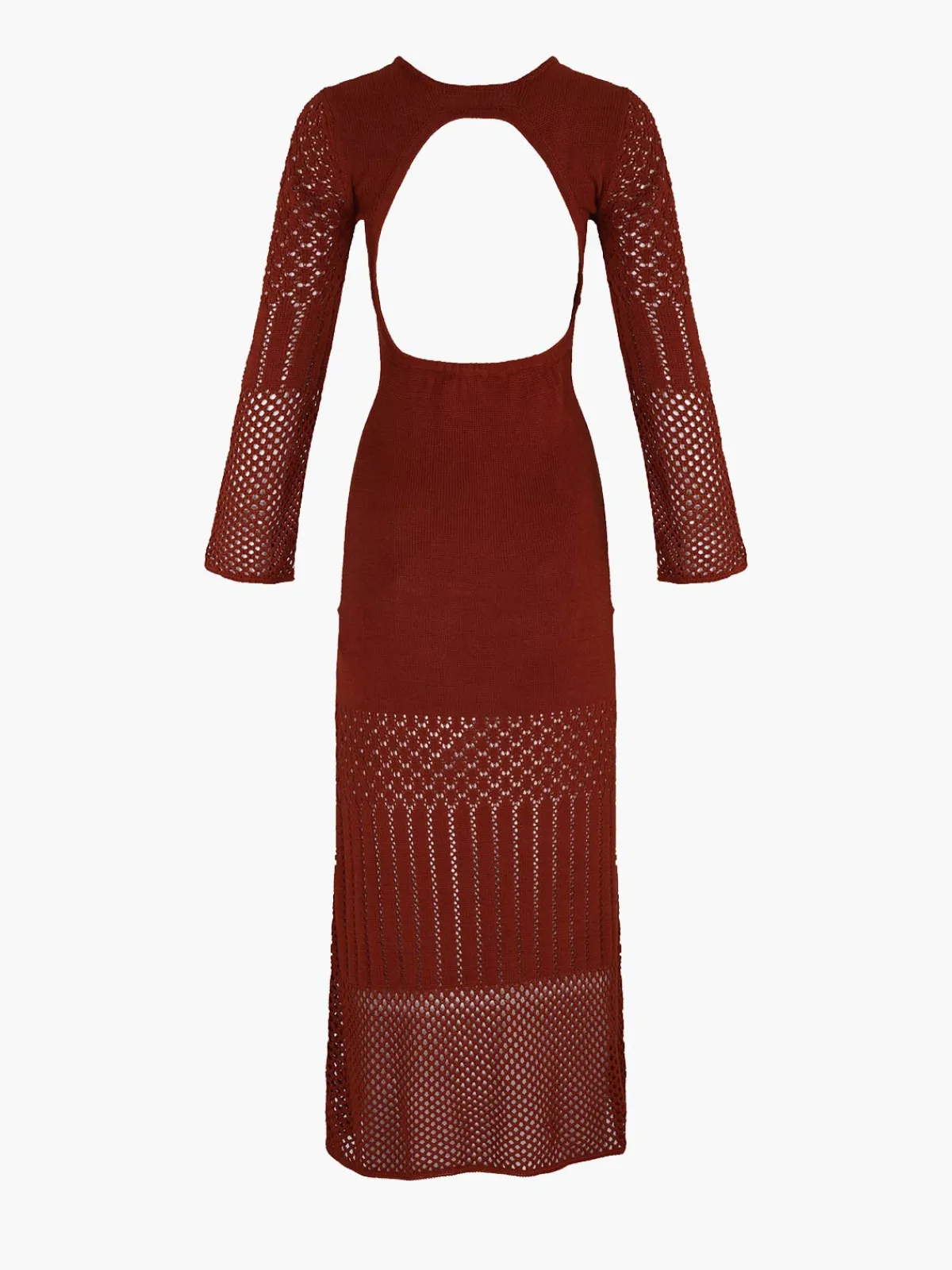 Our ESCVDO Murga Maxi Dress in Brown is a maxi dress with long sleeves, an open back and open knit detailing at hem and cuffs. Crafted by Vilma Bautista in her workshop in Lima, Peru.