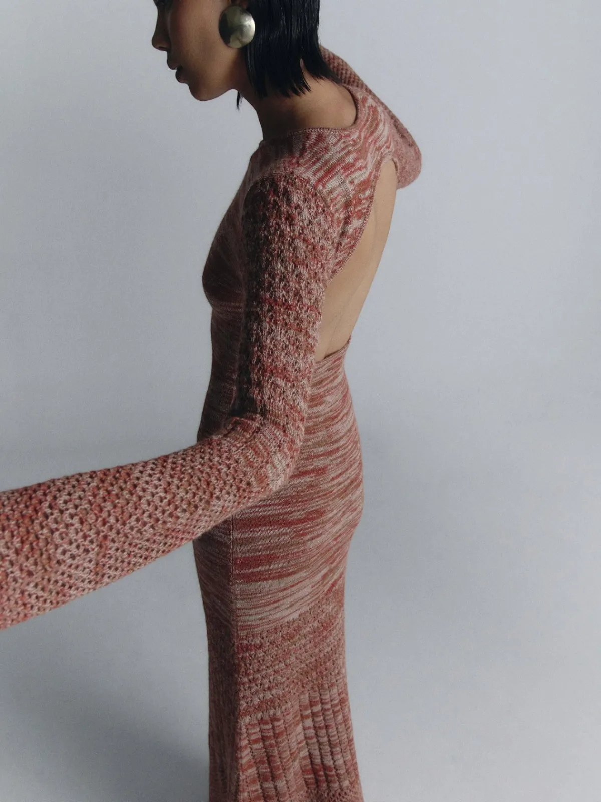 Our ESCVDO Murga Maxi Dress in Lacre is a maxi length dress with long bell sleeves and a deep open back. This piece was made by Miriam Garay in her workshop in Huarochirí, Peru.