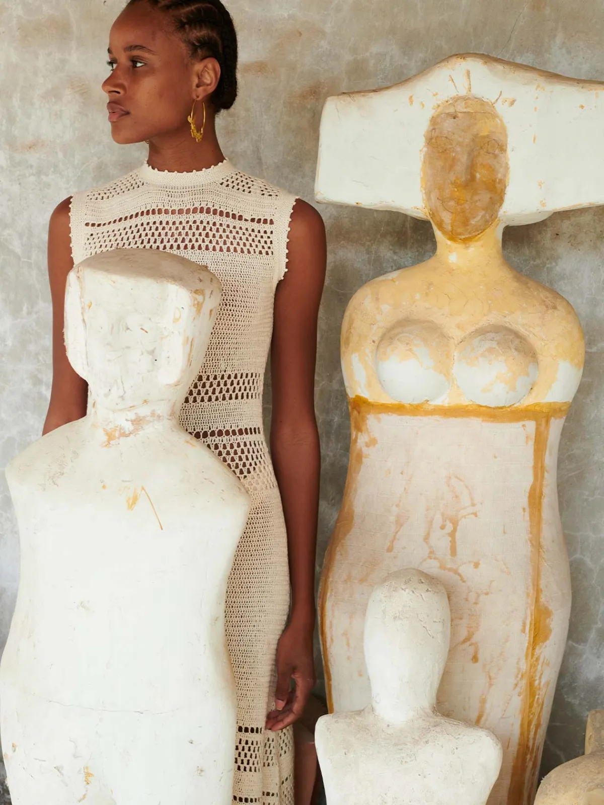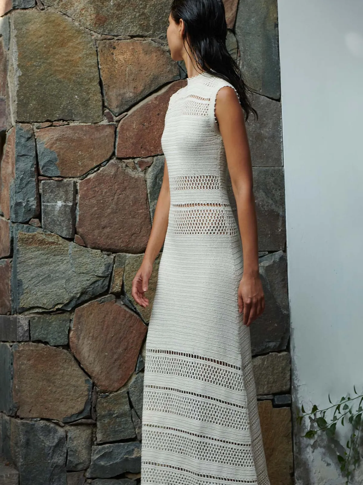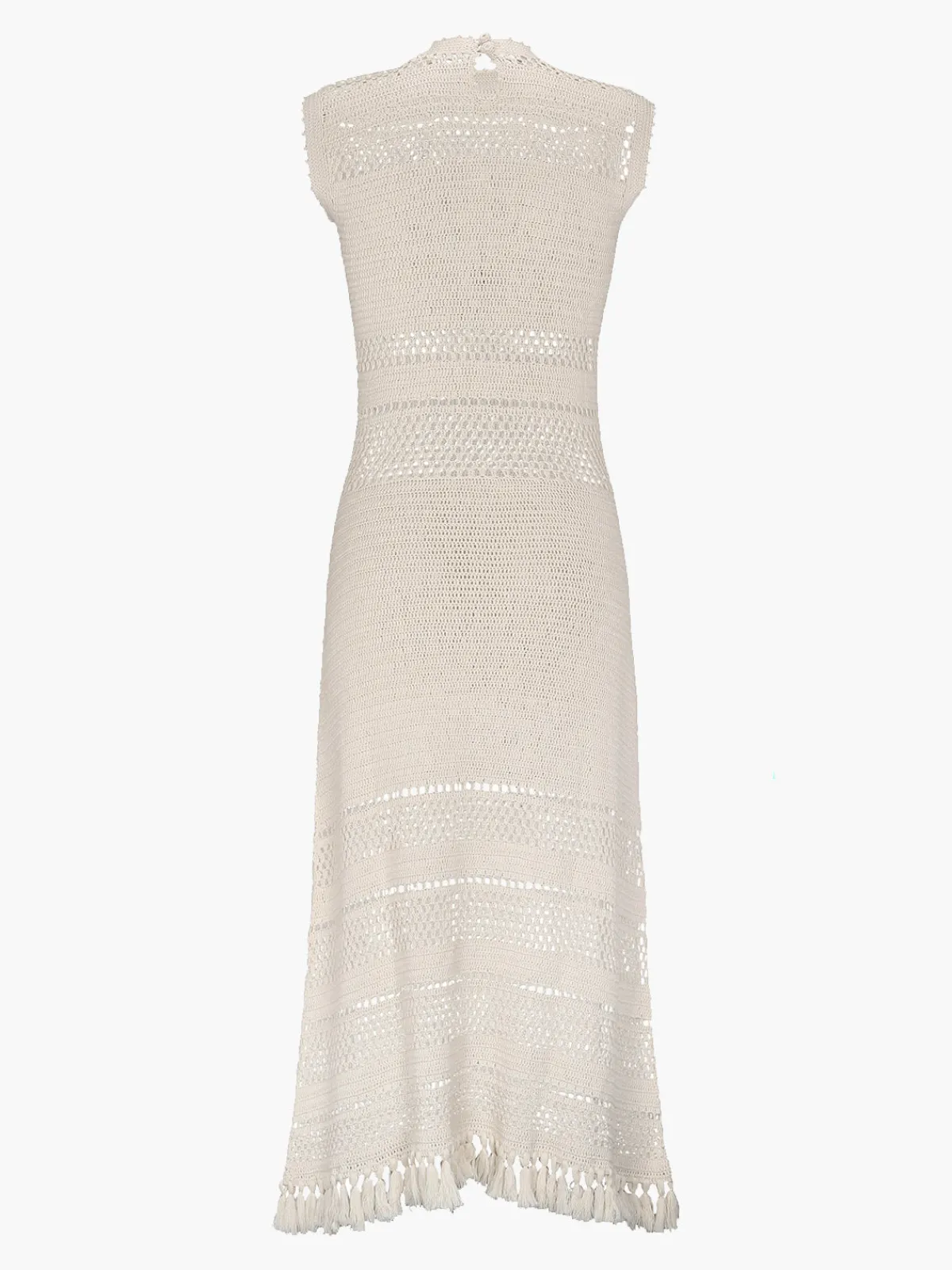 Our ESCVDO Nanay Midi Dress features a sleeveless silhouette with a round neckline, mixed crochet patterns, and fringed tassels at the hem. Handcrafted by female artisans in Peru.