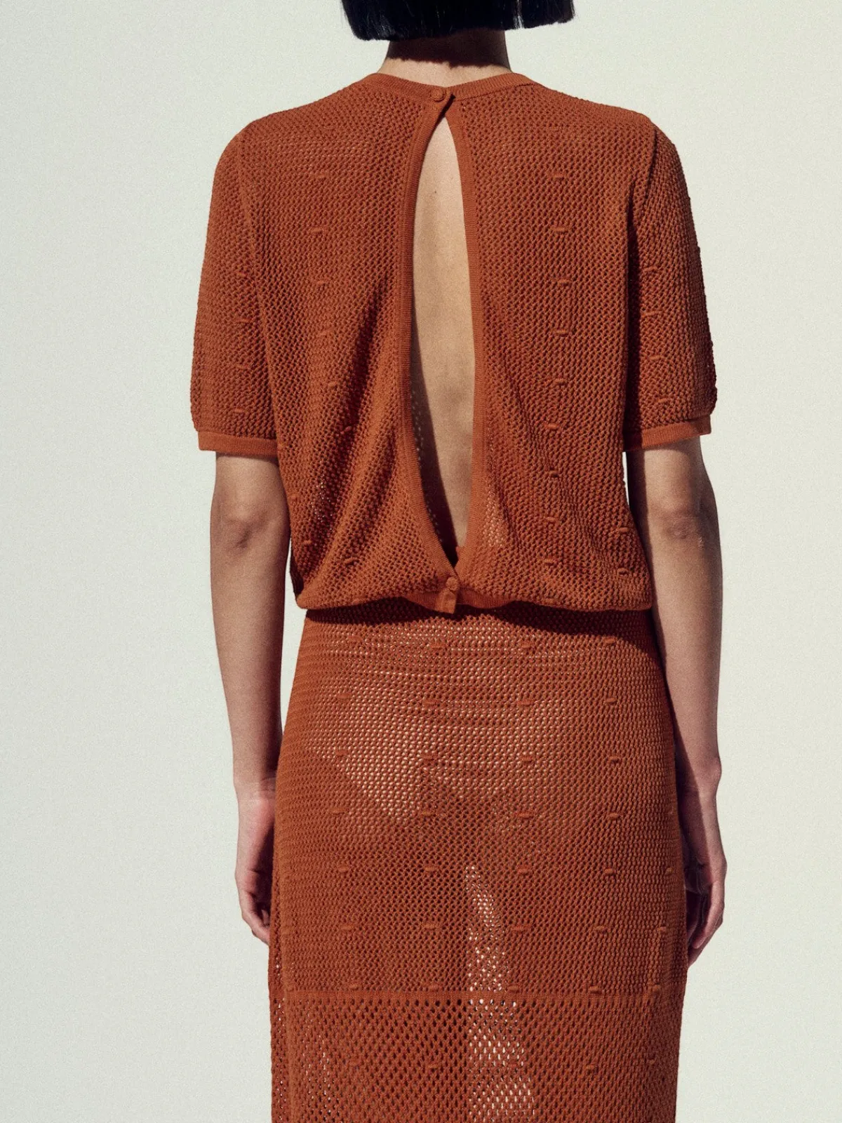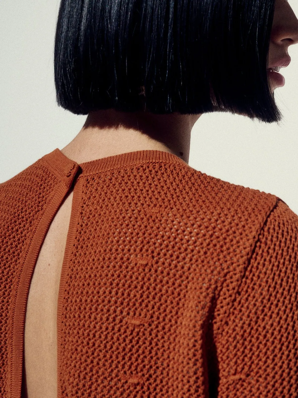 Our ESCVDO Ofrenda Blouse in Tobacco is a quintessentially feminine piece, infused with a nod to 1960s elegance. The blouse is distinguished by a semi-open back, while cuffed detailing at the neckline, sleeves, and hem adds a refined, tailored finish. This combination of retro-inspired charm and modern refinement makes for a truly timeless design. Handcrafted by female artisans in Peru.