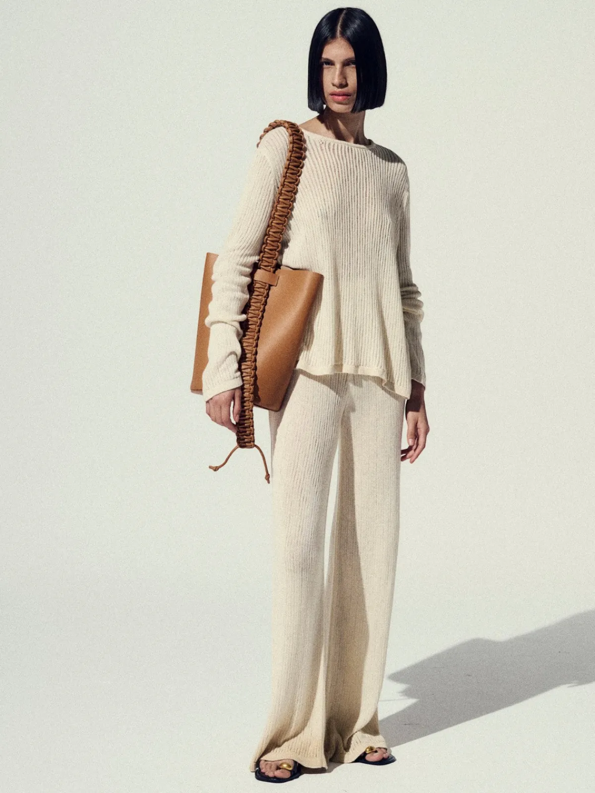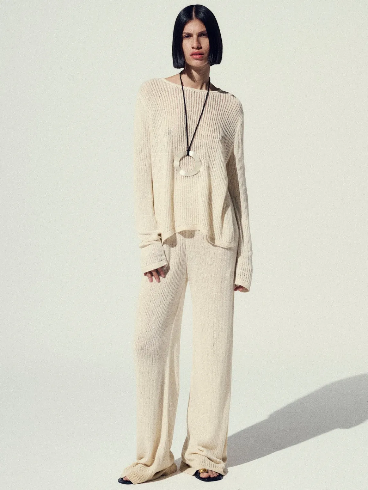 Our ESCVDO Onda Pants in Ivory are a refined boot-cut design, distinguished by a distinctive textured stitch that creates a semi-transparent, wave-like pattern. The irregular wave effect evokes the fluidity and grace of water, enhancing the pants’ dynamic, yet delicate aesthetic. Pair with the Onda Top for a matching set. Handcrafted by female artisans in Peru.