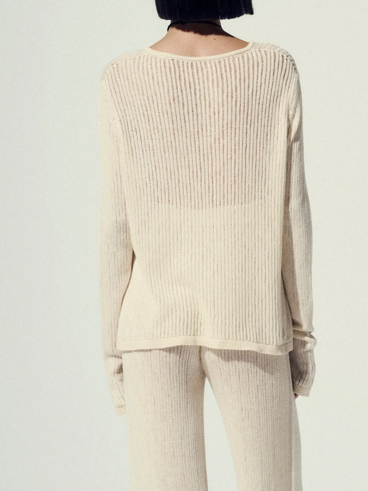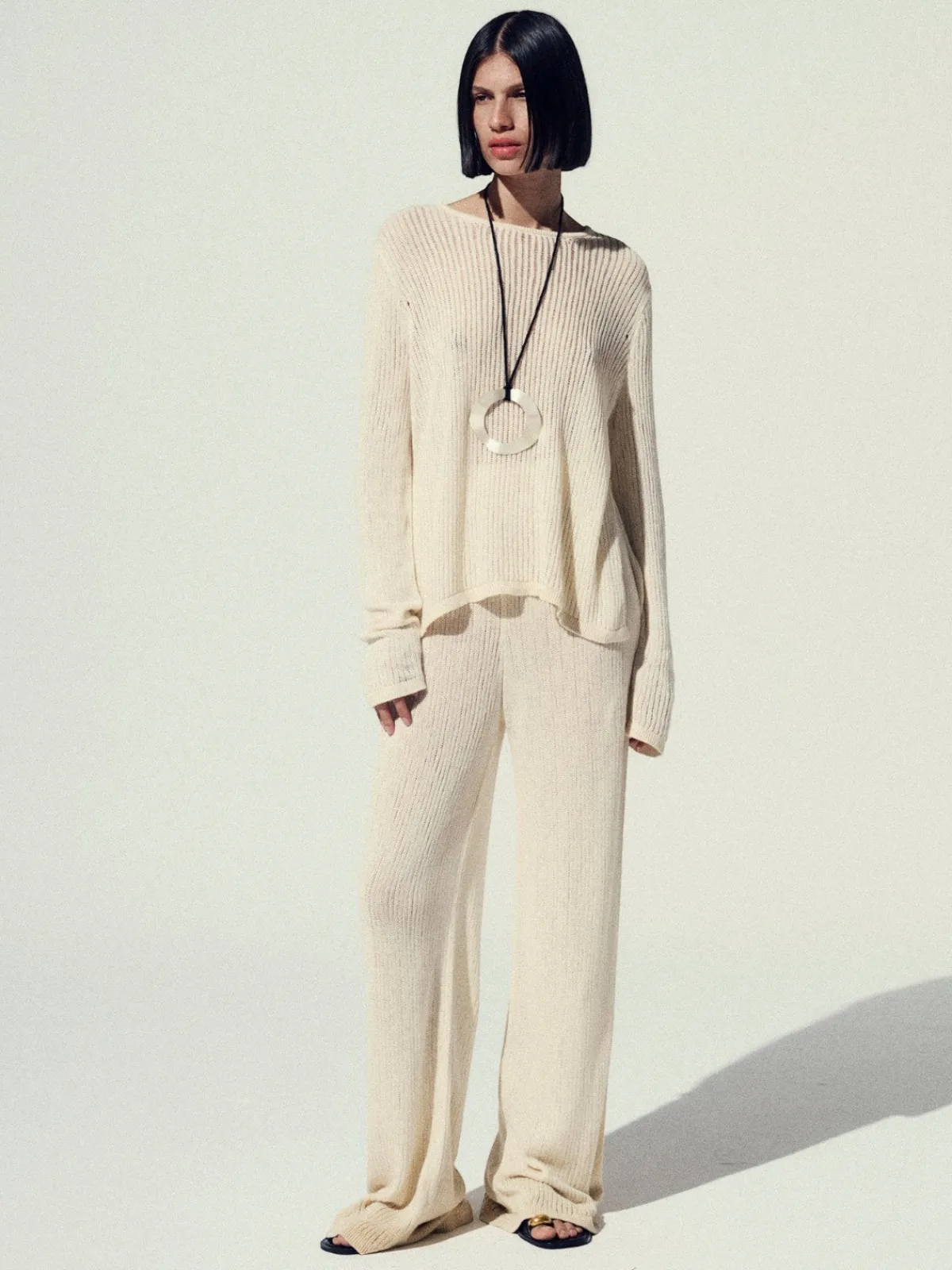 Our ESCVDO Onda Top in Ivory is a long-sleeved, straight-cut piece that exudes understated sophistication. It is adorned with meticulously hand-applied crochet detailing at the neckline, adding a touch of artisanal craftsmanship. The fabric features a unique, semi-transparent stitch with a textured, wave-like pattern, creating an intriguing interplay of depth and light. Pair with the Onda Pants for a matching set. Handcrafted by female artisans in Peru.
