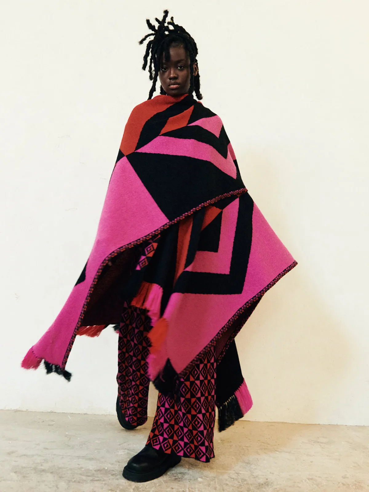 Our ESCVDO Qero Pants feature a wide leg silhouette with a high waist, a geometric jacquard pattern, and a stretch waistband. Handcrafted by female artisans in Peru.