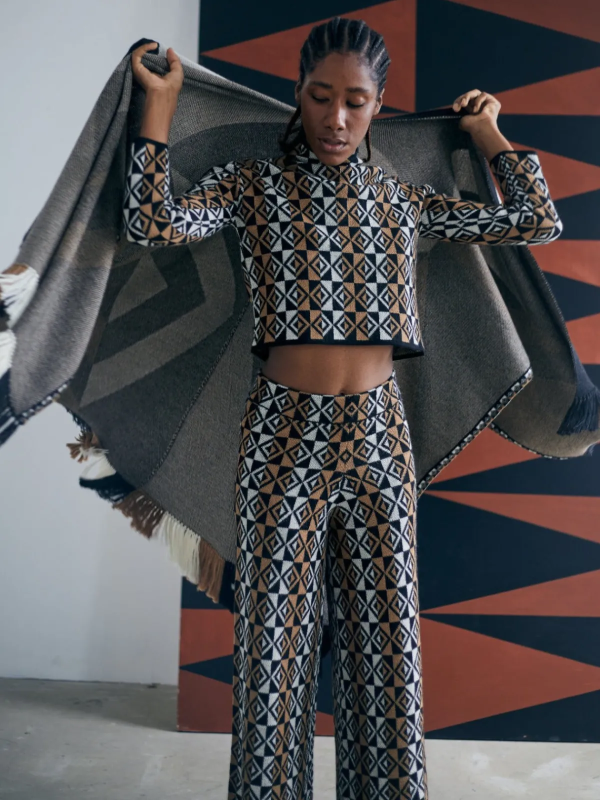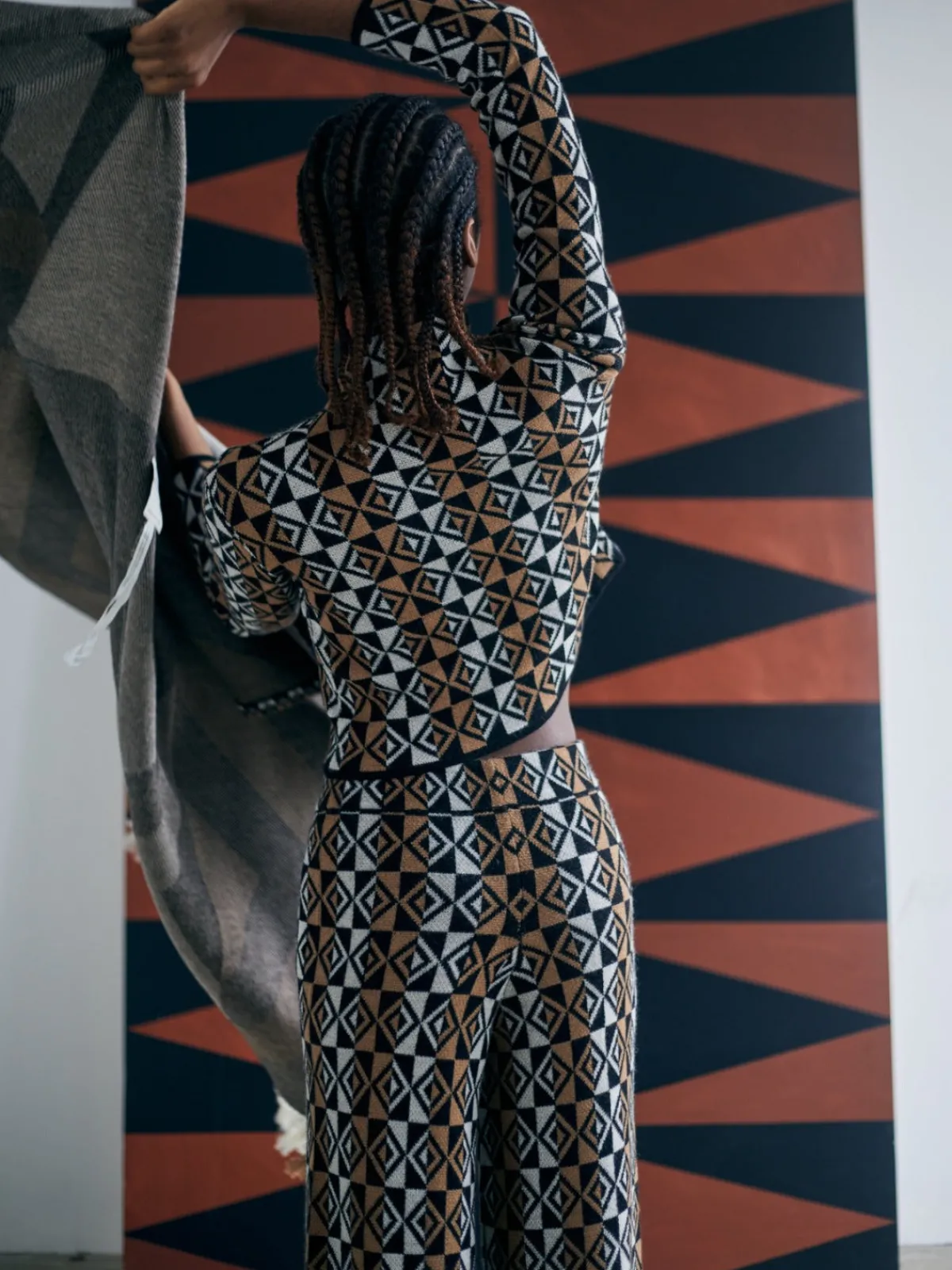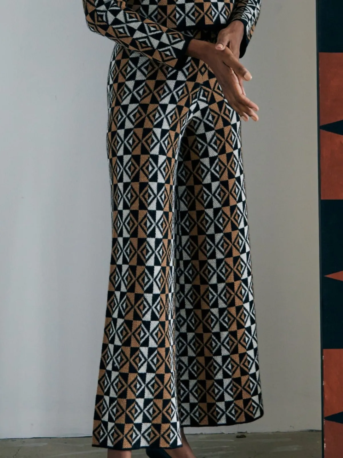 Our ESCVDO Qero Pants in Sand feature a wide leg silhouette with a high waist, a geometric jacquard pattern, and a stretch waistband. Handcrafted by female artisans in Peru.