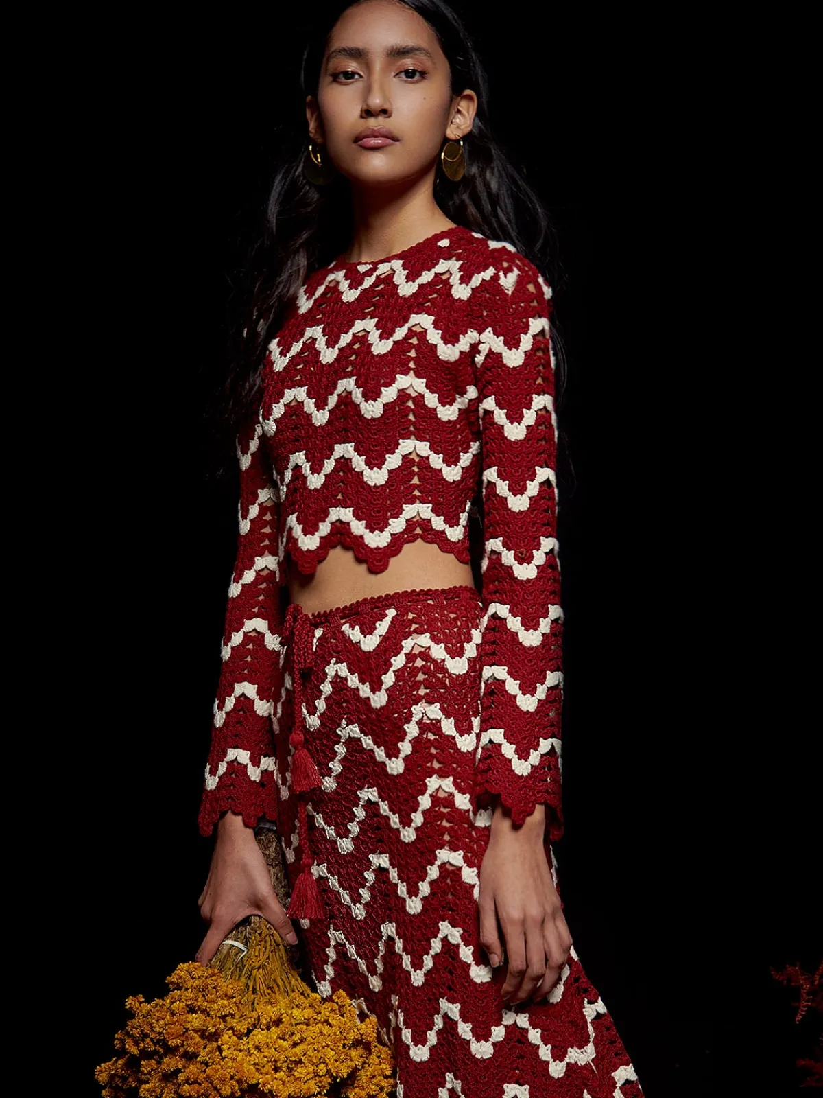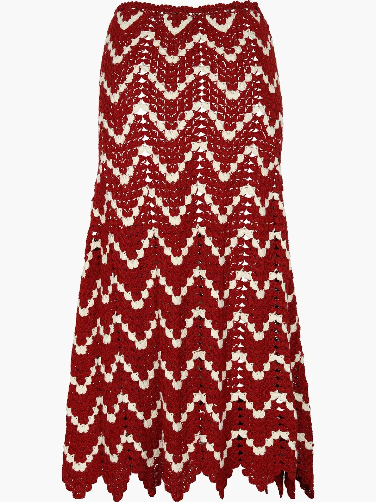 Our ESCVDO Safi Skirt in Burgundy is crocheted in a mermaid silhouette with a midi length, a zig zag stitch pattern, and drawstring ties at the waist. Handcrafted by female artisans in Peru.