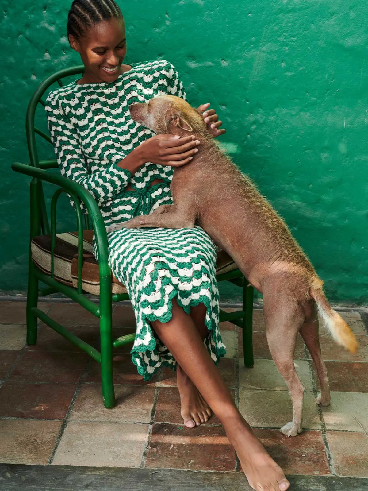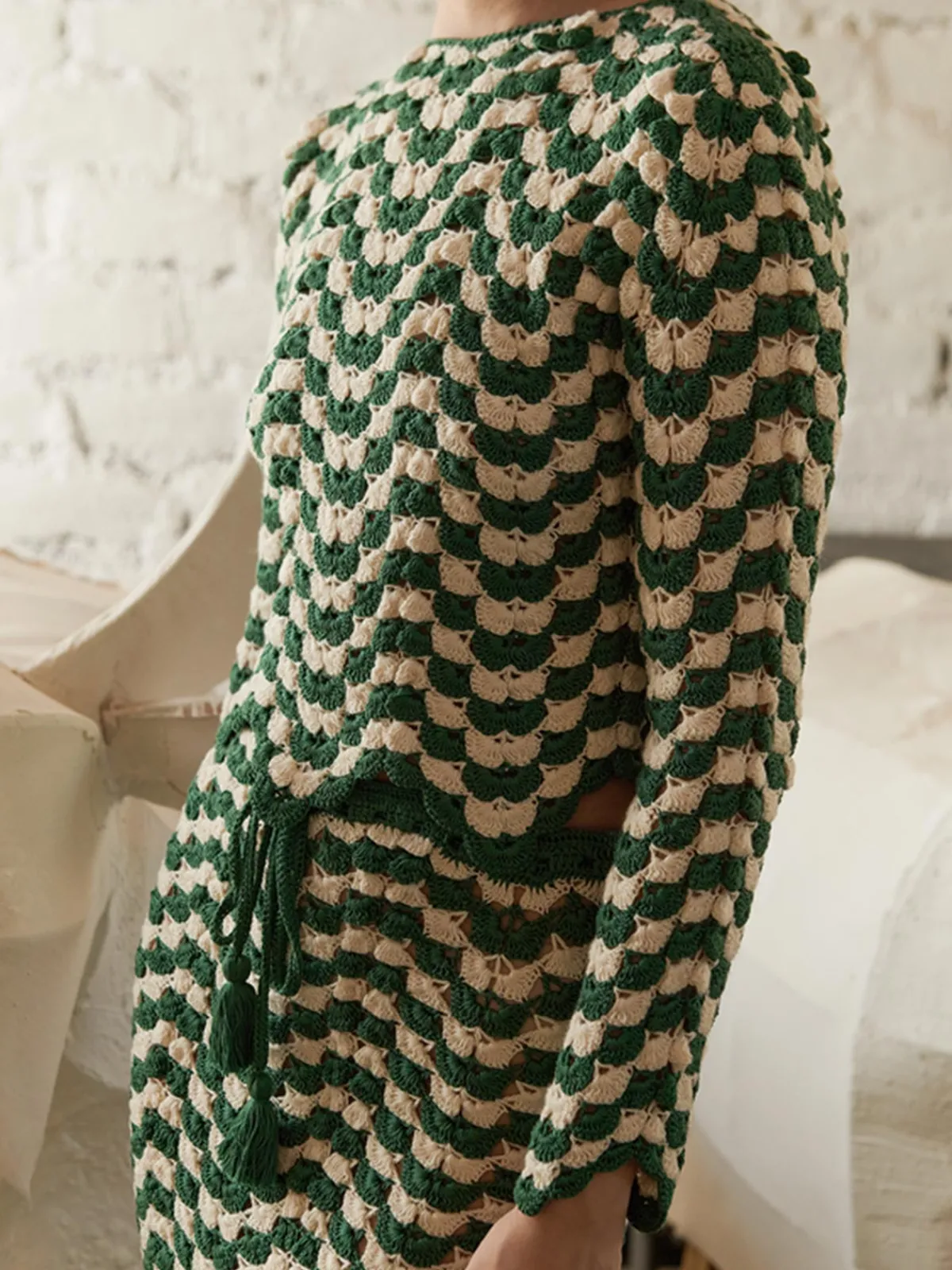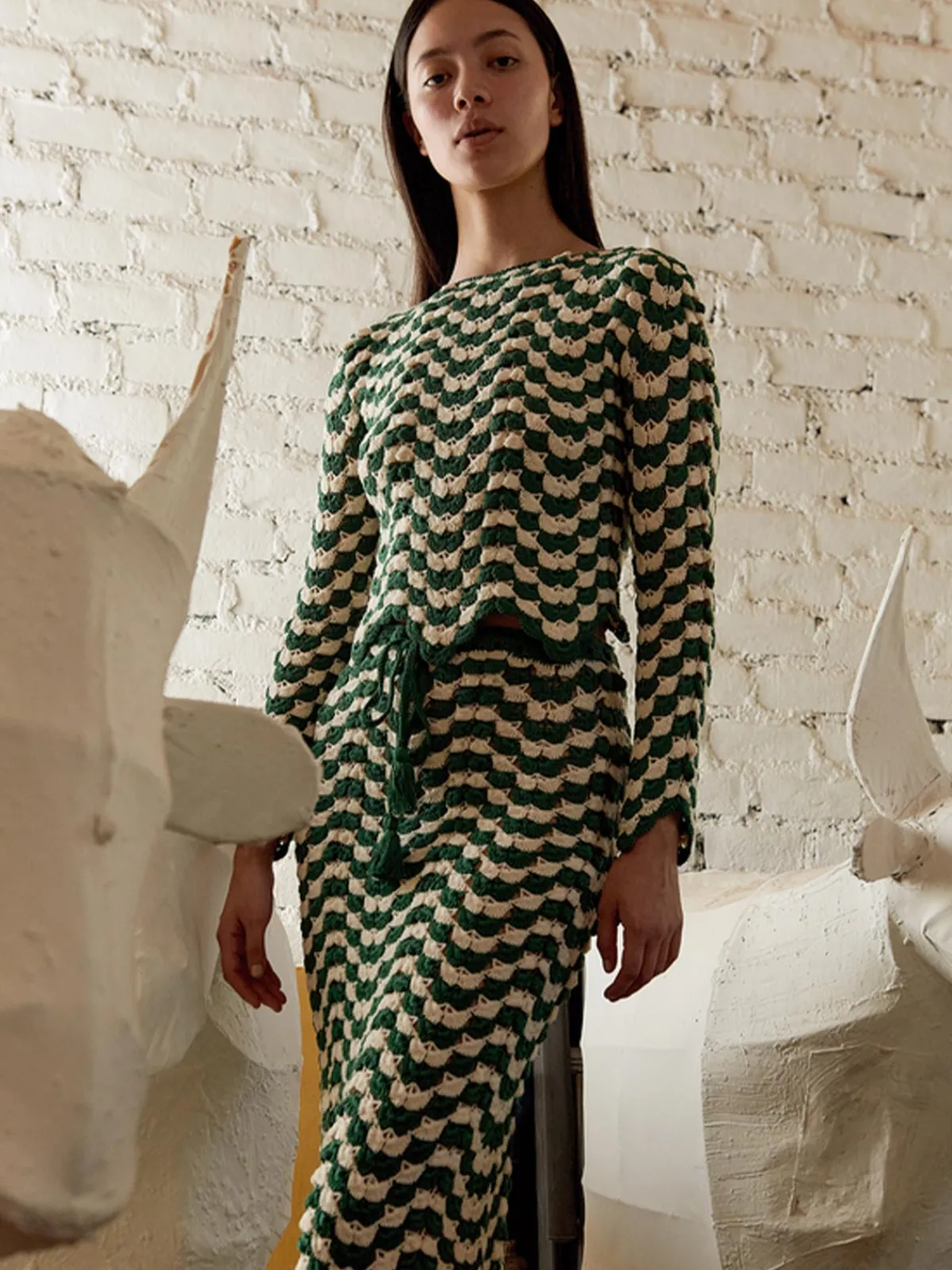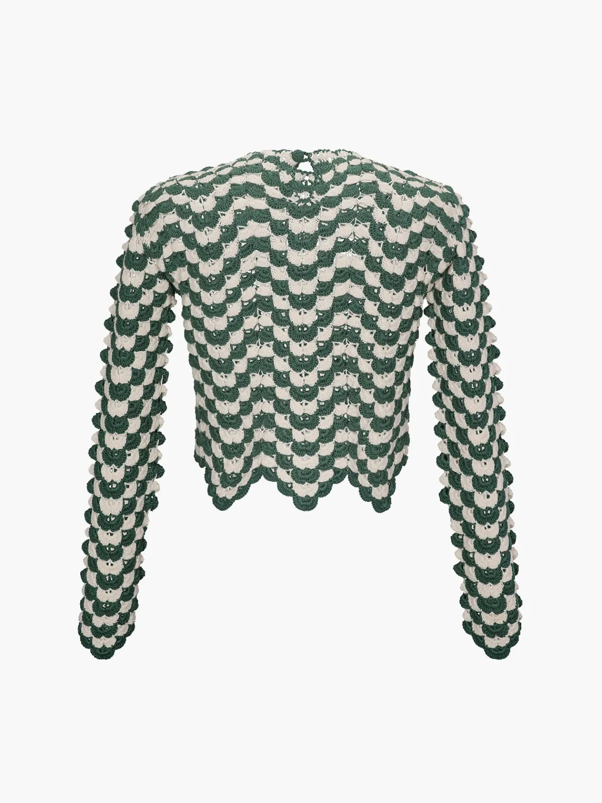 Our ESCVDO Safi Top in Ivory/Green features a fitted and cropped silhouette with long sleeves, a crew neckline, and a zig zag crochet pattern. Finished with a button closure at the back of the neck. Handcrafted by female artisans in Peru.