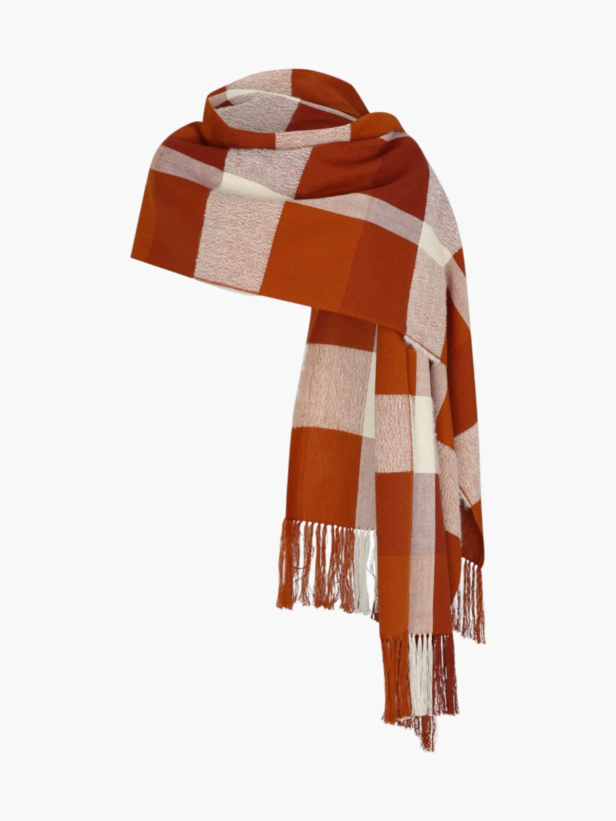 Our ESCVDO Spondylus Scarf in Ivory/Tobacco is handwoven on a traditional pedal loom, its delicate finish exudes warmth and sophistication. The design is a refined interplay of colors, showcasing geometric patterns inspired by ancient Inca motifs. Rather than traditional fringes, the scarf is completed with an intrinsic loom finish, preserving the integrity of its artisanal heritage while enhancing its unique, timeless appeal. Made by Pedro Quincho and his collective of artisans in Huancavelica, Peru; the final piece was ensembled by Matilde Sánchez at the ESCVDO workshop in Lima, Peru.