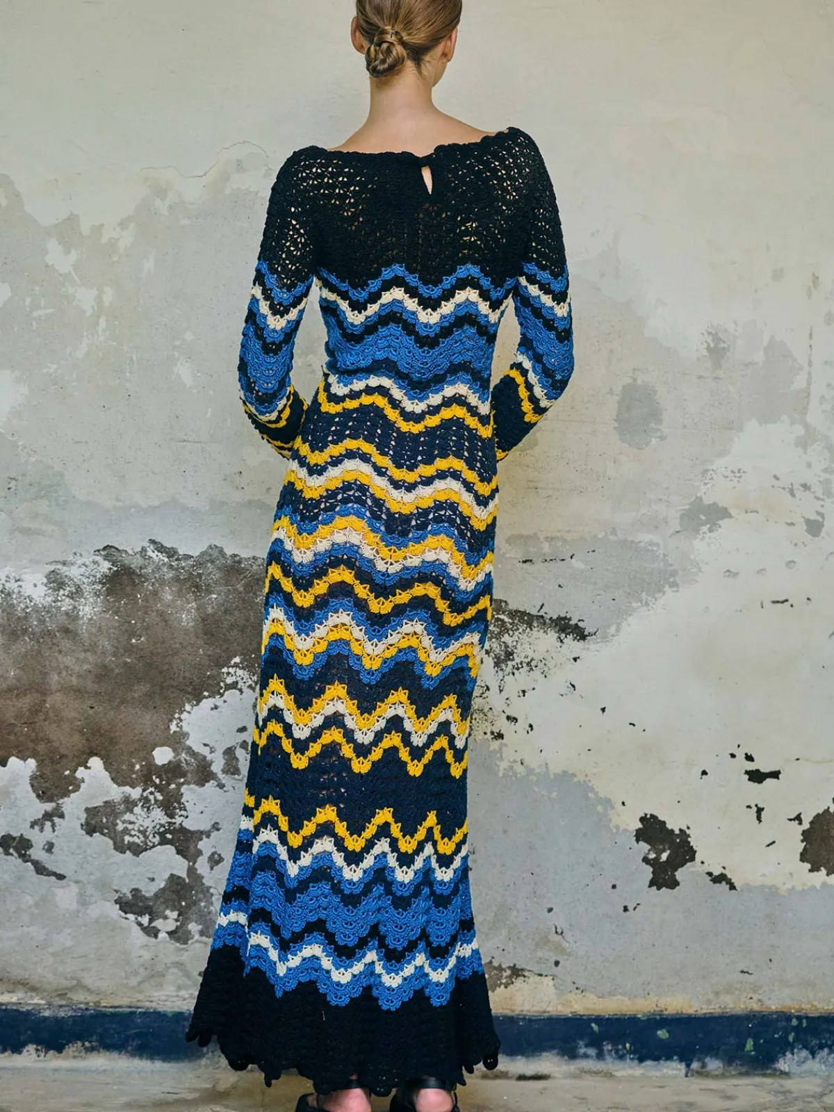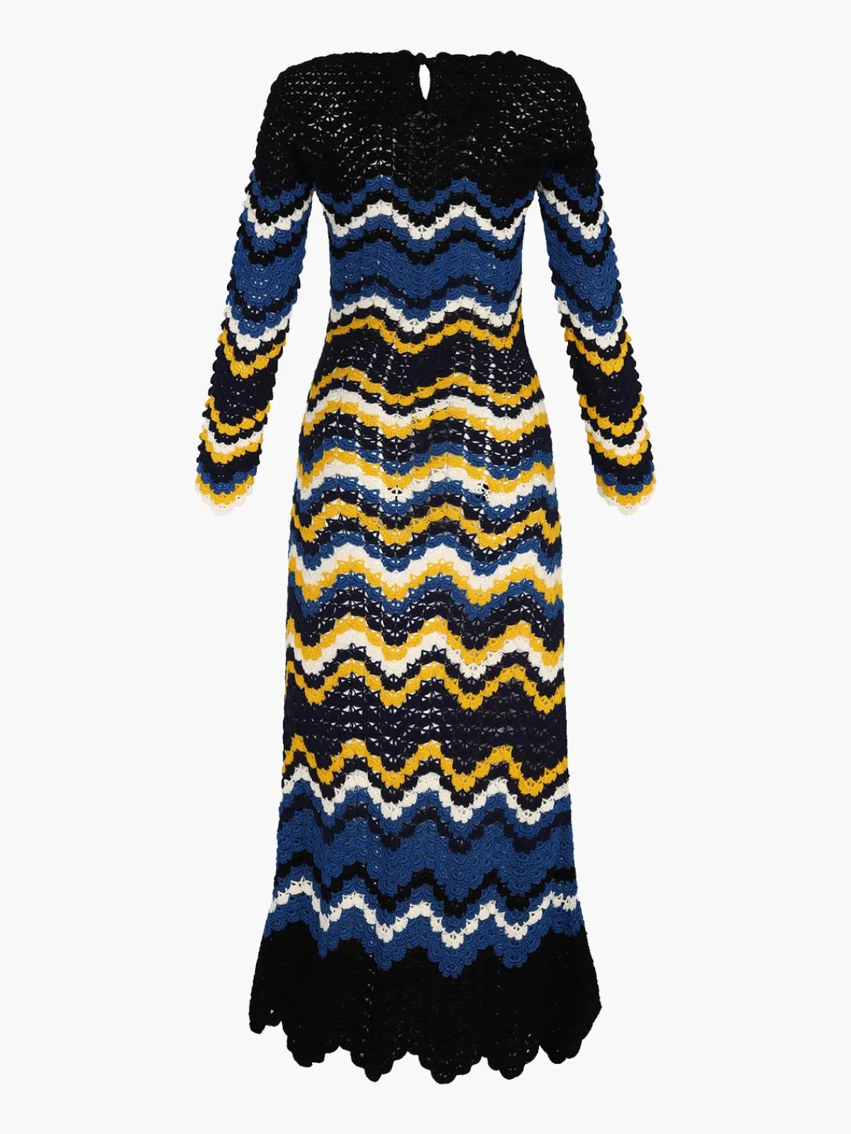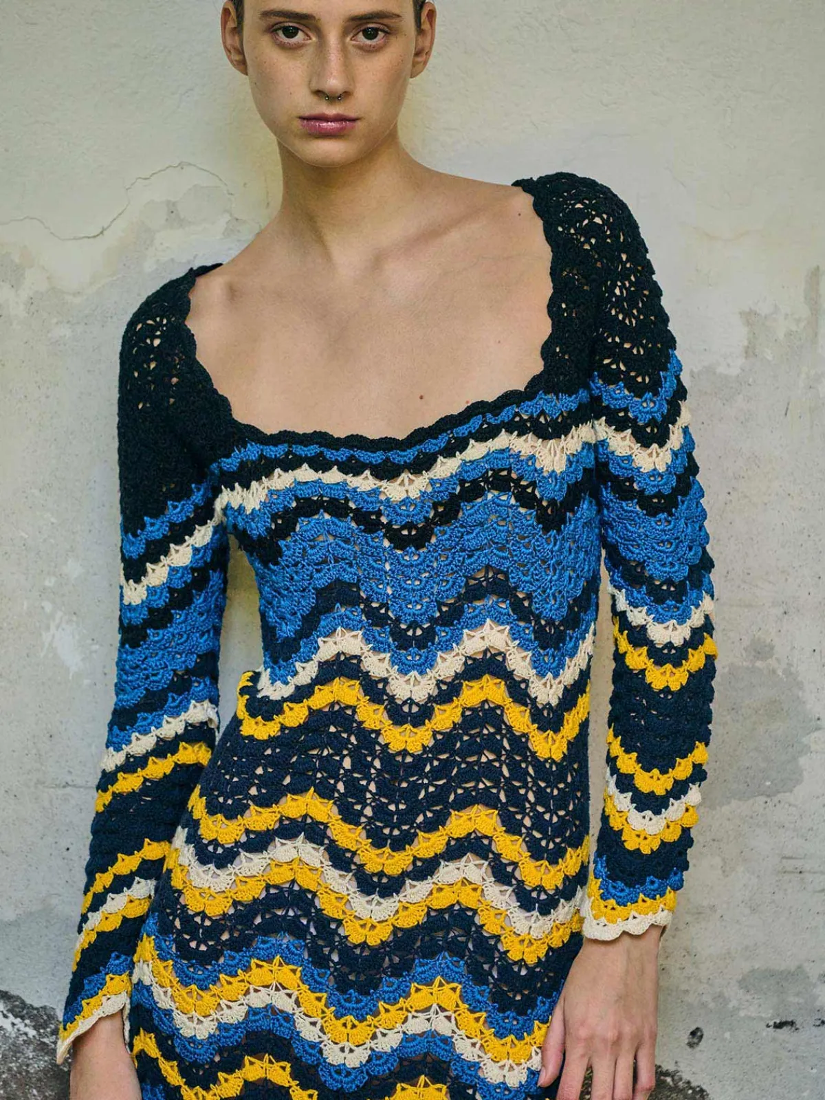 Our ESCVDO Sumac Maxi Dress is handmade out of crochet in hues of blues and a pop of yellow. The pattern is unique and the perfect summer dress. Handcrafted by Linda Chaupe and her collective Manos Monas, in Lima, Peru.