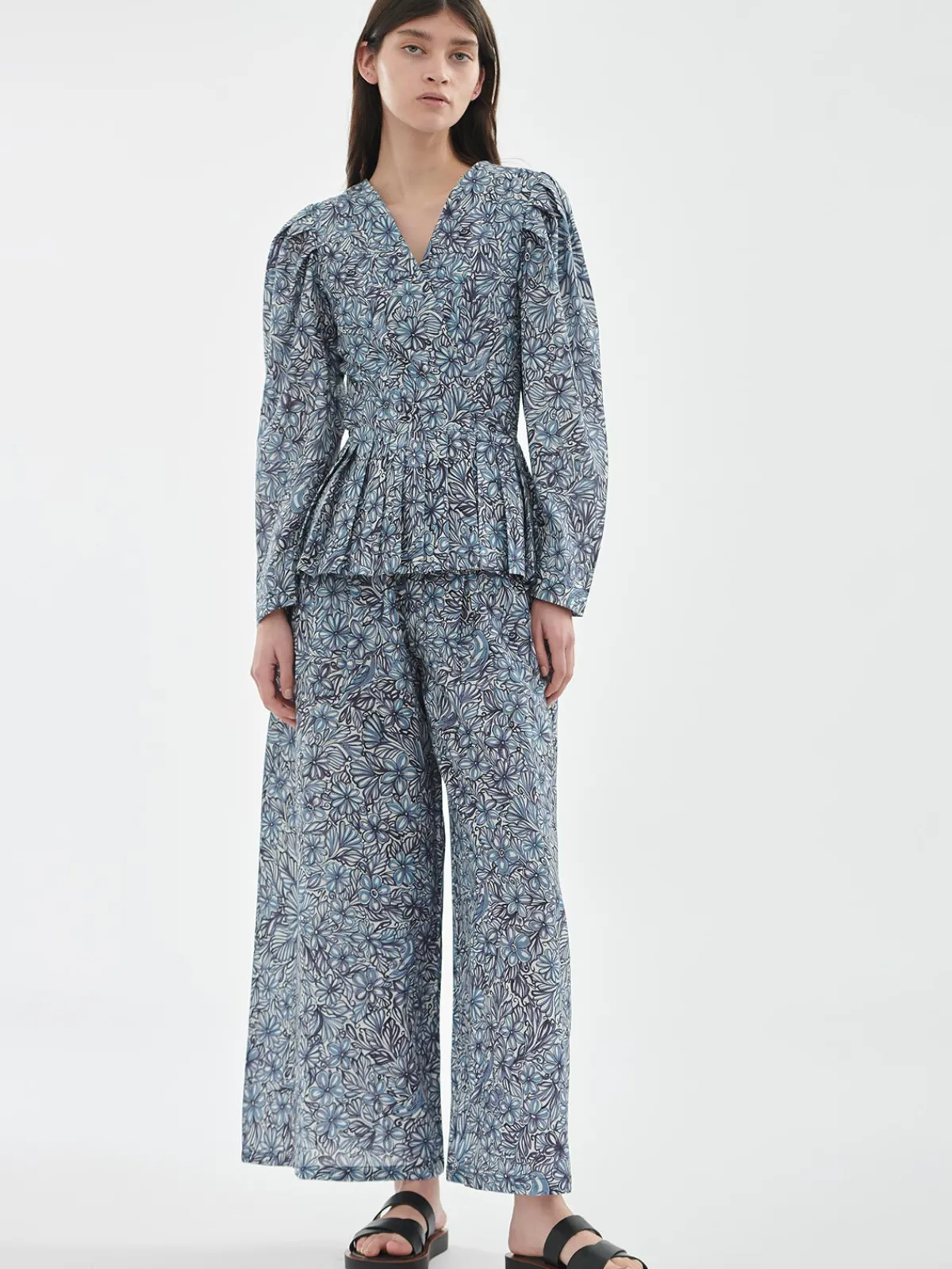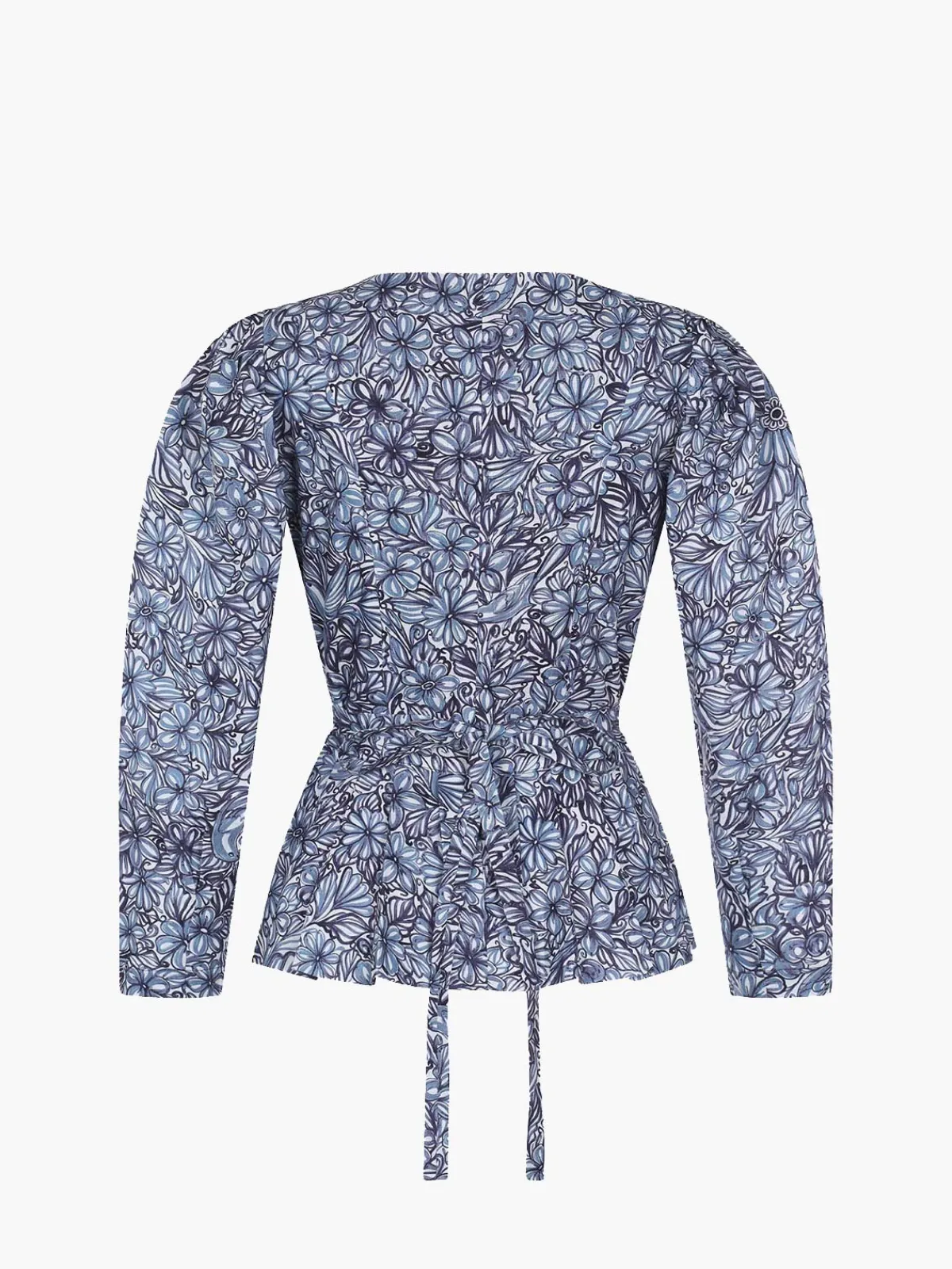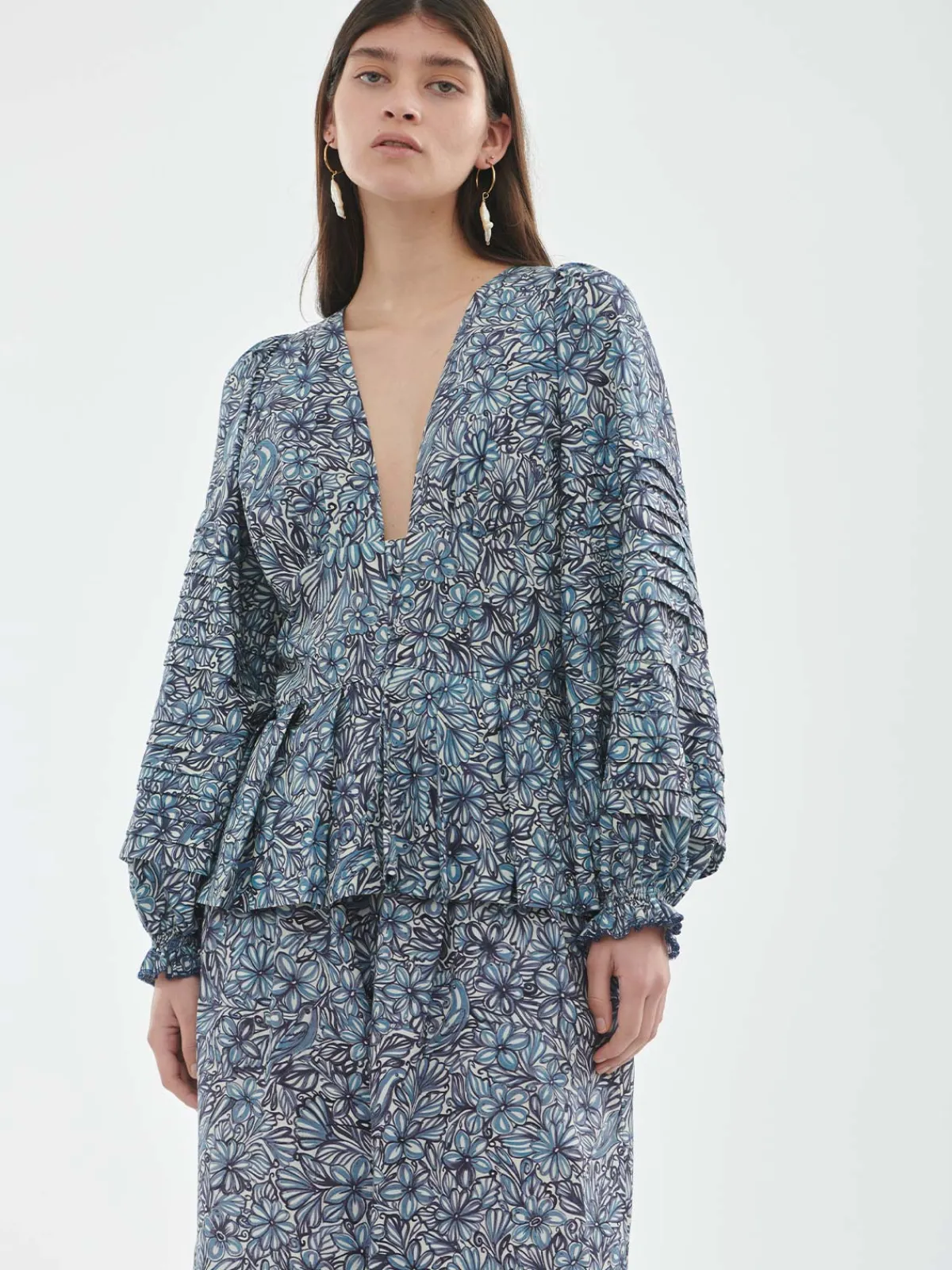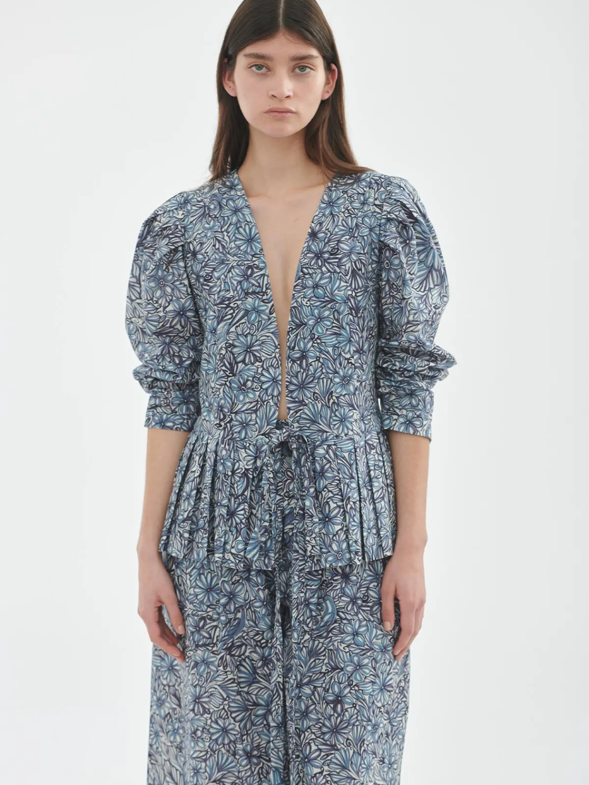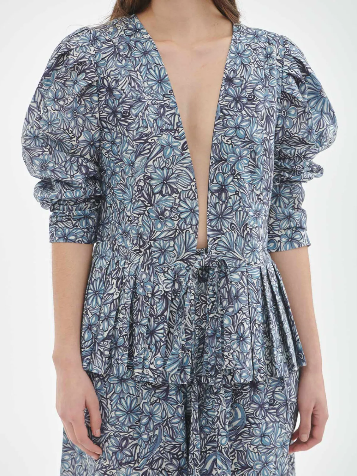 Our ESCVDO Tater Jacket in Blue Print is a fitted jacket with cowl sleeves that is fitted at the waist. Finished with pleated details. The fabric features an exclusive printed design by Peruvian artist Tater Vera, marking the first time the artist from Cuzco has collaborated in garment design. Crafted by female artisans in Peru.