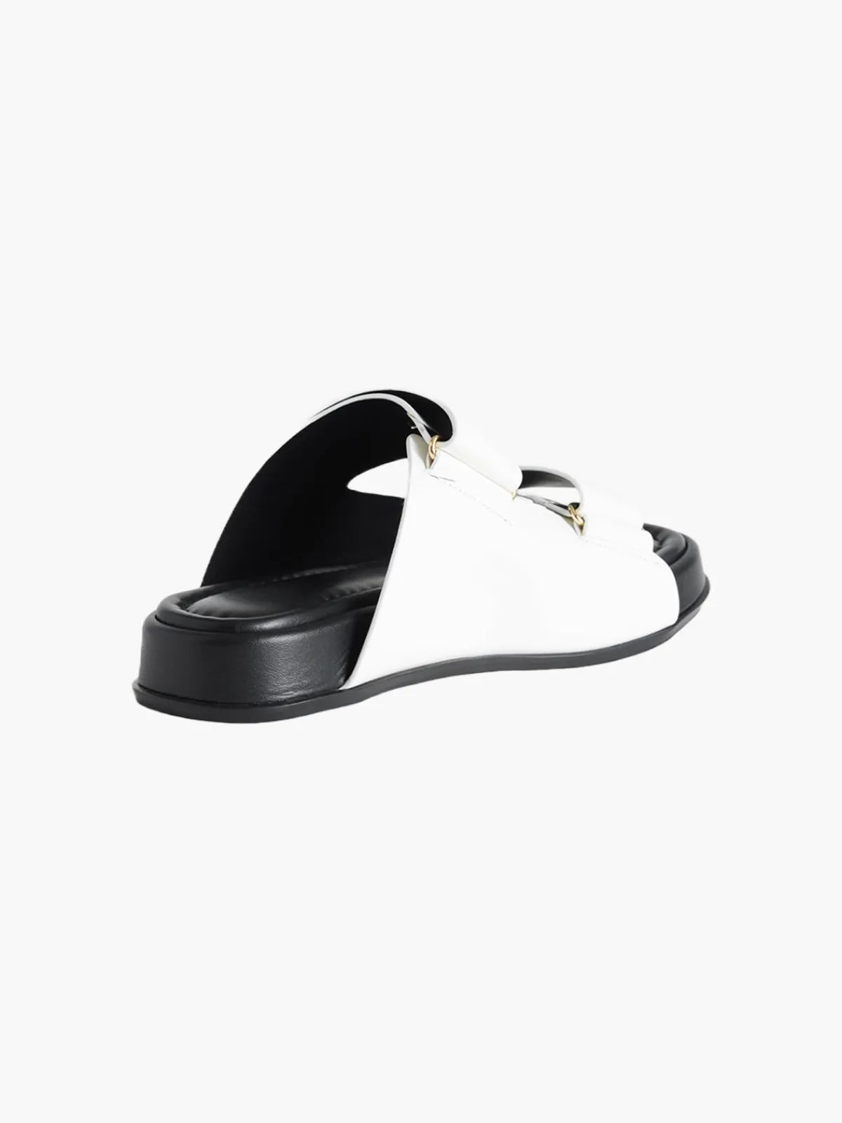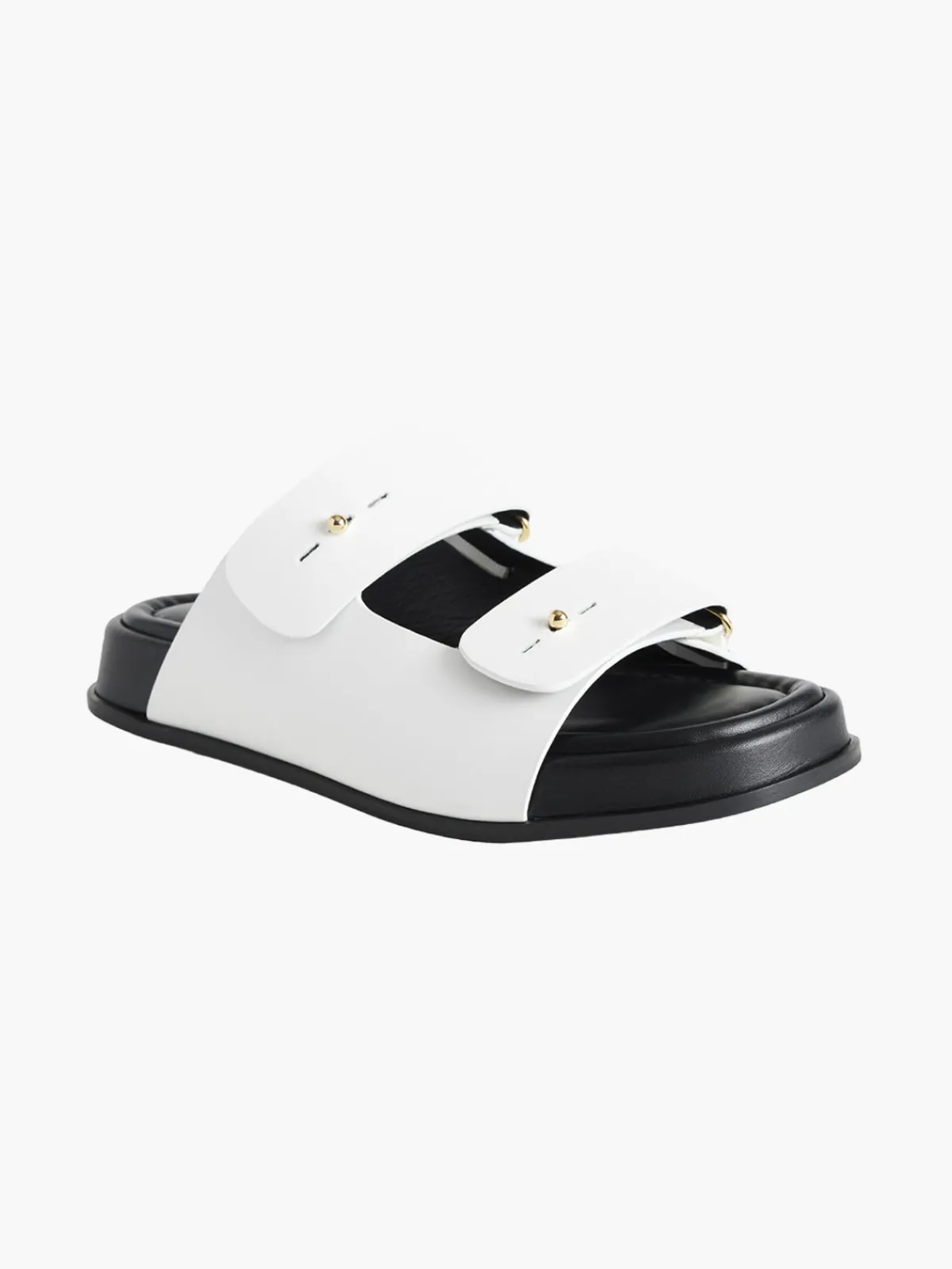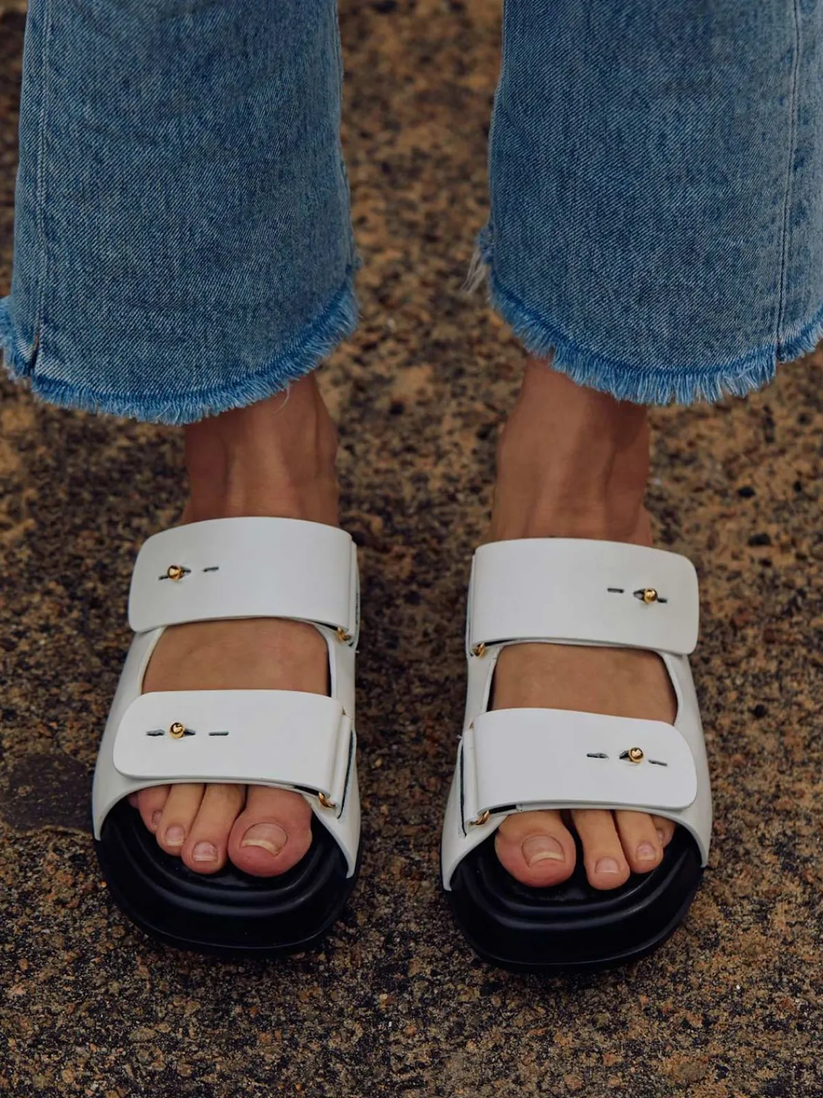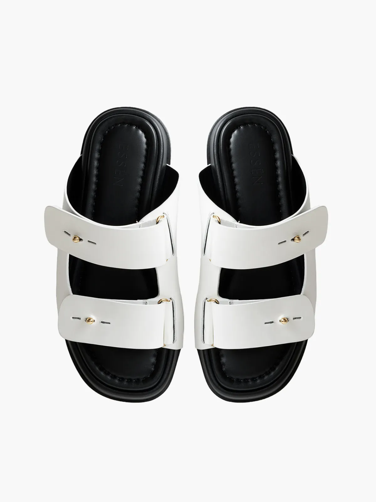 Our ESSEN The Chunky Slide in White features a slip-on design with two adjustable straps, a thick footbed with memory foam padding, and a durable rubber outsole. Handcrafted by artisans in Italy.