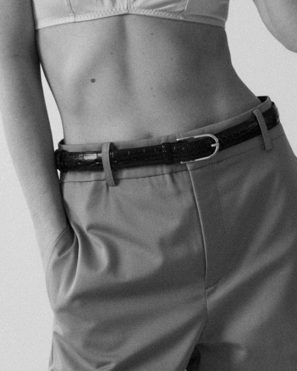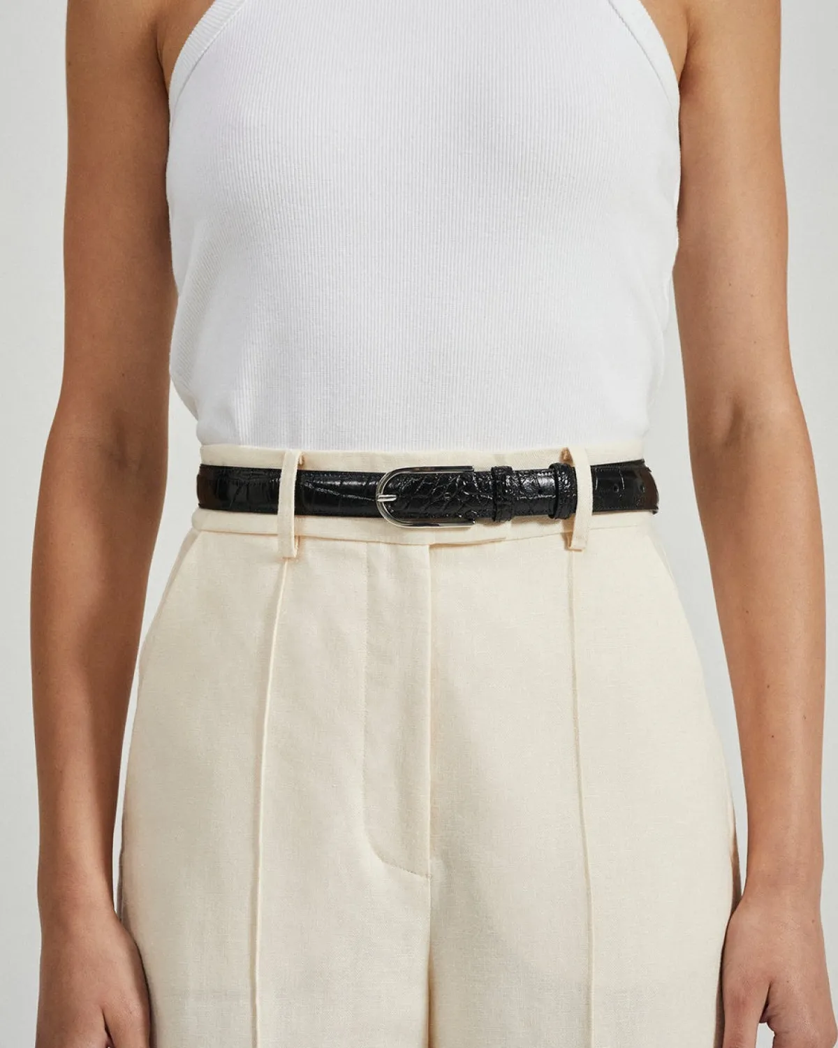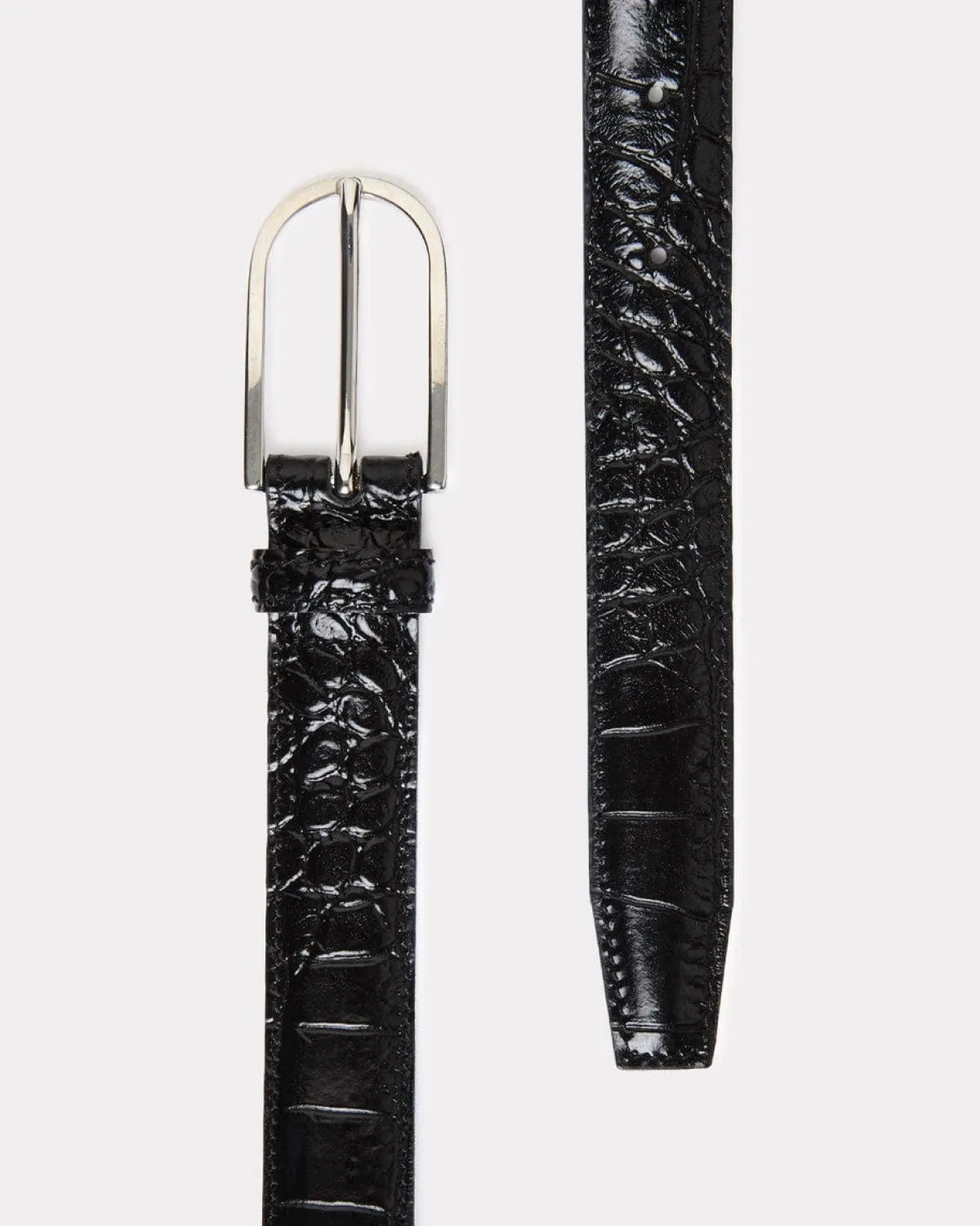 Our ESSEN The Classic Belt in Black Croc is timeless in a slender silhouette with a textured finish and a single prong metal buckle. Handcrafted by artisans in Italy.