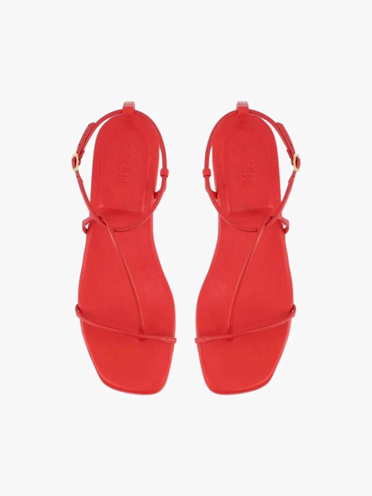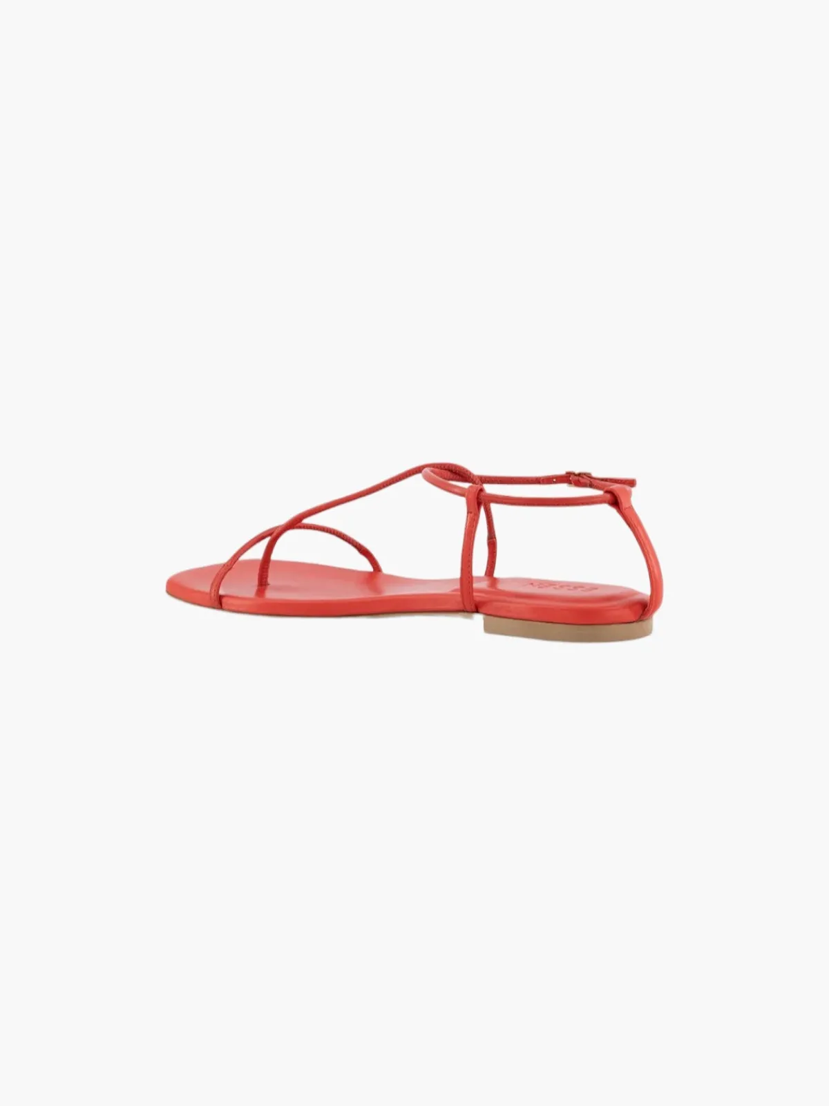 Our ESSEN TheEvening Sandal inRed features aminimalistsilhouette with barely-there slender straps and a subtle adjustable buckle closure at ankle. Finished with a flexible rubber outsole and a cushioned memory foam padding for added comfort. Handcrafted by artisans in Italy.