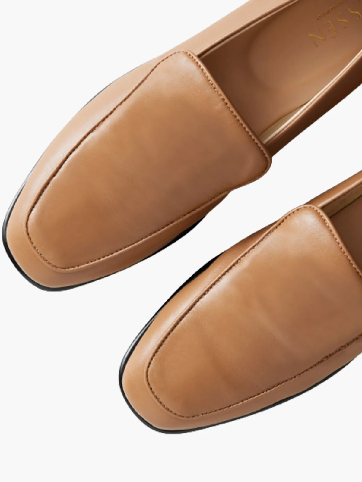 Our ESSEN The Modern Moccasin in Tan is a slip-on shoe with a timeless style. Featuring a subtle square toe, graceful lines, and a memory foam sole for added comfort. Handcrafted by artisans in Italy.