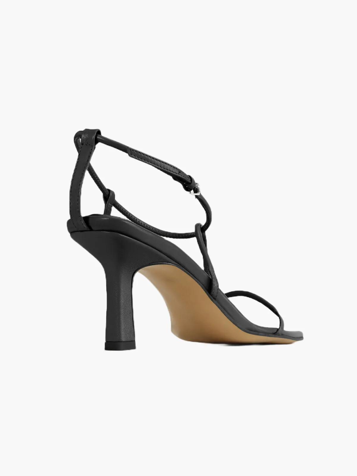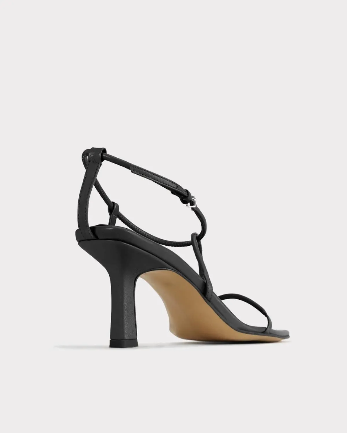 Our ESSEN The Strappy Sandal in Black features a slender heel, slender straps, and an ankle strap with an adjustable buckle closure. Finished with a flexible rubber outsole and a cushioned memory foam padding for added comfort. Handcrafted by artisans in Italy.