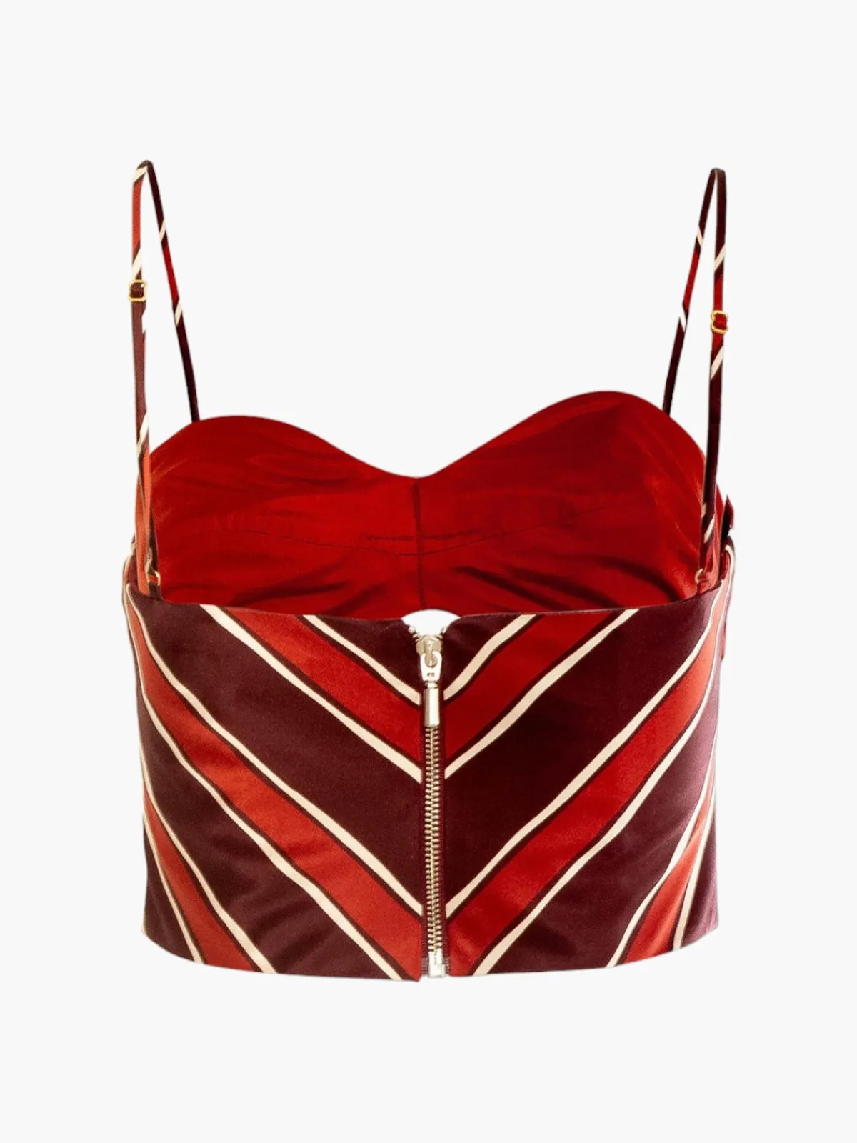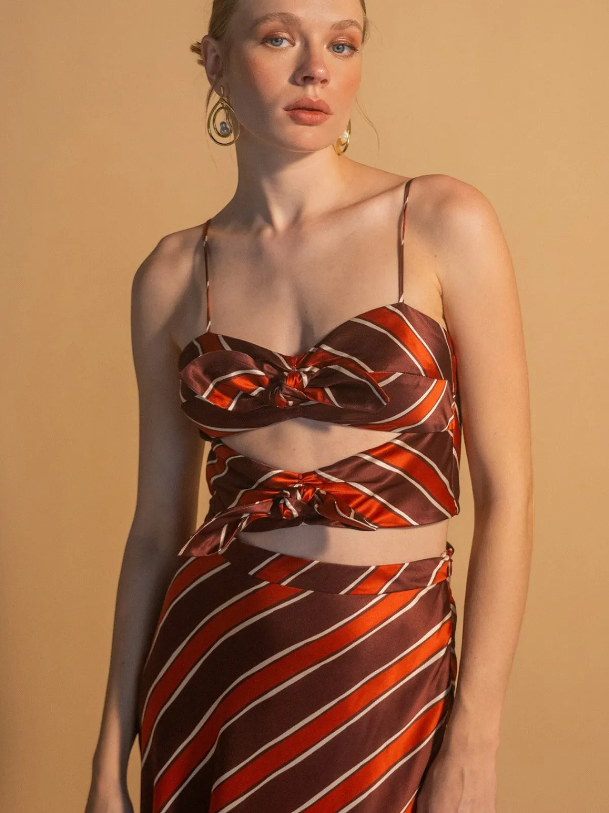 Our EstefaniaAcapulco Top is a garment made of silk with a striped pattern, and two knots at the front. Handcrafted in Colombia by female heads of households.