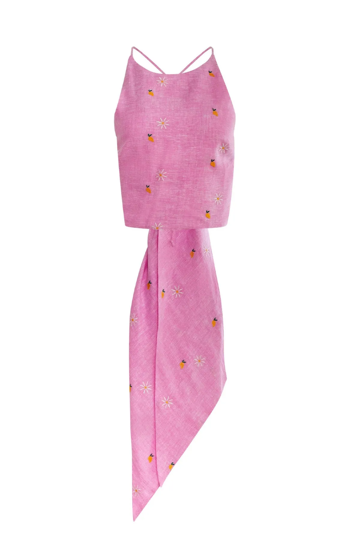 The subtle bow ties at the back of our embroidered linen Gardenia top reflect the relaxed and feminine aesthetic that defines our collection. This style represents just the right amount of sophistication and ease. The top is the perfect match for our Vela skirt with the same embroidery and a pair of strappy sandals heels.
