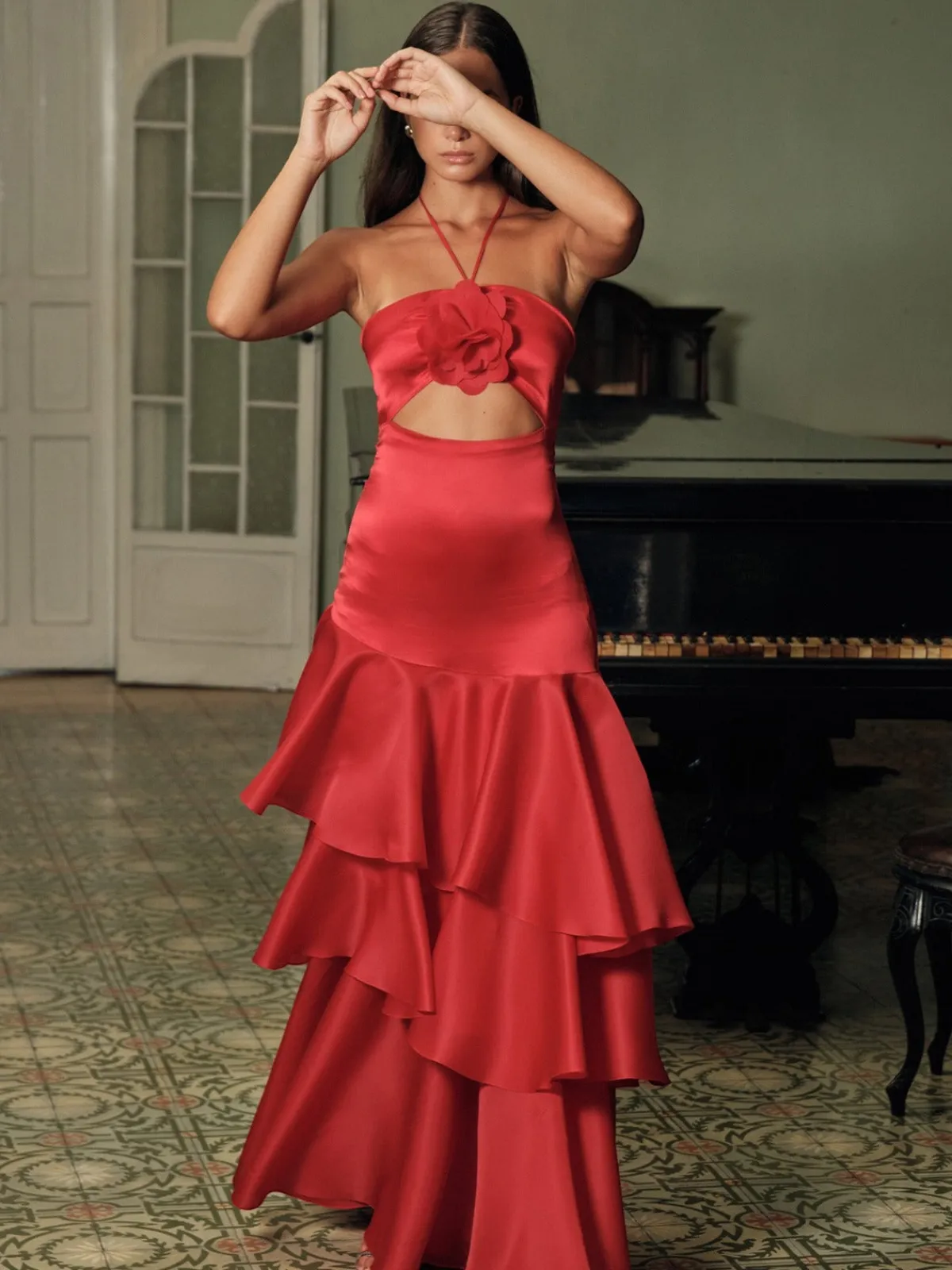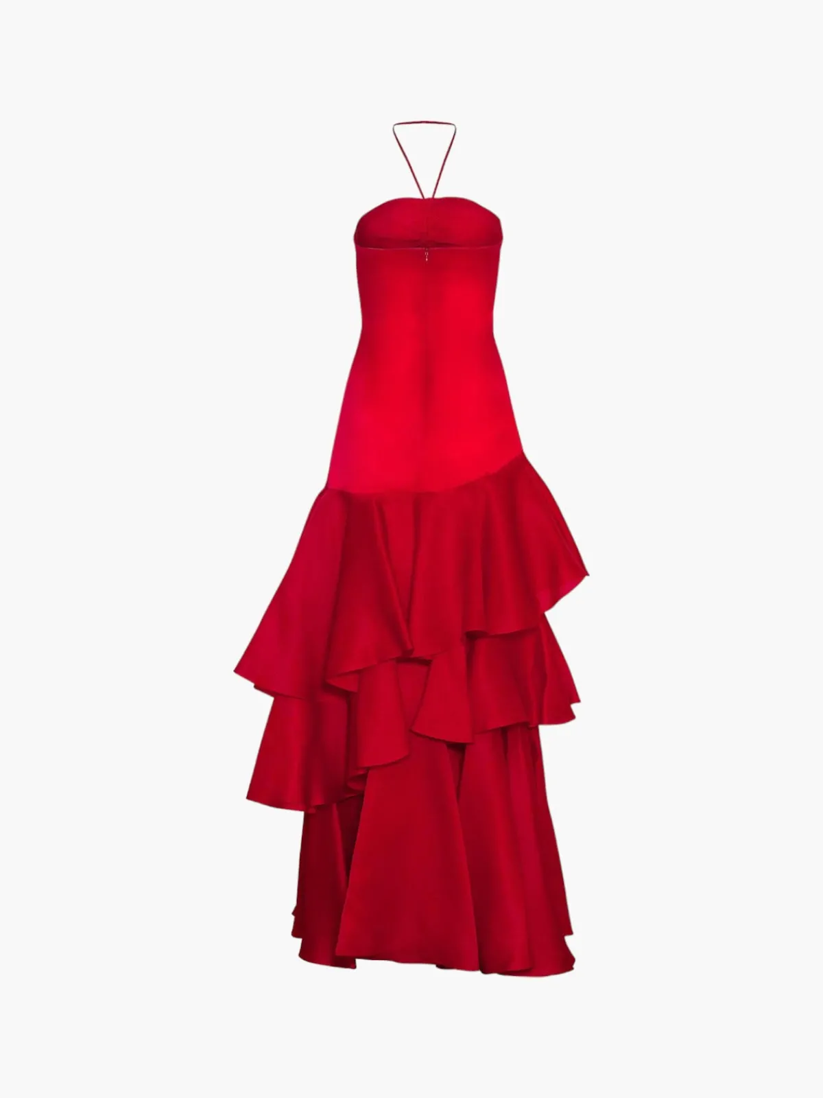 Our Estefania La RosaGown in Red is perfect for any formal event.The dress is maxi length with a ruffle skirt and cut out. The dress also has a flower accessory at the front with a halter neckline.Handcrafted in Colombia by female heads of households.
