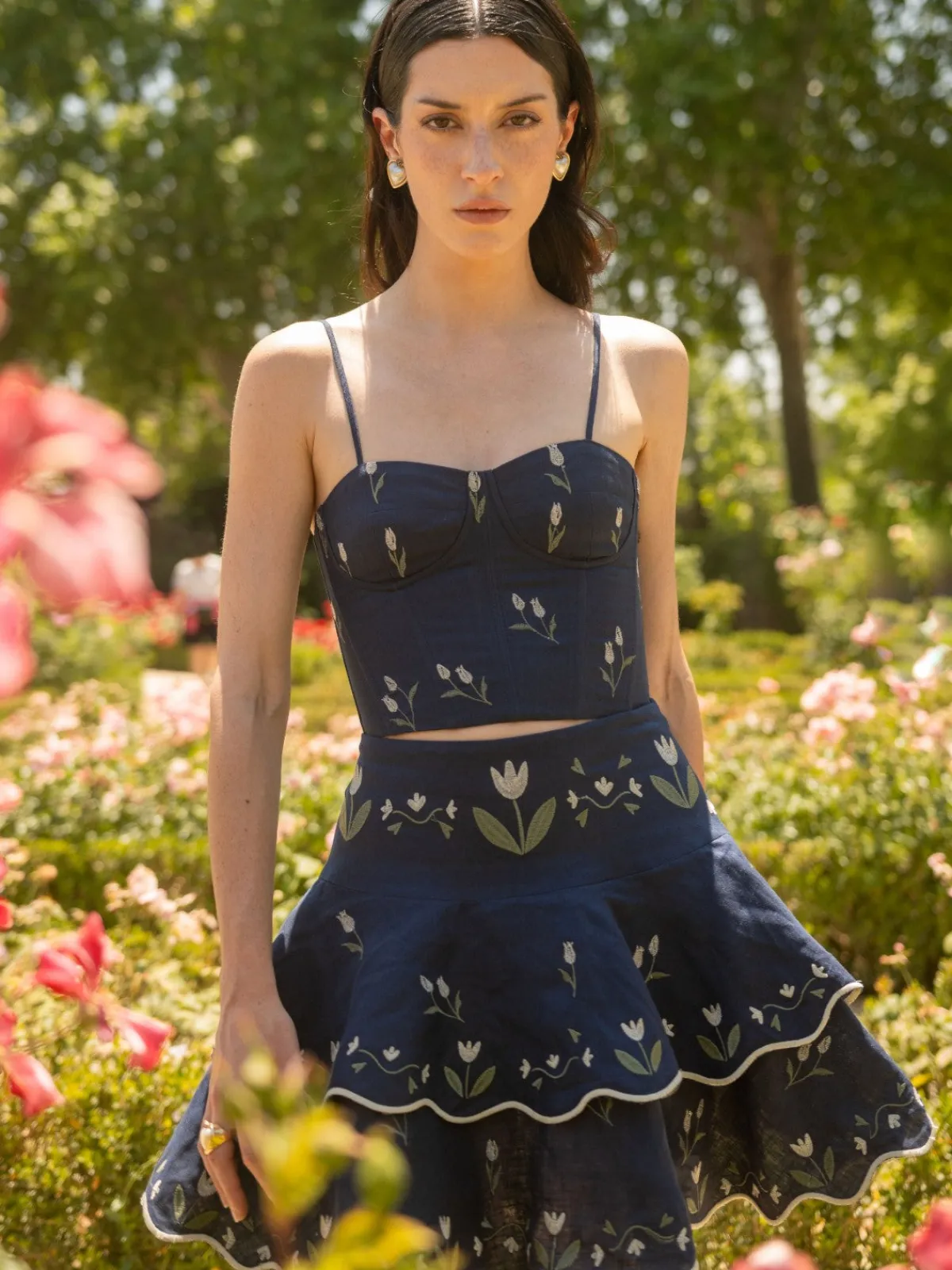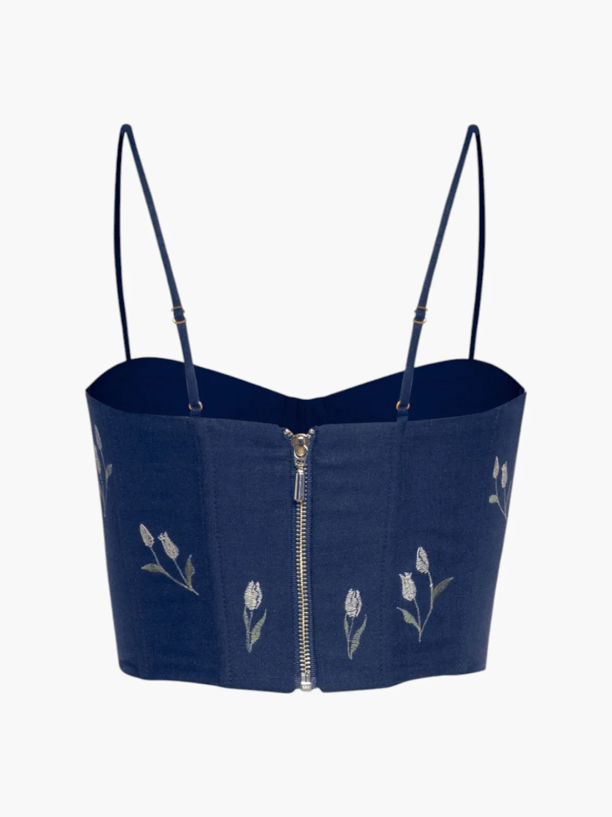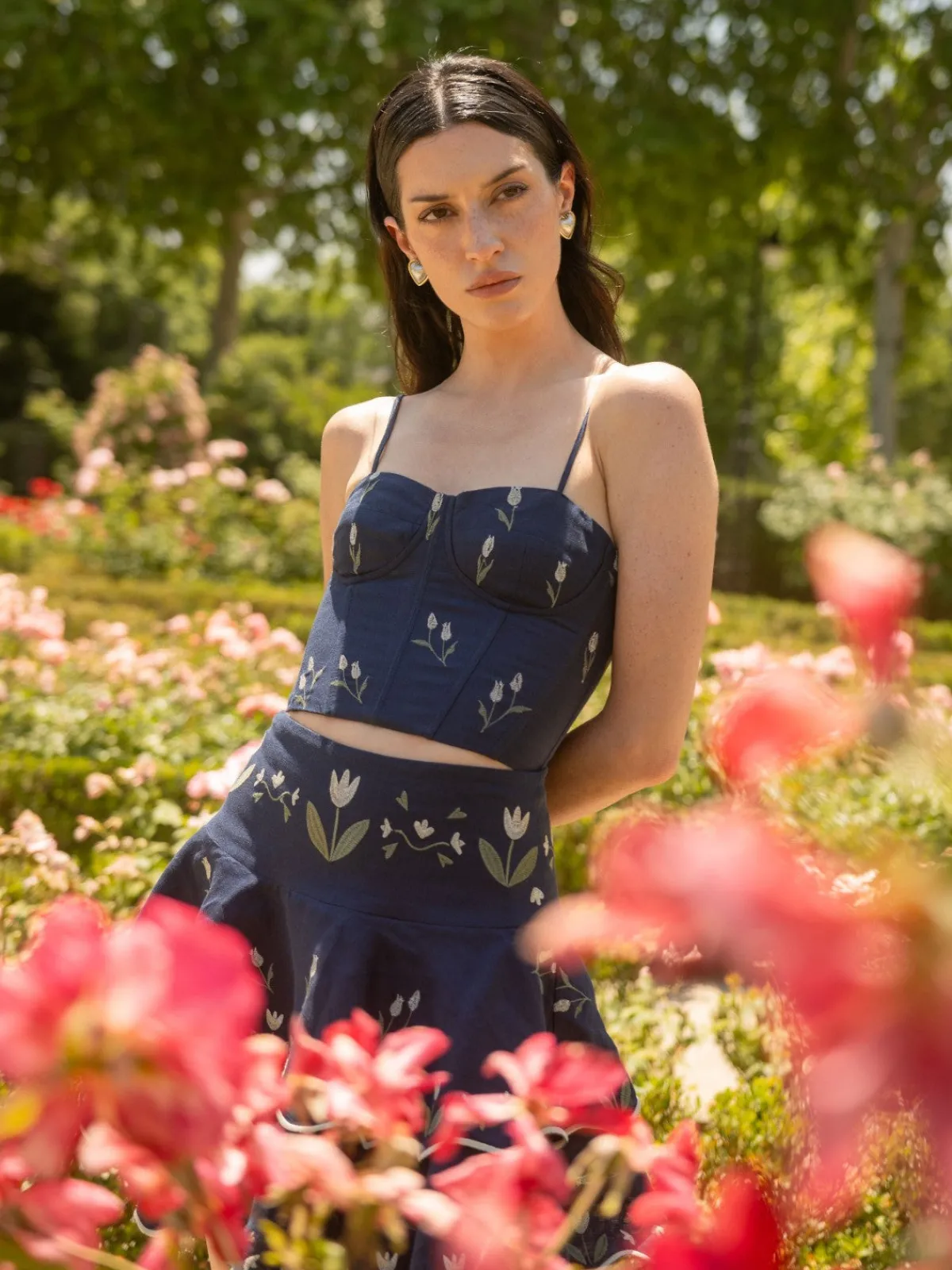 Our Estefania Lovely Tulip Corset in Navy is a corset top featuring embroidered tulips and a sweetheart neckline. The top has thin straps and a zipper in the back. Handcrafted in Colombia by female heads of households.