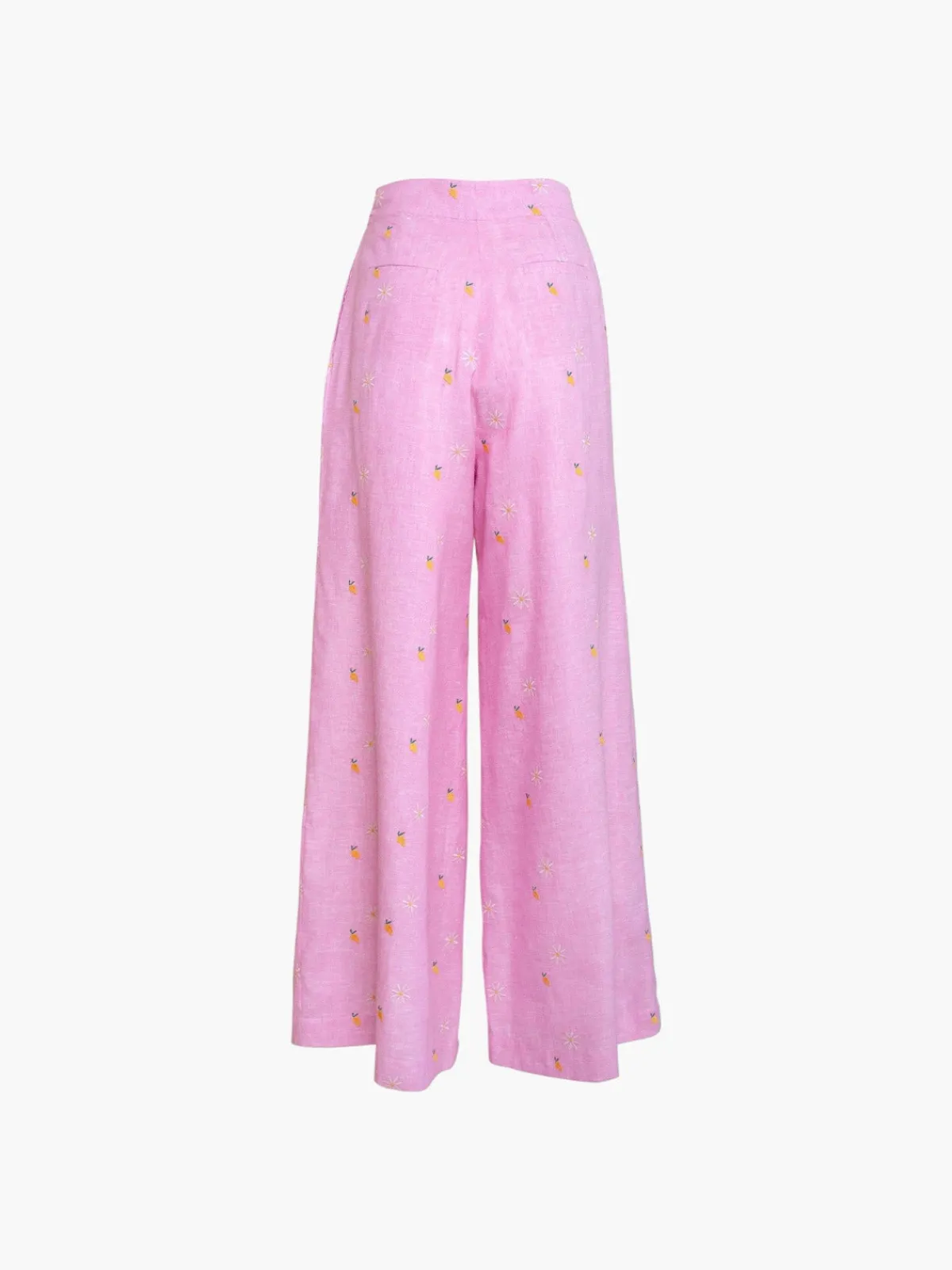 Our Estefania Mango Linen Pant in Pink featuresembroidered flowers and mangoes and has a flattering high-waist cut and wide-leg bottom to create a wide boot effect.Handcrafted in Colombia by female heads of households.
