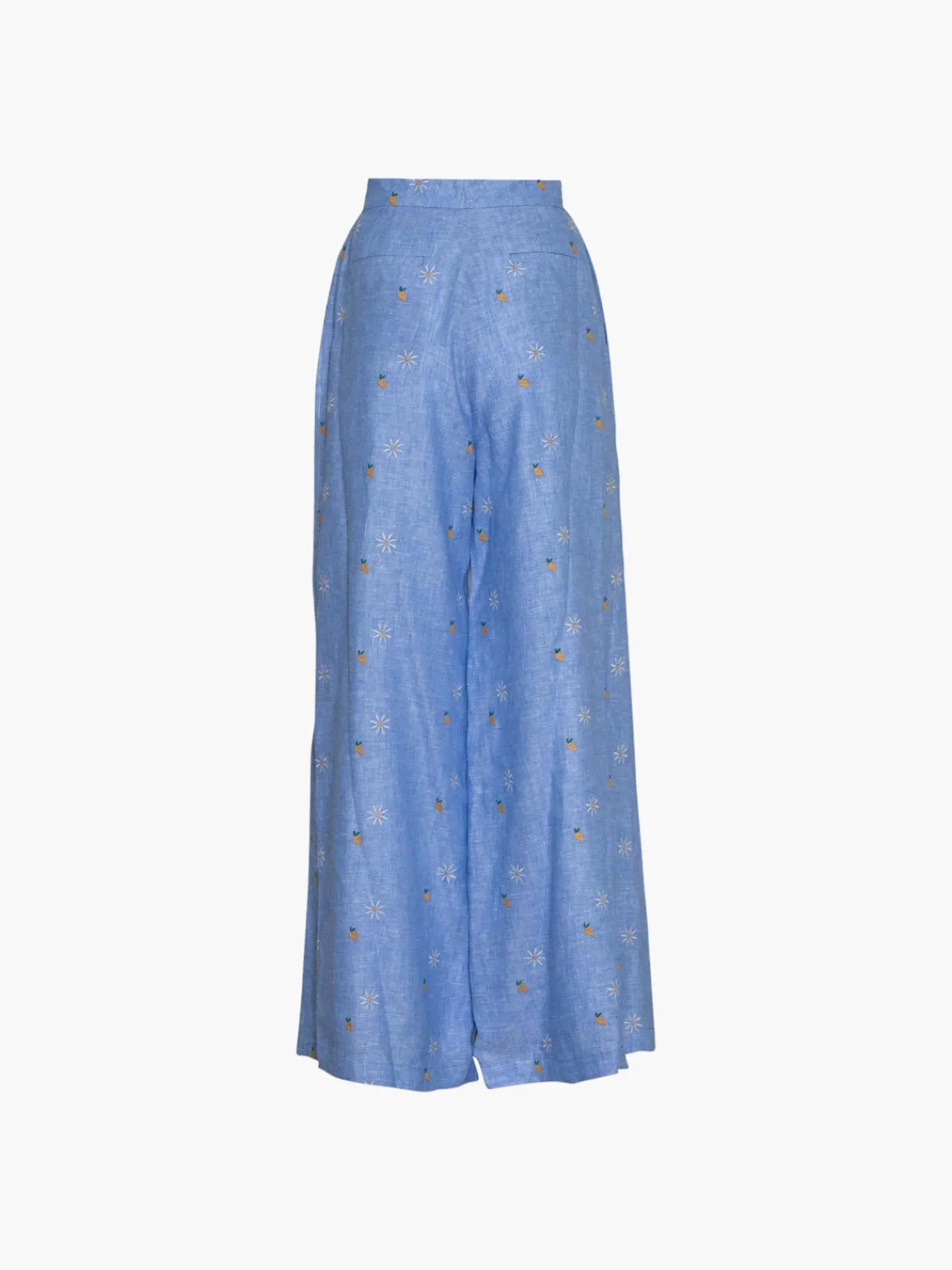 Our Estefania Mango Linen Pant inBlue featuresembroidered flowers and mangoes and has a flattering high-waist cut and wide-leg bottom to create a wide boot effect. Handcrafted in Colombia by female heads of households.