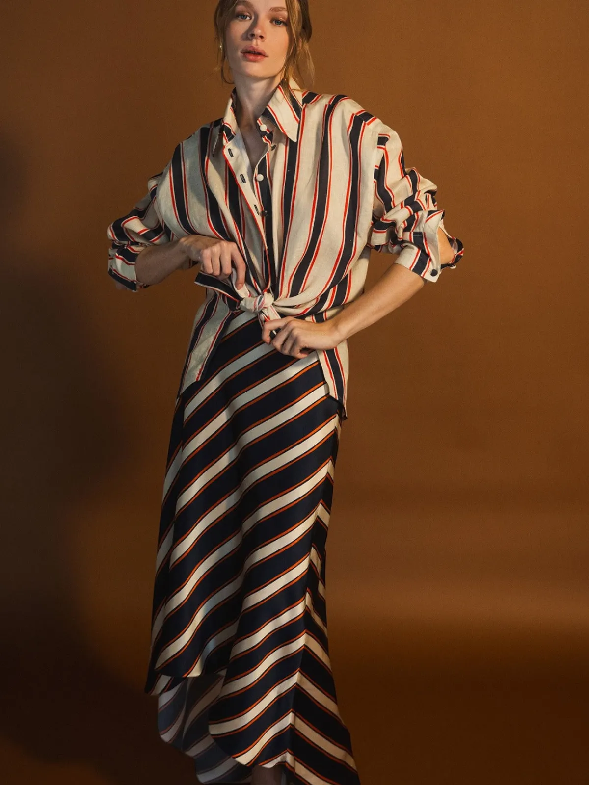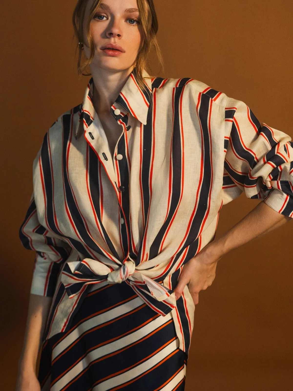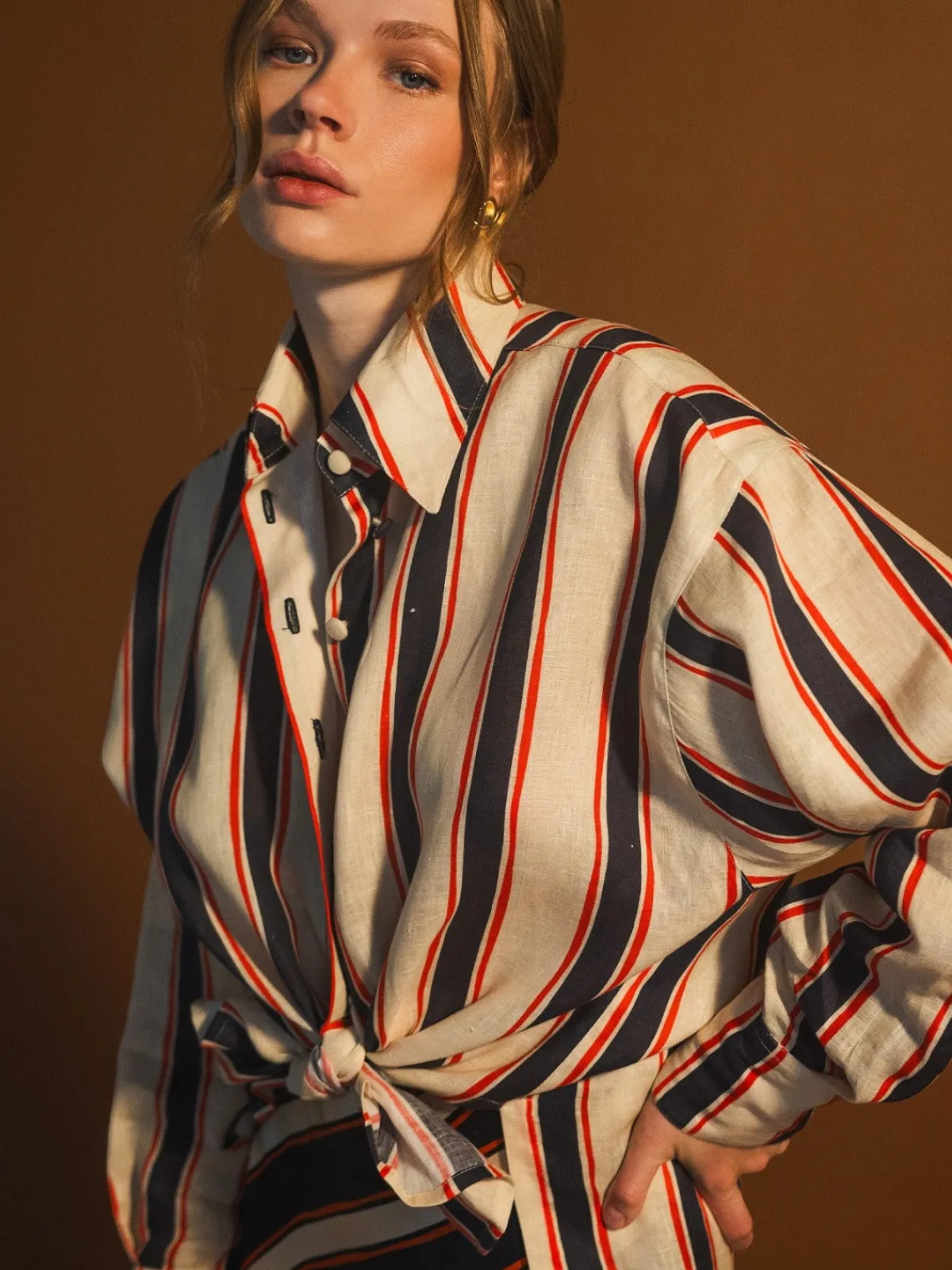 Our Estefania Marine Stripe Blouse in Caviar Midnightis a button down blouse with a stripe pattern.Handcrafted in Colombia by female heads of households.