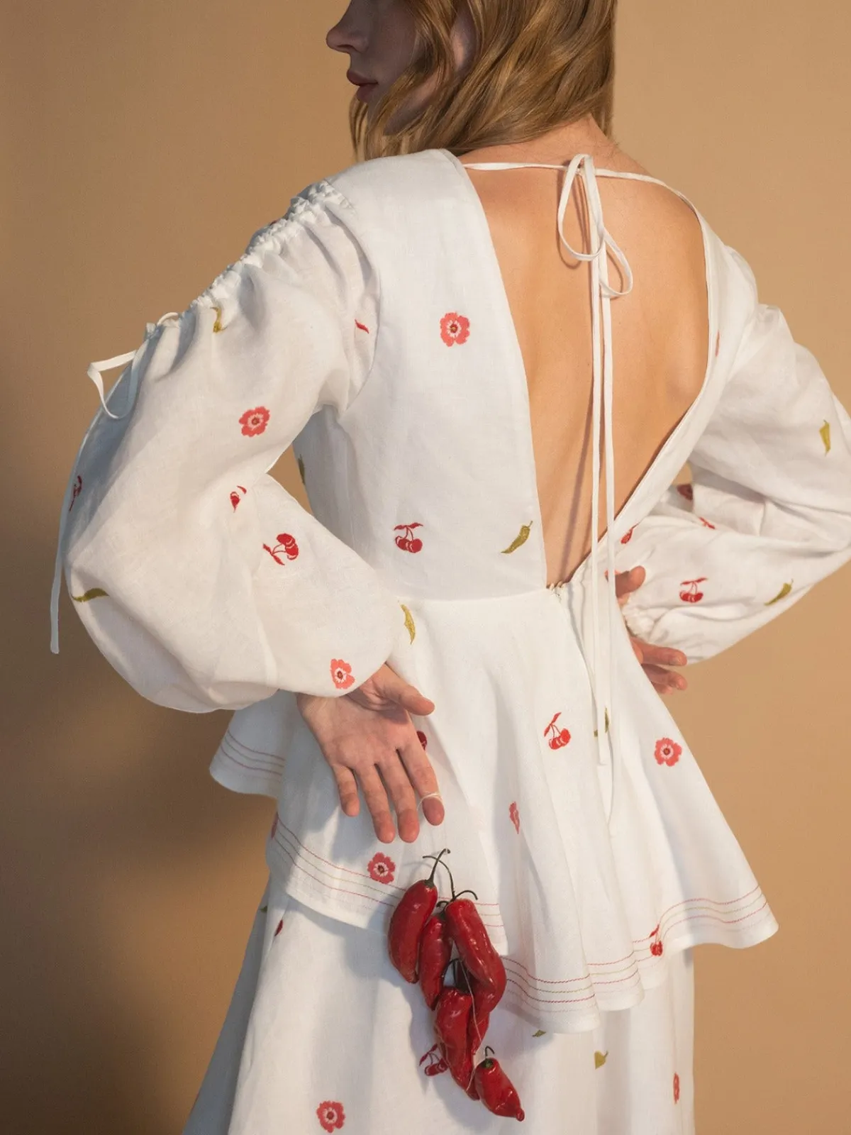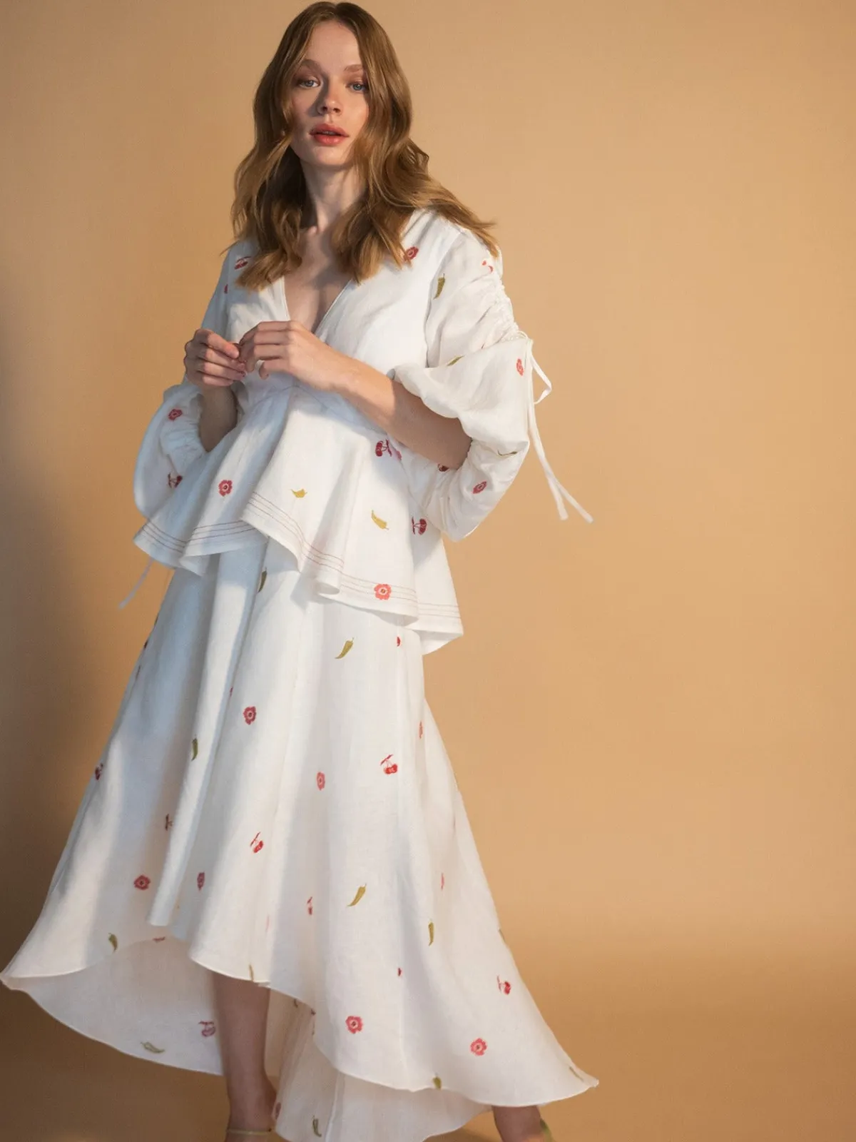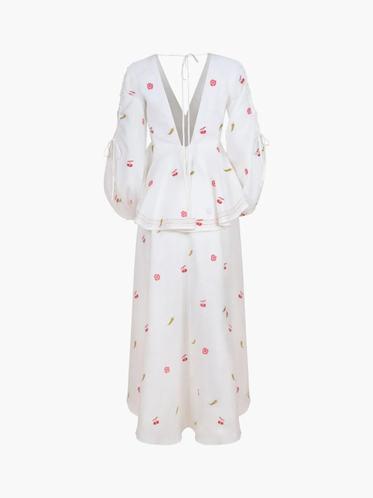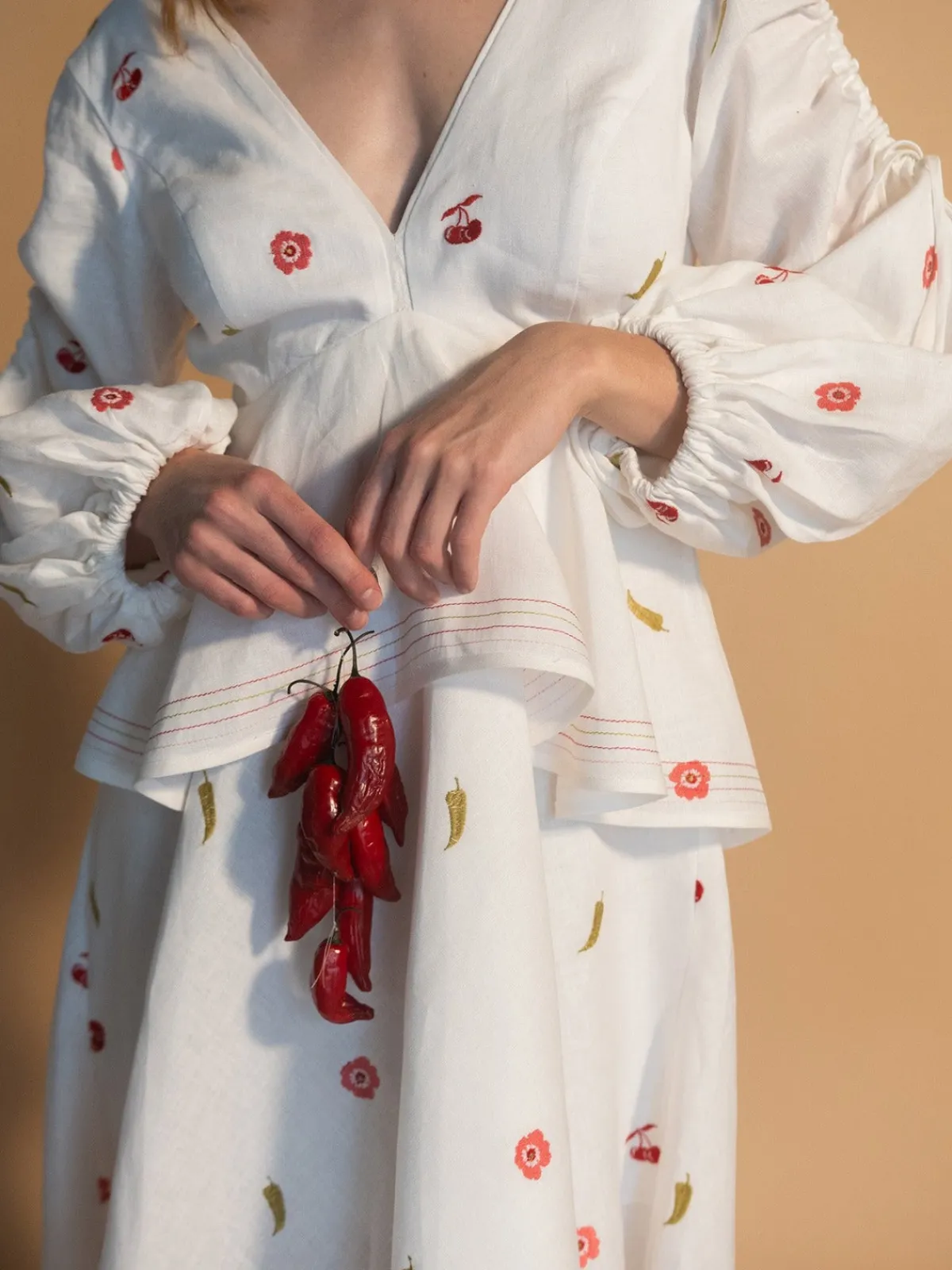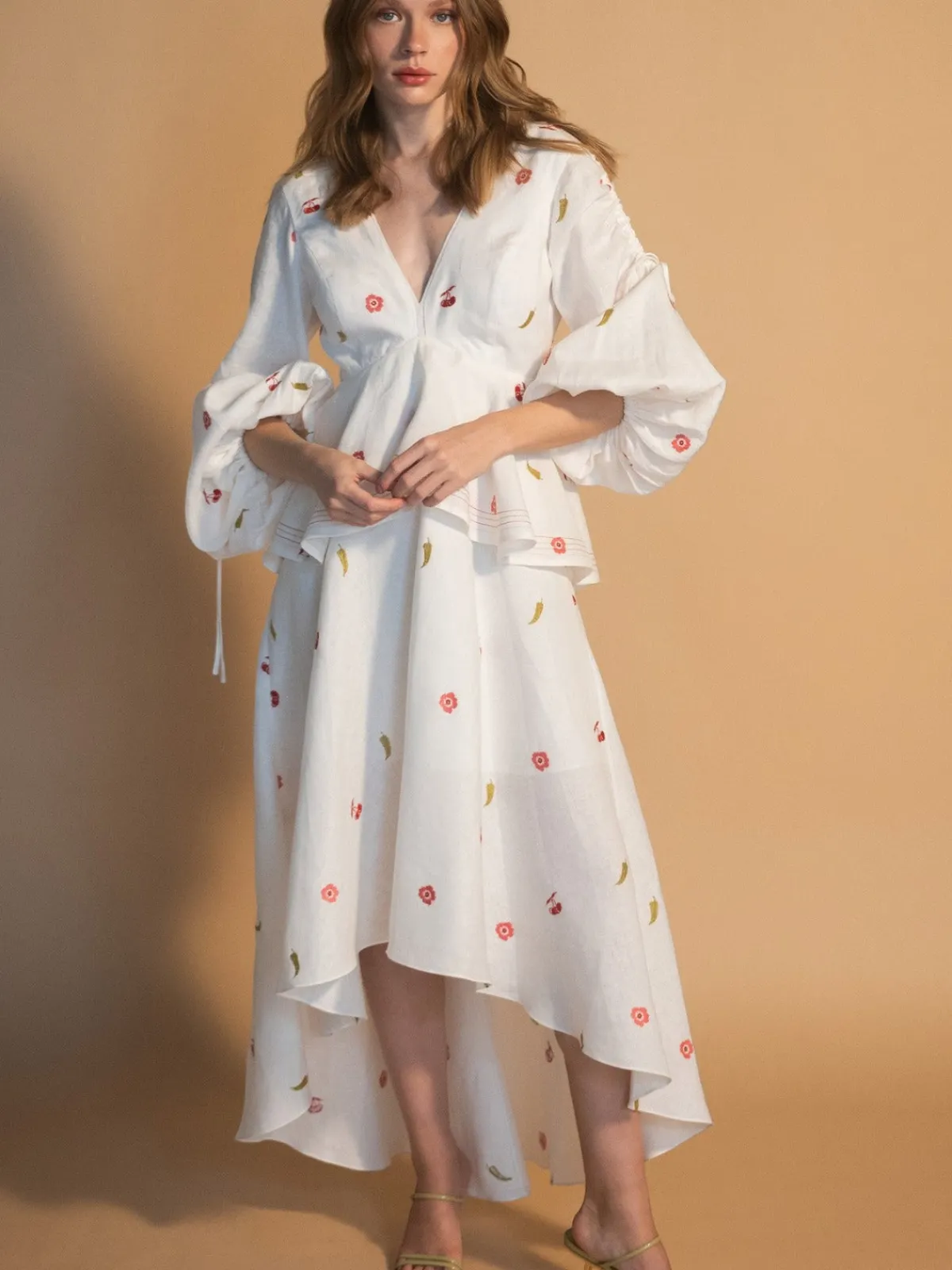 Our Estefania Ola Dress inCherry Picante is an embroidered mid-length dressthat is detailed with delicate bias tape that enhances the neckline and a peplum that falls into a high-low hem, finished with gathered three-quarter bell sleeves.Handcrafted in Colombia by female heads of households.