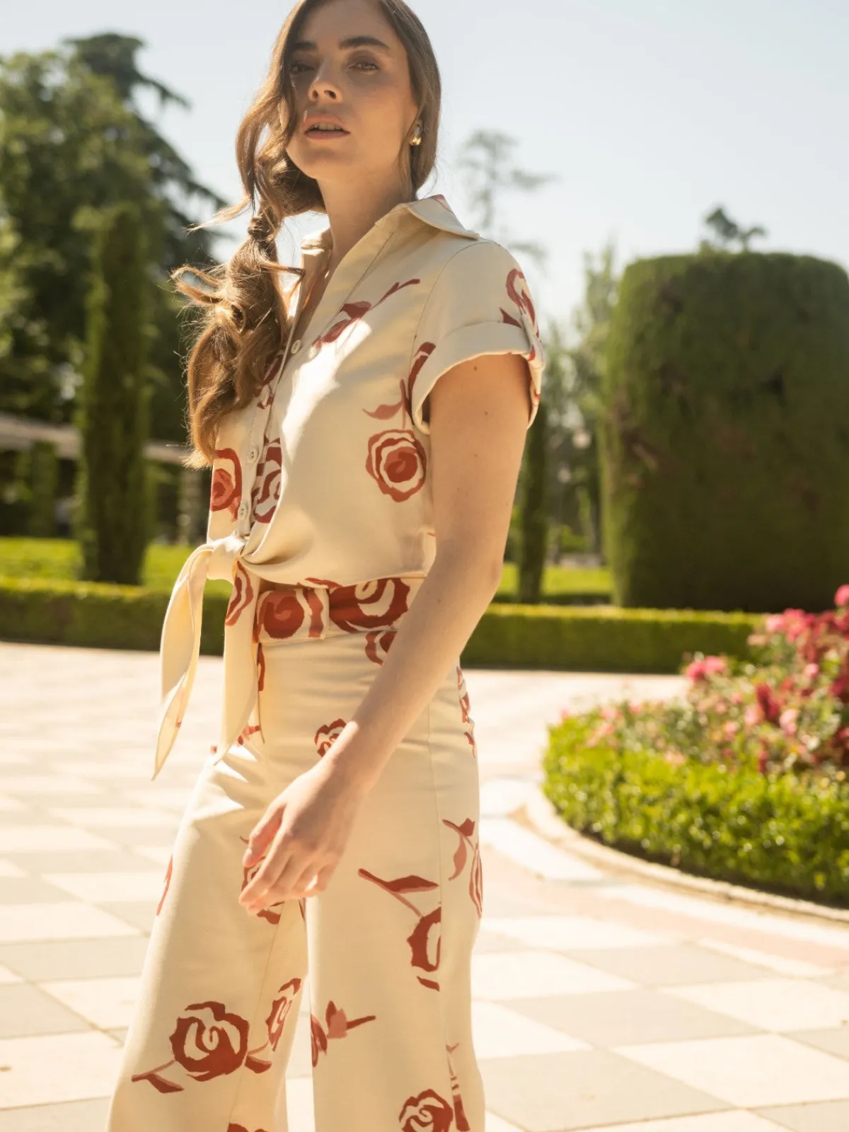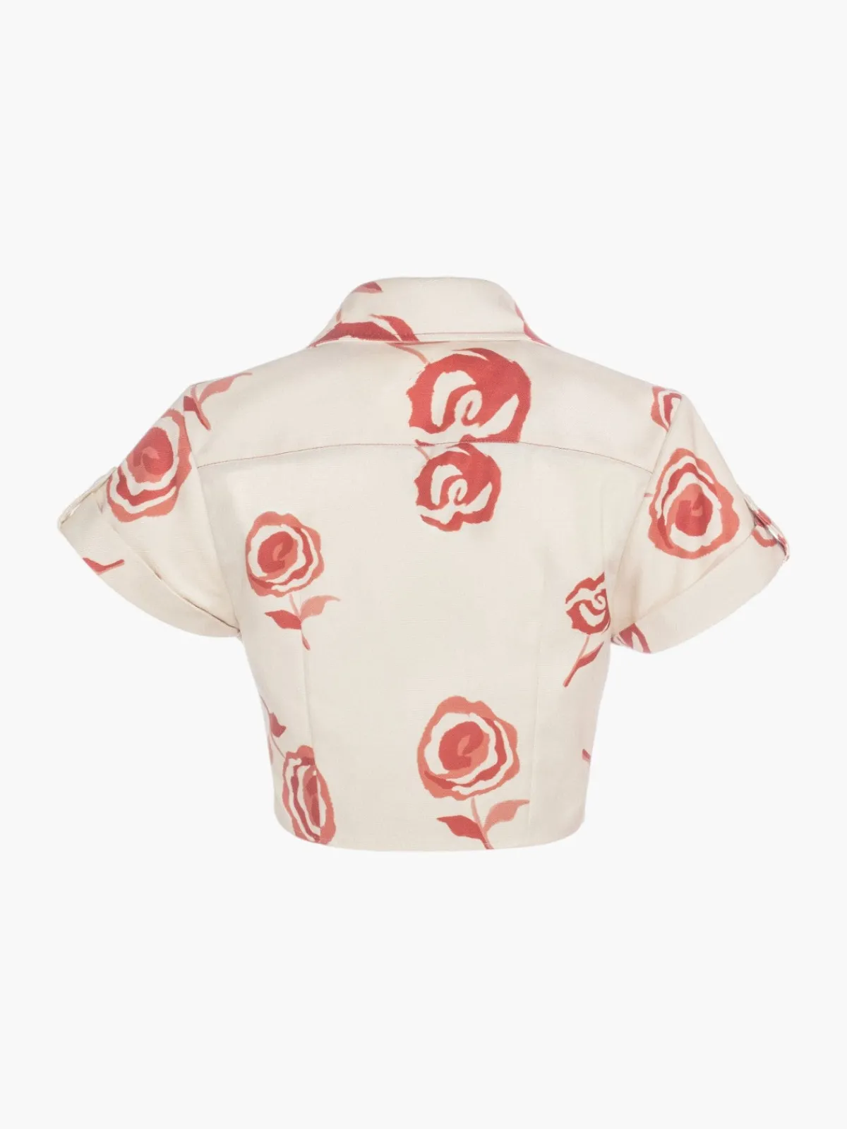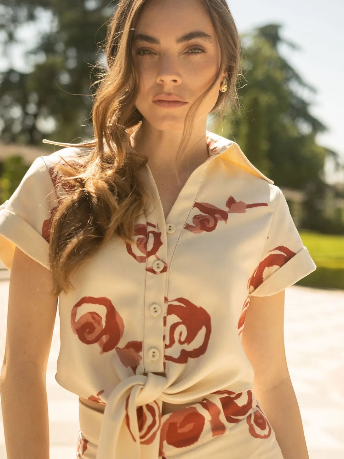 Our Estefania Rosetta Blouse in Red is a short sleeve blouse with front buttons, a collar, and front tie. The top is made from printed mikado. Handcrafted in Colombia by female heads of households.