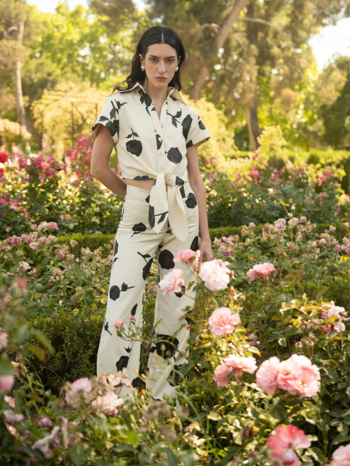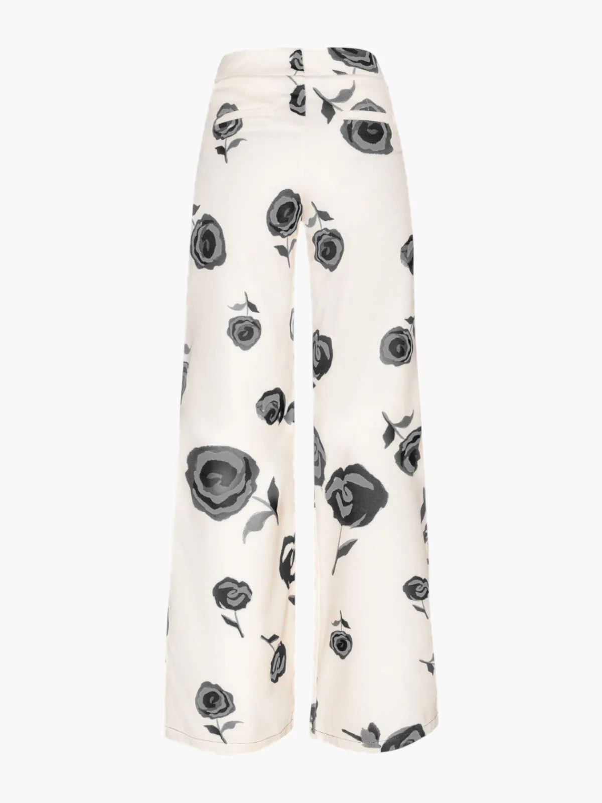 Our Estefania Rosetta Pant in Black is a wide leg pant in a red rose print. The pants are high waisted with a front zipper and 2 back pockets. Handcrafted in Colombia by female heads of households.
