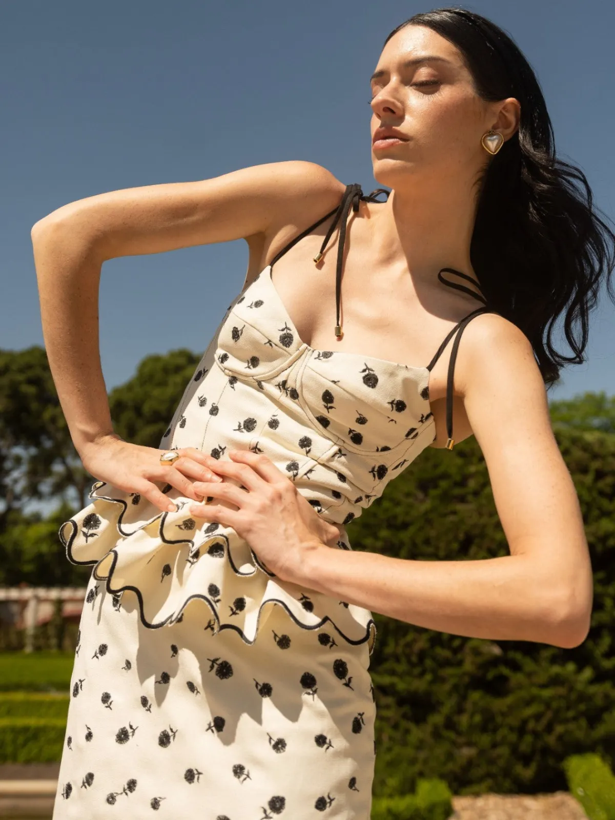 Our Estefania Rosita Peplum Top in Ivory Black captures the romantic essence and signature style of our brand with effortless grace. Exquisitely crafted from ivory cotton drill, it is adorned with delicate white rose embroidery and finished with two layers of intricately embroidered hems. Striking the perfect balance between sophistication and romance, this elegant piece exudes a modern yet timeless allure, making it a quintessential addition to any refined wardrobe. <span data-sheets-userformat='{"2":14845,"3":{"1":0,"3":1},"5":{"1":[{"1":2,"2":0,"5":{"1":2,"2":0}},{"1":0,"2":0,"3":3},{"1":1,"2":0,"4":1}]},"6":{"1":[{"1":2,"2":0,"5":{"1":2,"2":0}},{"1":0,"2":0,"3":3},{"1":1,"2":0,"4":1}]},"7":{"1":[{"1":2,"2":0,"5":{"1":2,"2":0}},{"1":0,"2":0,"3":3},{"1":1,"2":0,"4":1}]},"8":{"1":[{"1":2,"2":0,"5":{"1":2,"2":0}},{"1":0,"2":0,"3":3},{"1":1,"2":0,"4":1}]},"9":0,"10":1,"11":4,"14":{"1":3,"3":1},"15":"Arial","16":12}' data-sheets-value='{"1":2,"2":"Inpired in the prodigious extravagances of the last maharajas, the El Carmen Sequin Skirt features dazzling patterned sequins combined with an impecable fit. Pair with the Delirio Top skirt to create the ultimate evening look.