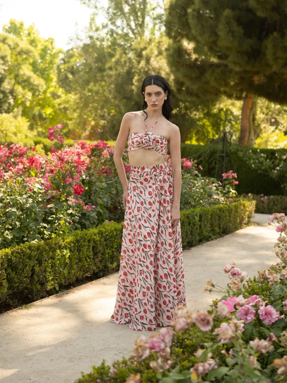 Our Estefania Secret Garden Crop Top in Pink is a halter style crop top featuring a rose detail in the middle. The top ties in the back and behind the neck. Handcrafted in Colombia by female heads of households.