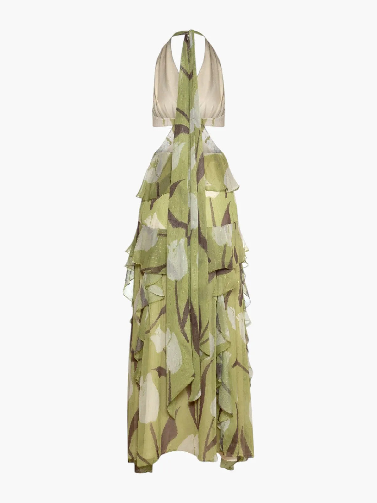 Our Estefania Secret Garden Dress in Apple Green is a maxi length dress with a halter style top. The dress features cut outs and an open back. Handcrafted in Colombia by female heads of households.