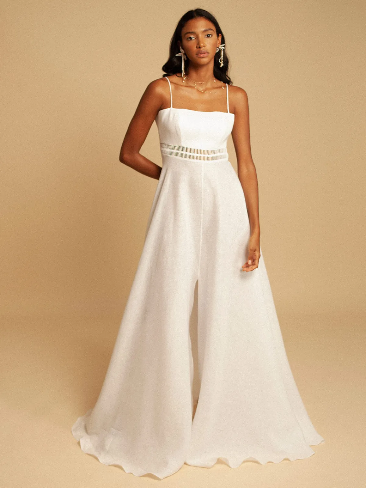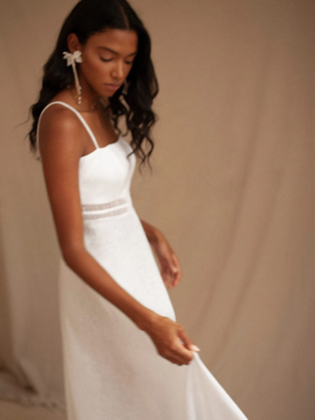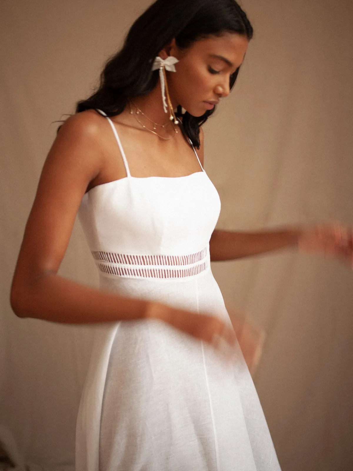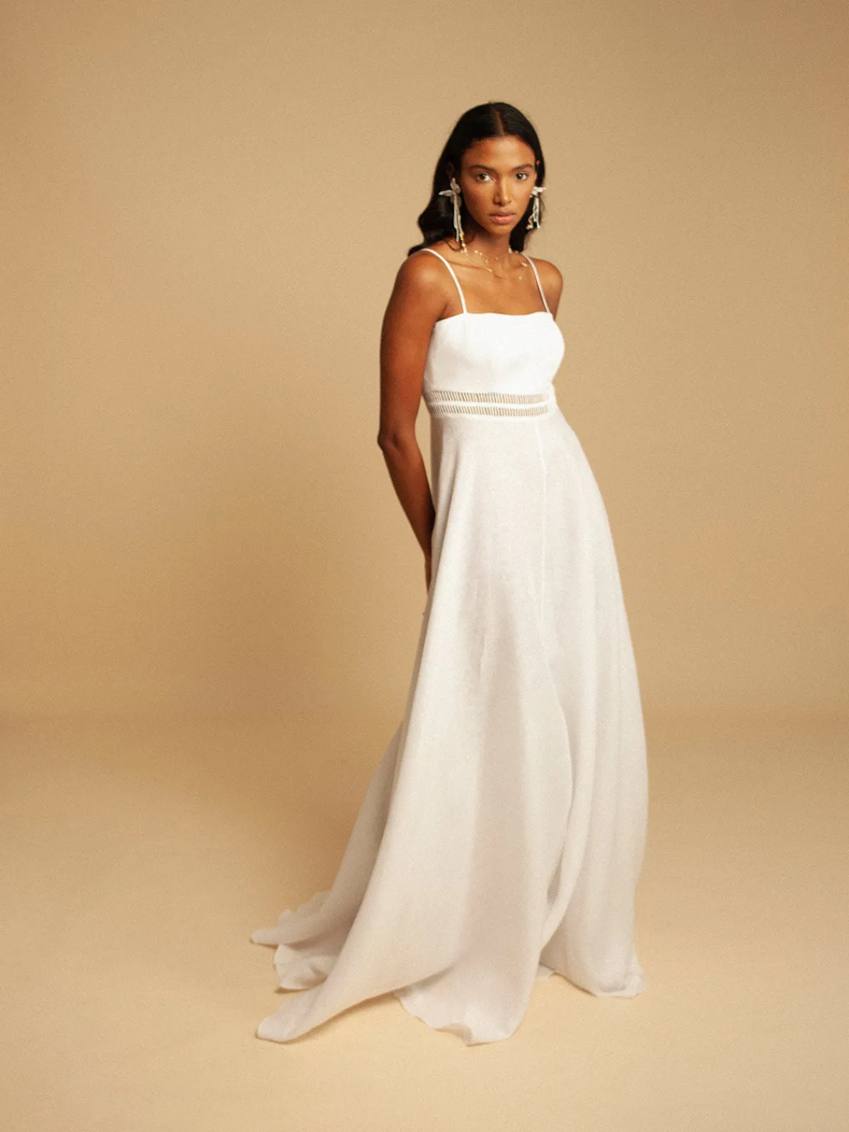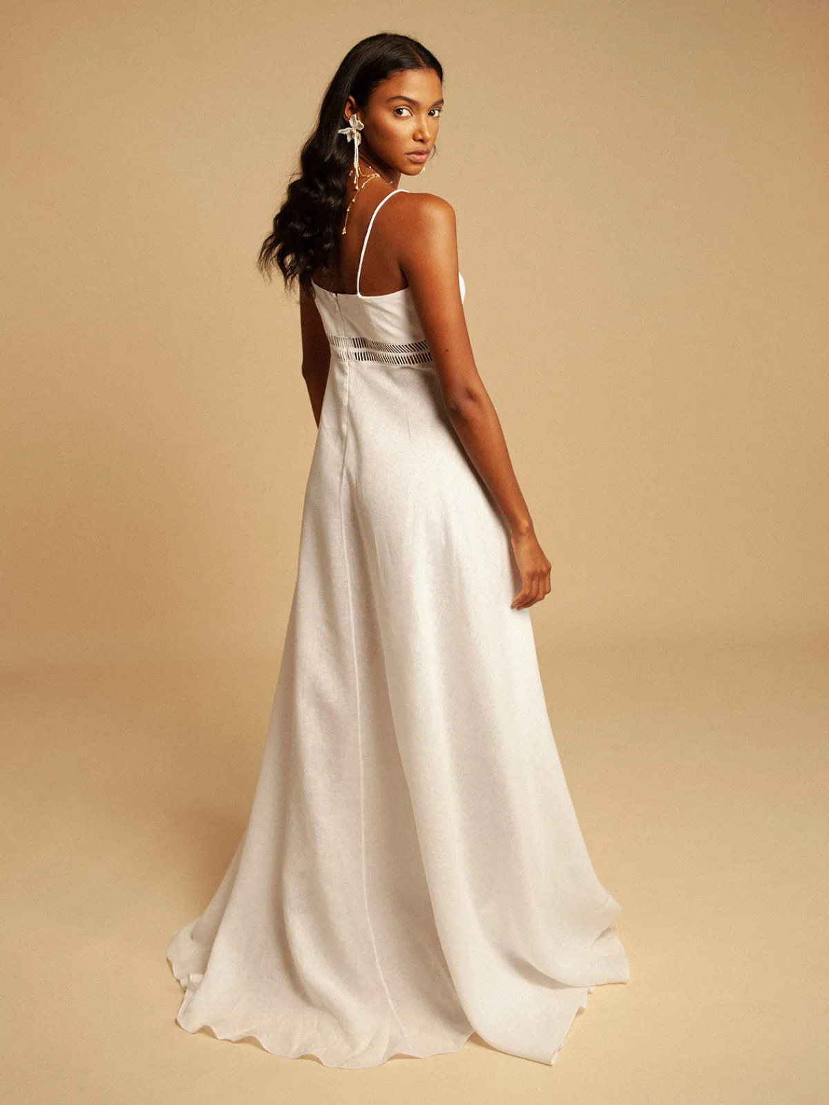 Our Francesca Miranda Cascade Dress features an A-line silhouette with spaghetti straps, a square neckline, a front slit, and a concealed zipper closure. Handcrafted by female heads of households in Colombia.