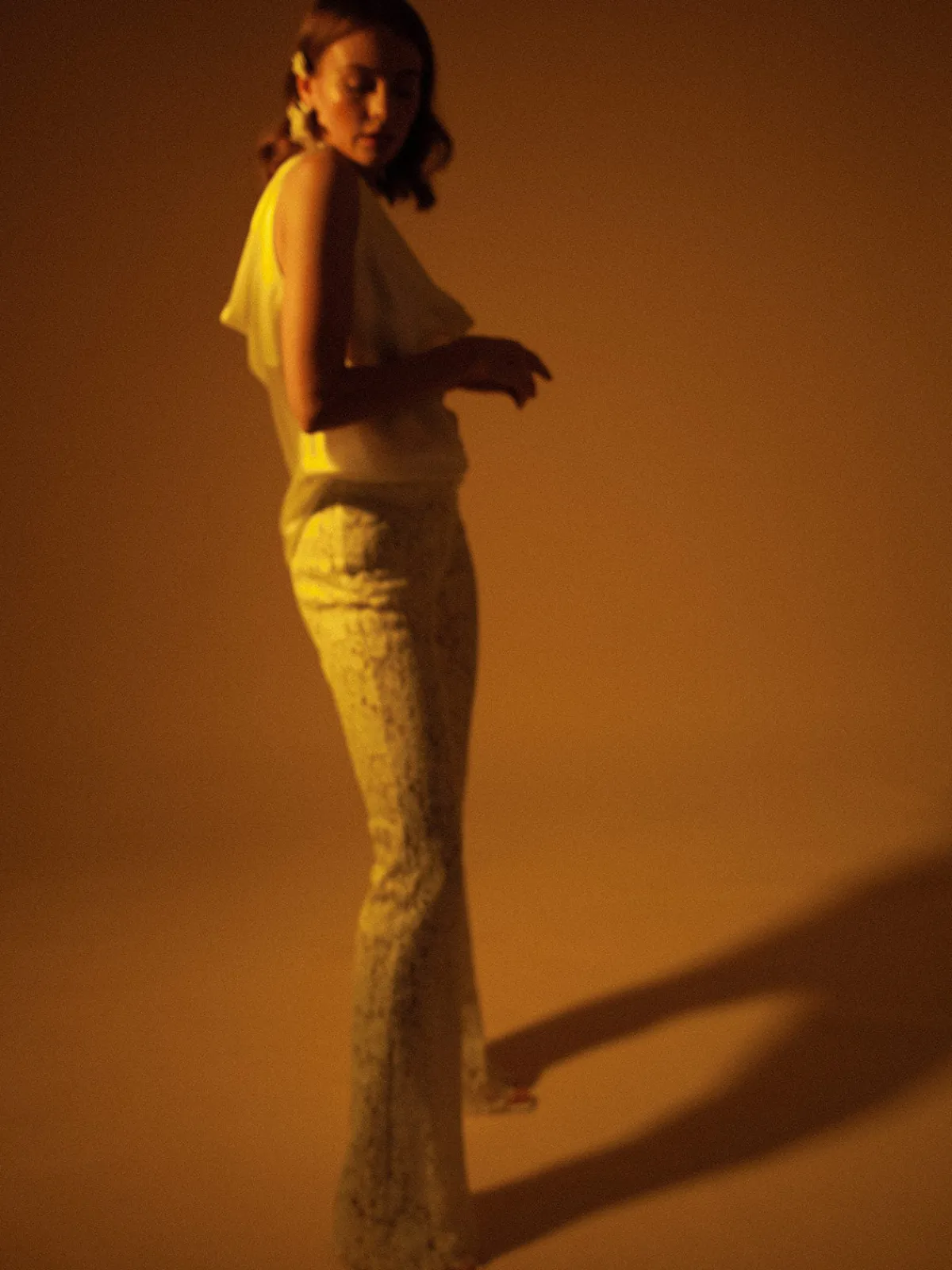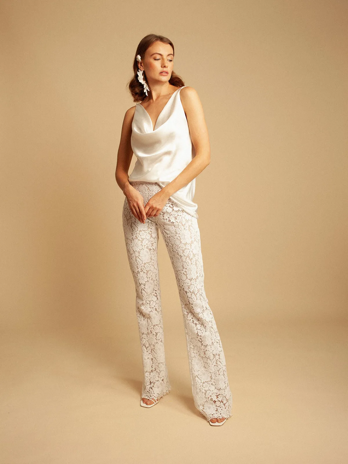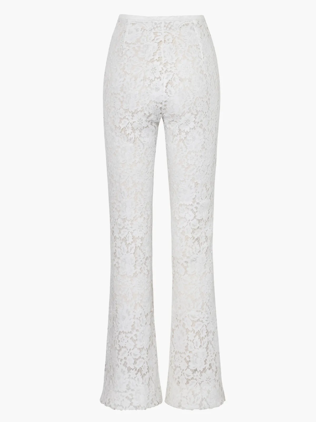 Our Francesca Miranda Celia Pant in French lace flatters in a high waist silhouette with slightly flared legs and a concealed zipper closure. Handcrafted by female heads of households in Colombia.