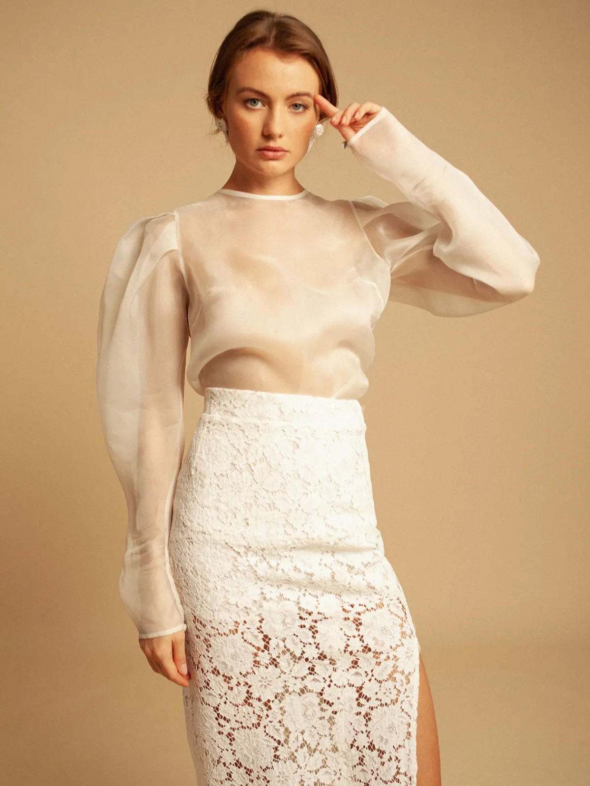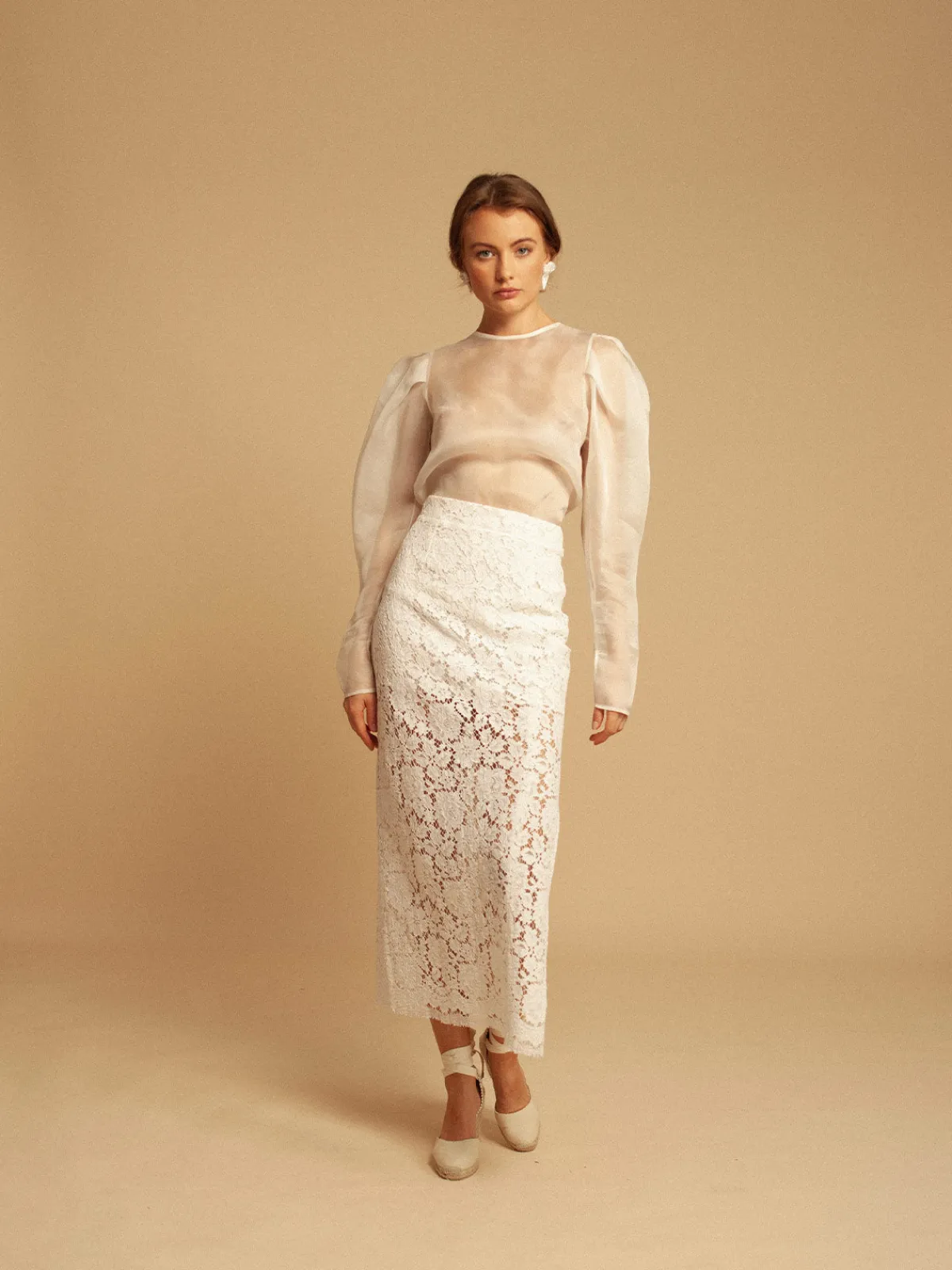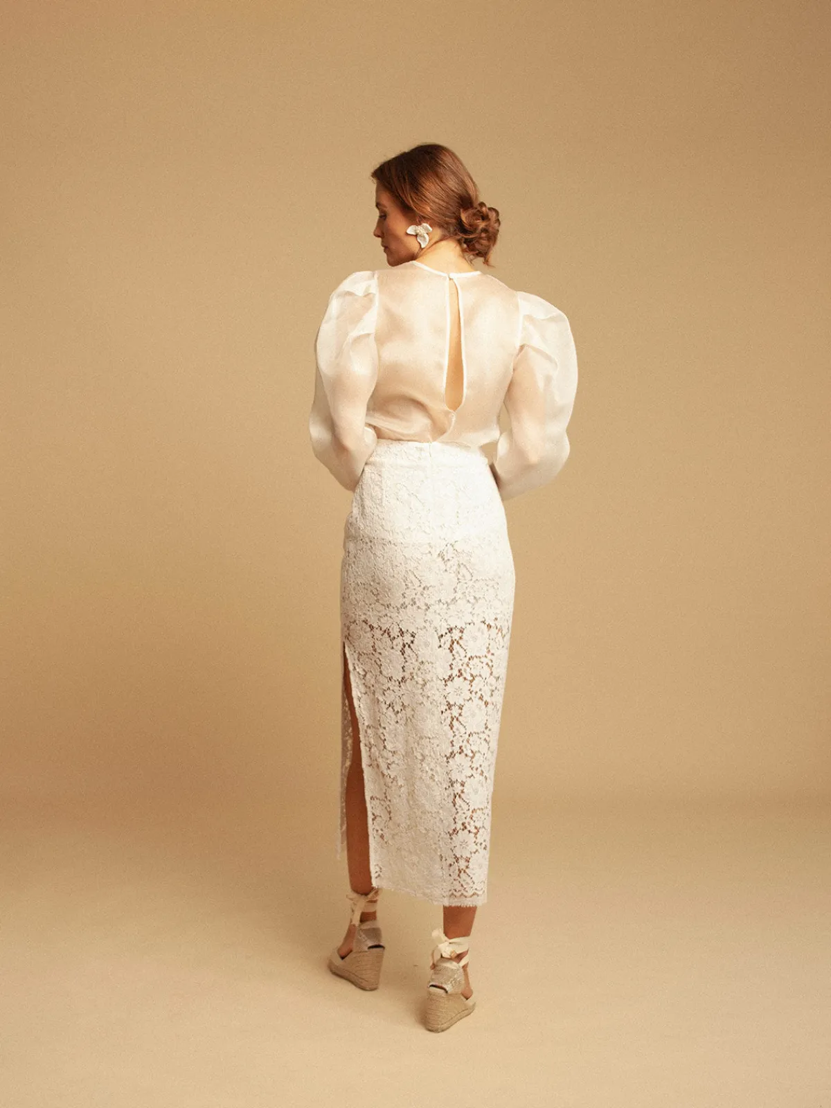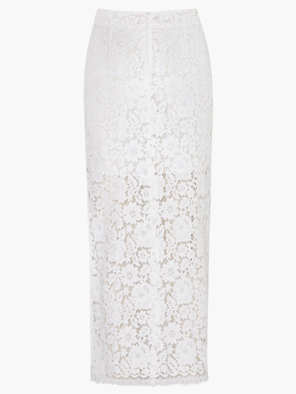 Our Francesca Miranda Celia Skirt features a slim silhouette in delicate lace with a high waist, a concealed zip closure, and a side slit. Handcrafted by female heads of households in Colombia.