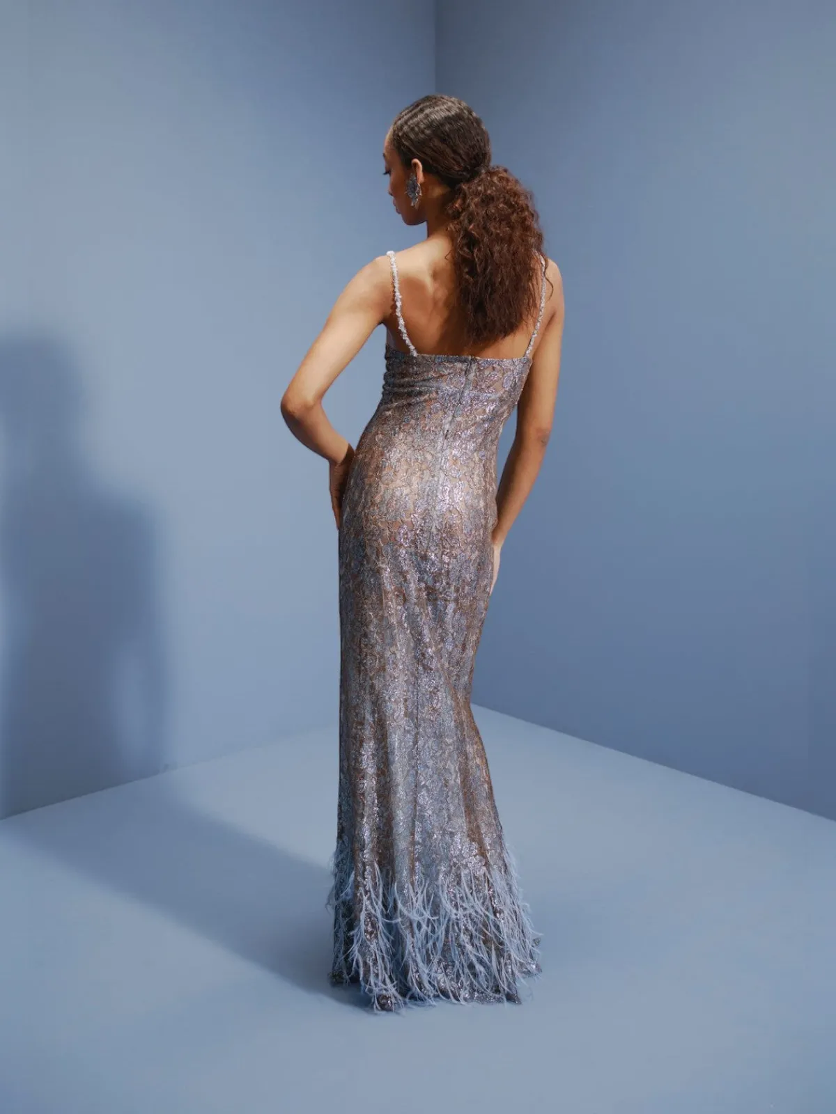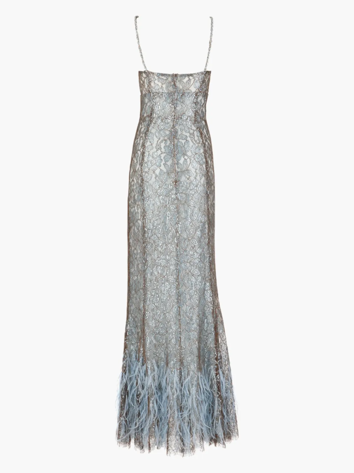 Our Francesca Miranda Cielo De Estrellas Lace Dress is hand-embroidered lace dress with a deep v neckline and thin straps. The dress is a maxi length that flares out at the bottom with a feather hemline. Handcrafted by female heads of households in Colombia.