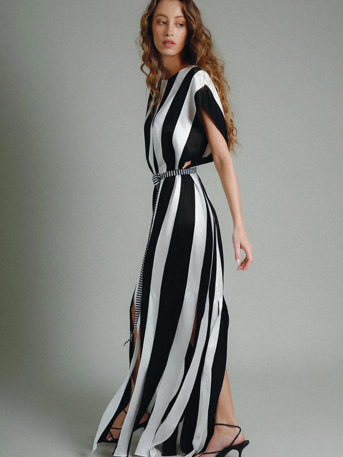 Our Francesca Miranda Cosme Silk Dress is a short sleeve, maxi dress featuring a belt to sinch the waist. The dress also features slits in the front and side.Handcrafted by female heads of households in Colombia.