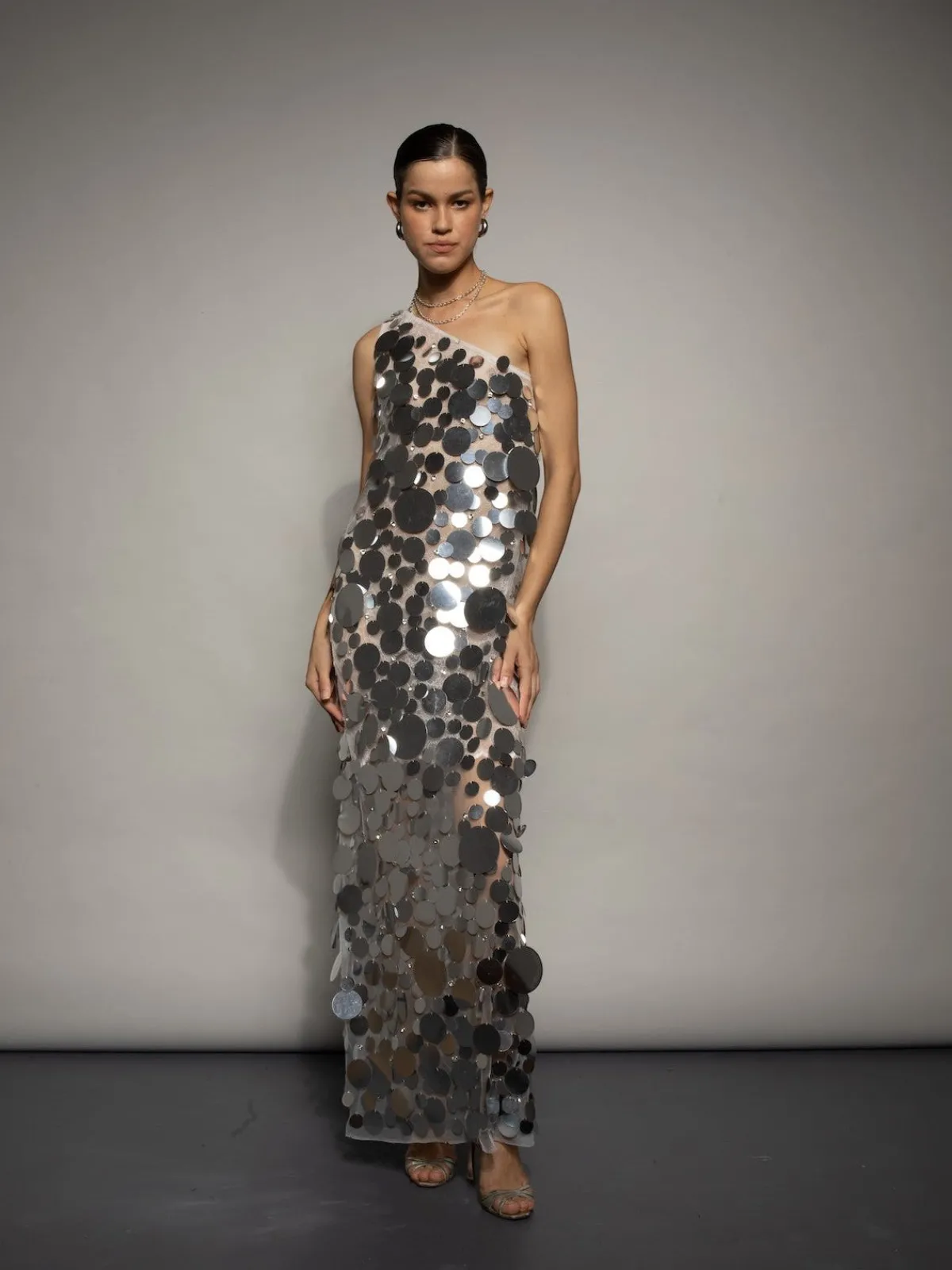 Our Francesca Miranda Disco One-Shoulder Dress is a maxi with a one shoulder detail. This dress features disco details that are added all by hand. The dress has a small slit on the side. Handcrafted by female heads of households in Colombia.