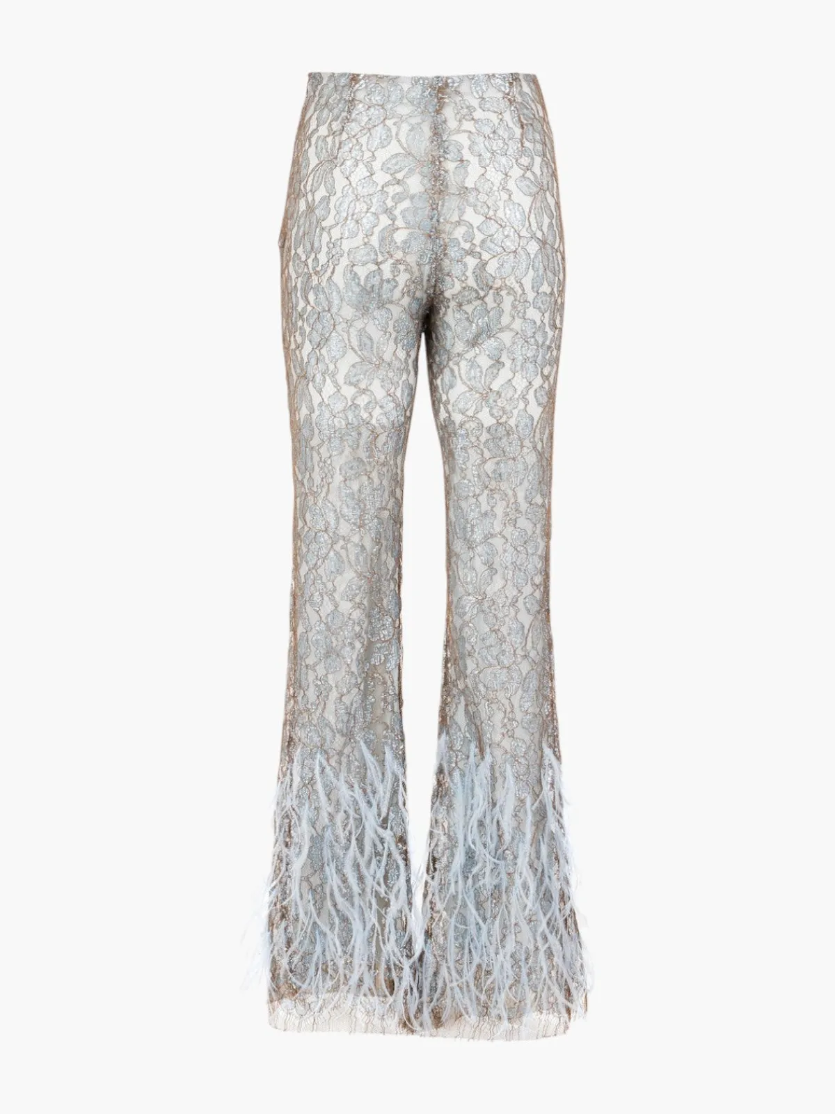 Our Francesca Miranda Elipse Lace Pants is a high waisted pant with a hand embroidered lace detail and hand-embroidered feathers. This pant has a flare bell bottom. Handcrafted by female heads of households in Colombia.