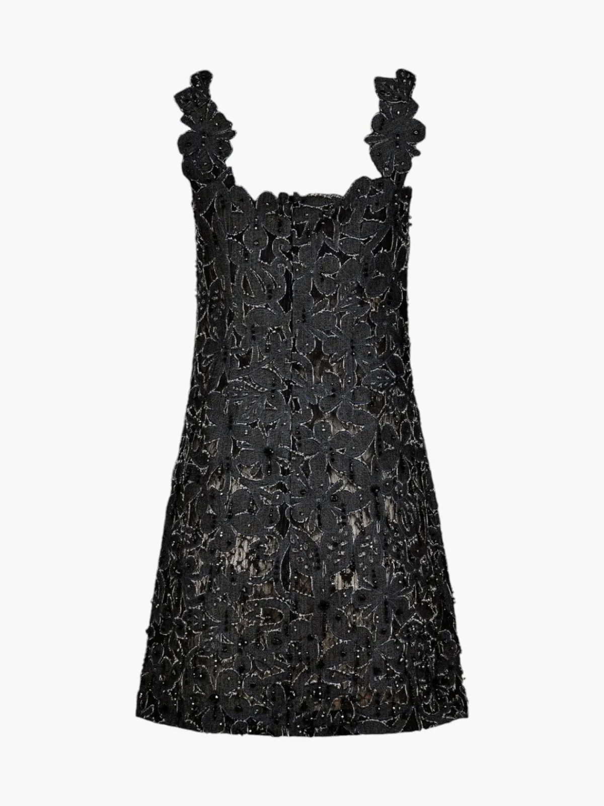 Our Francesca Miranda Emilie Mini Lace Denim Dress is a mini length dress featuring hand embroidered denim lace in a flower pattern. Handcrafted by female heads of households in Colombia.