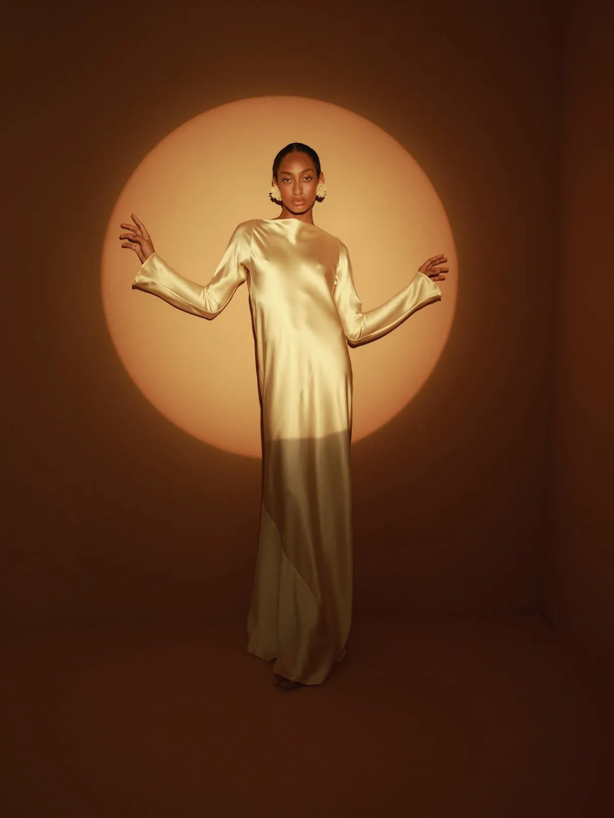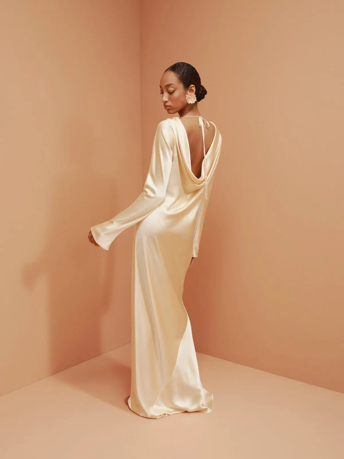 Our Francesca Miranda Fenix Long Sleeve Maxi Dress is a striking silk gown, featuring graceful long sleeves with a subtle flare. Its open back is artfully draped, with delicate ties that enhance the silhouette. This timeless design exudes sophistication, offering a perfect balance of fluidity and allure. Handcrafted by female heads of households in Colombia.