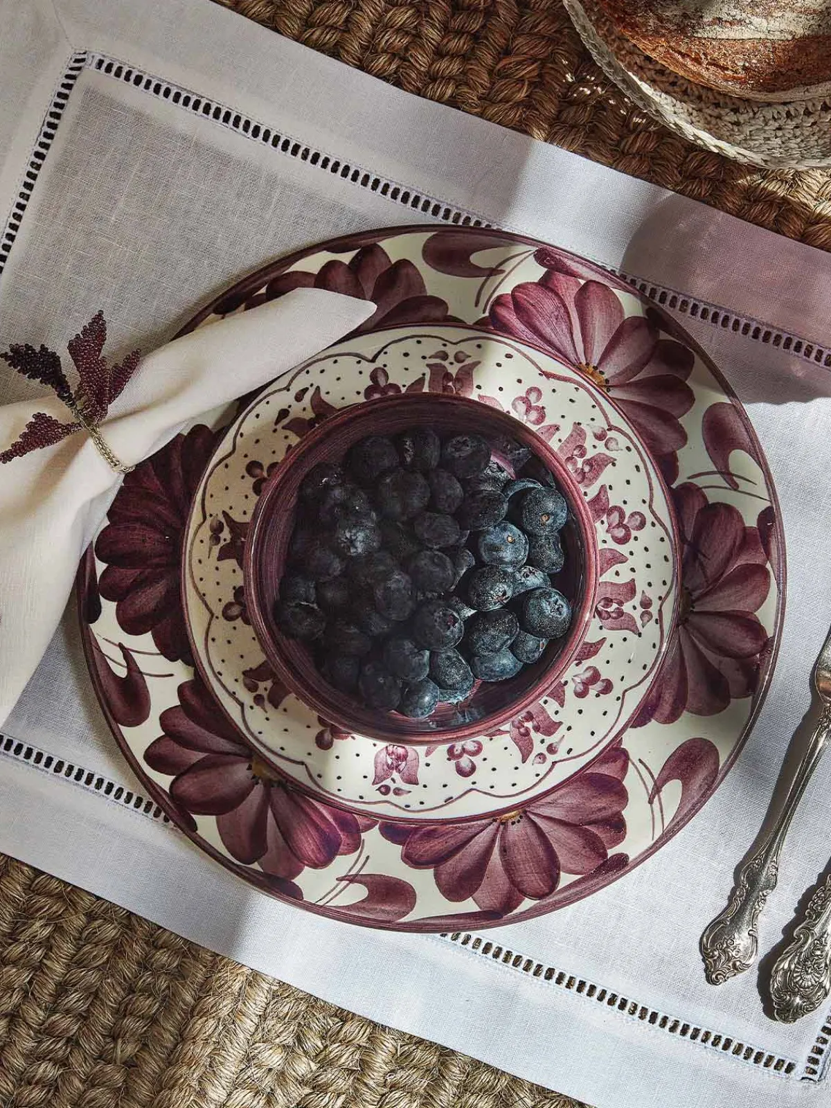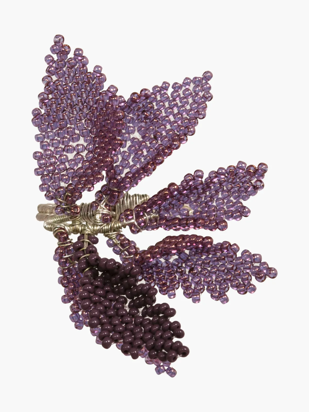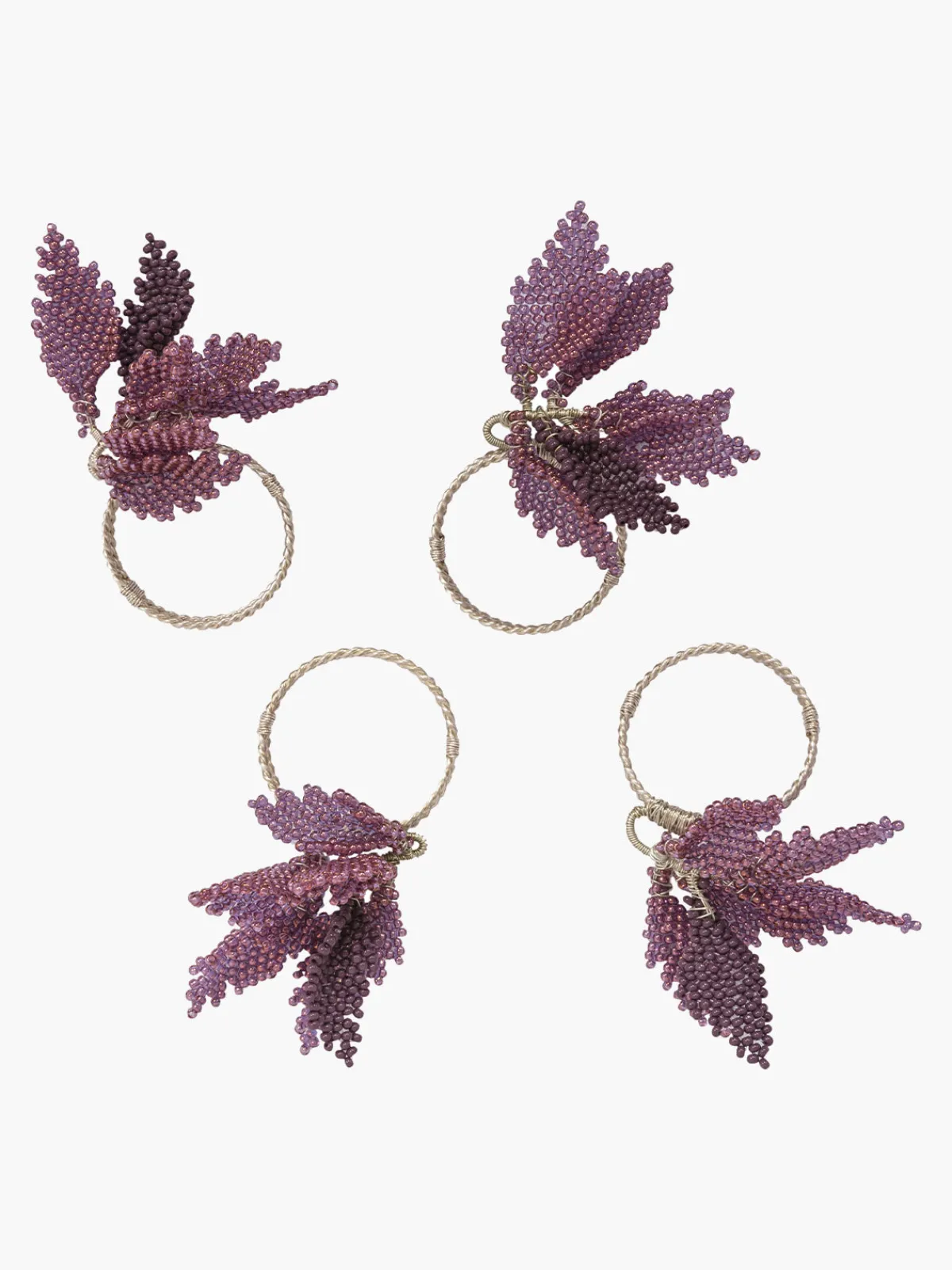 Our Francesca Miranda Hojas Napkin Holder Set of 4 in Violet feature a slender metal ring with a beaded leaf motif in Shakira stones. Handcrafted by artisans in Colombia.