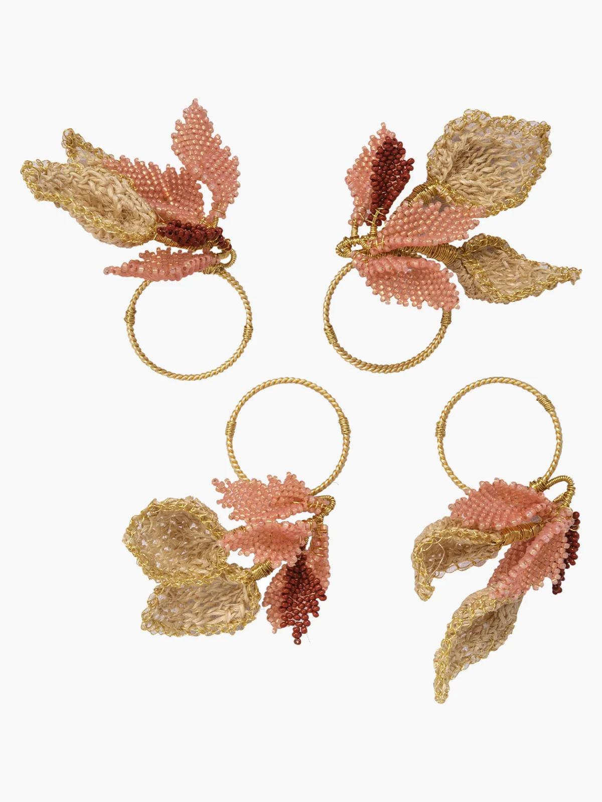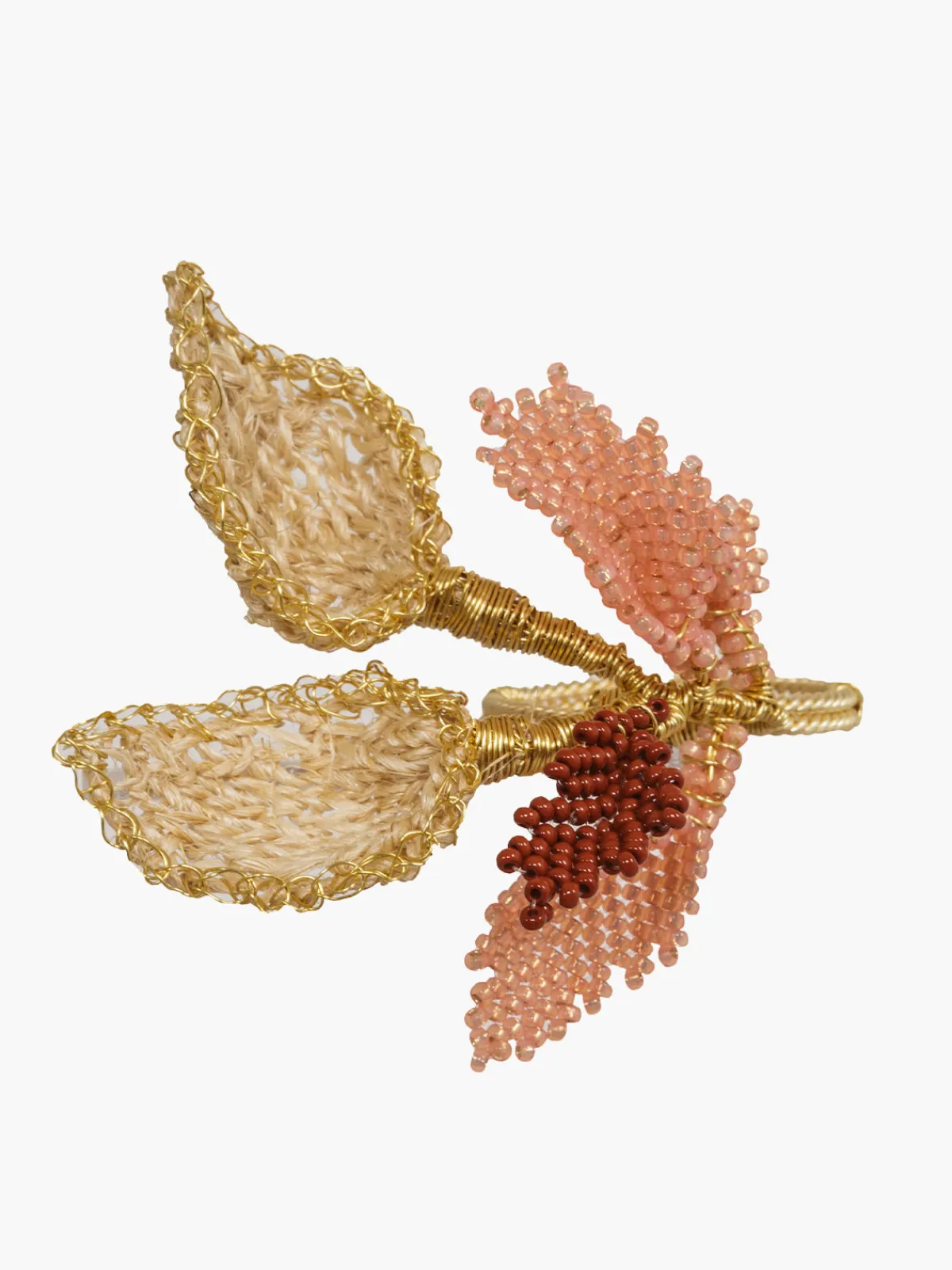 Our Francesca Miranda Hojas Napkin Holder Set of 4 in Peach feature a slender metal ring with a beaded leaf motif in Shakira stones. Handcrafted by artisans in Colombia.