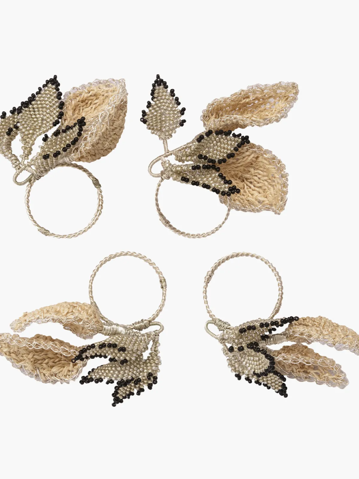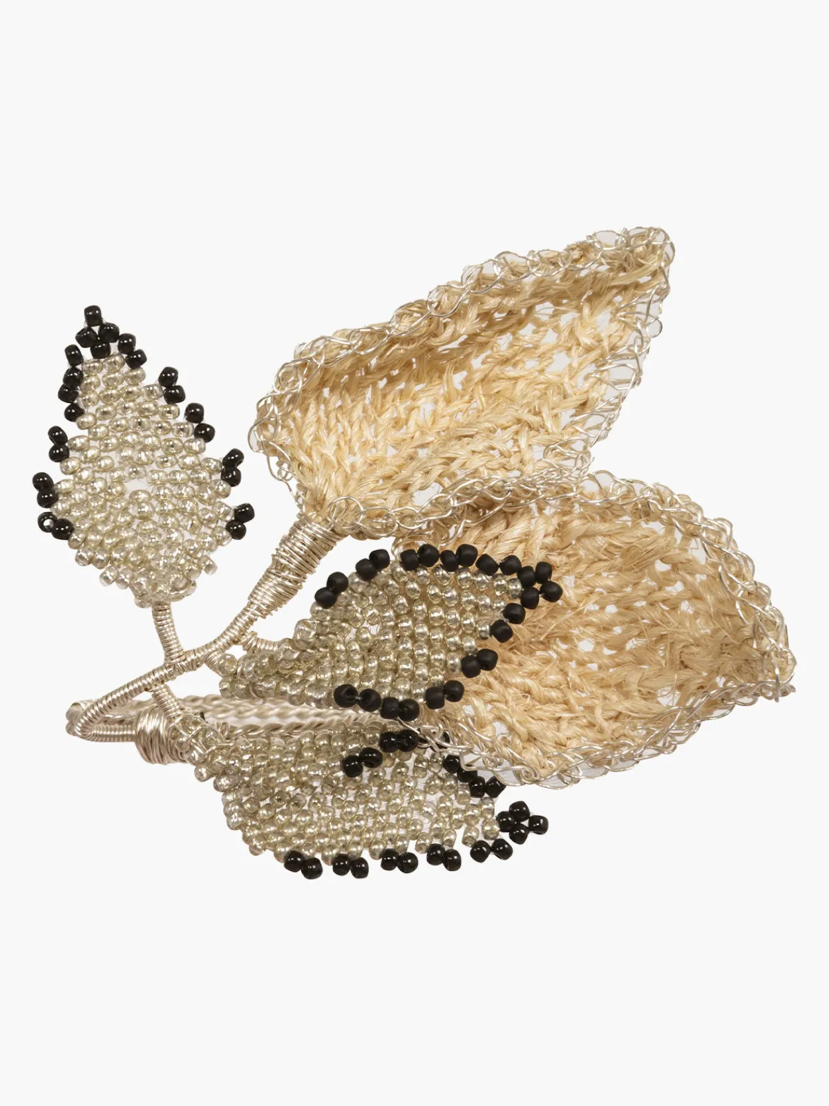 Our Francesca Miranda Hojas Napkin Holder Set of 4 in Silver feature a slender metal ring with a beaded leaf motif in Shakira stones. Handcrafted by artisans in Colombia.