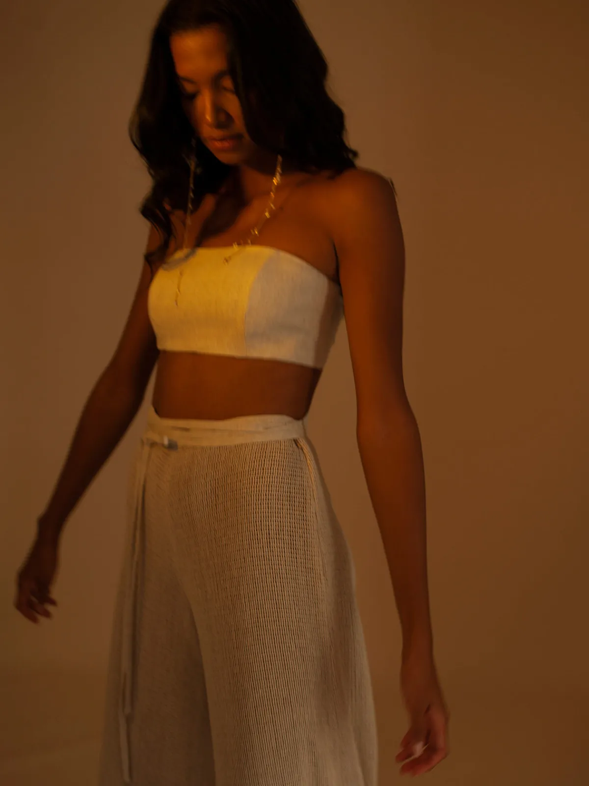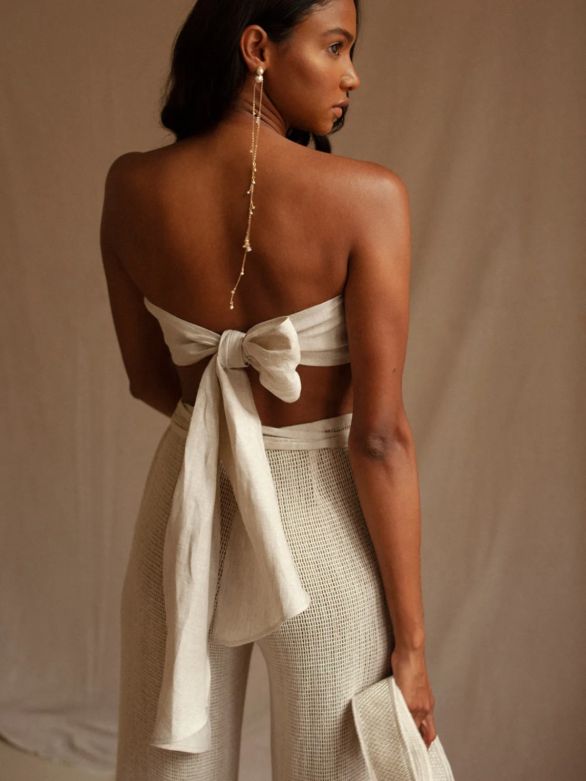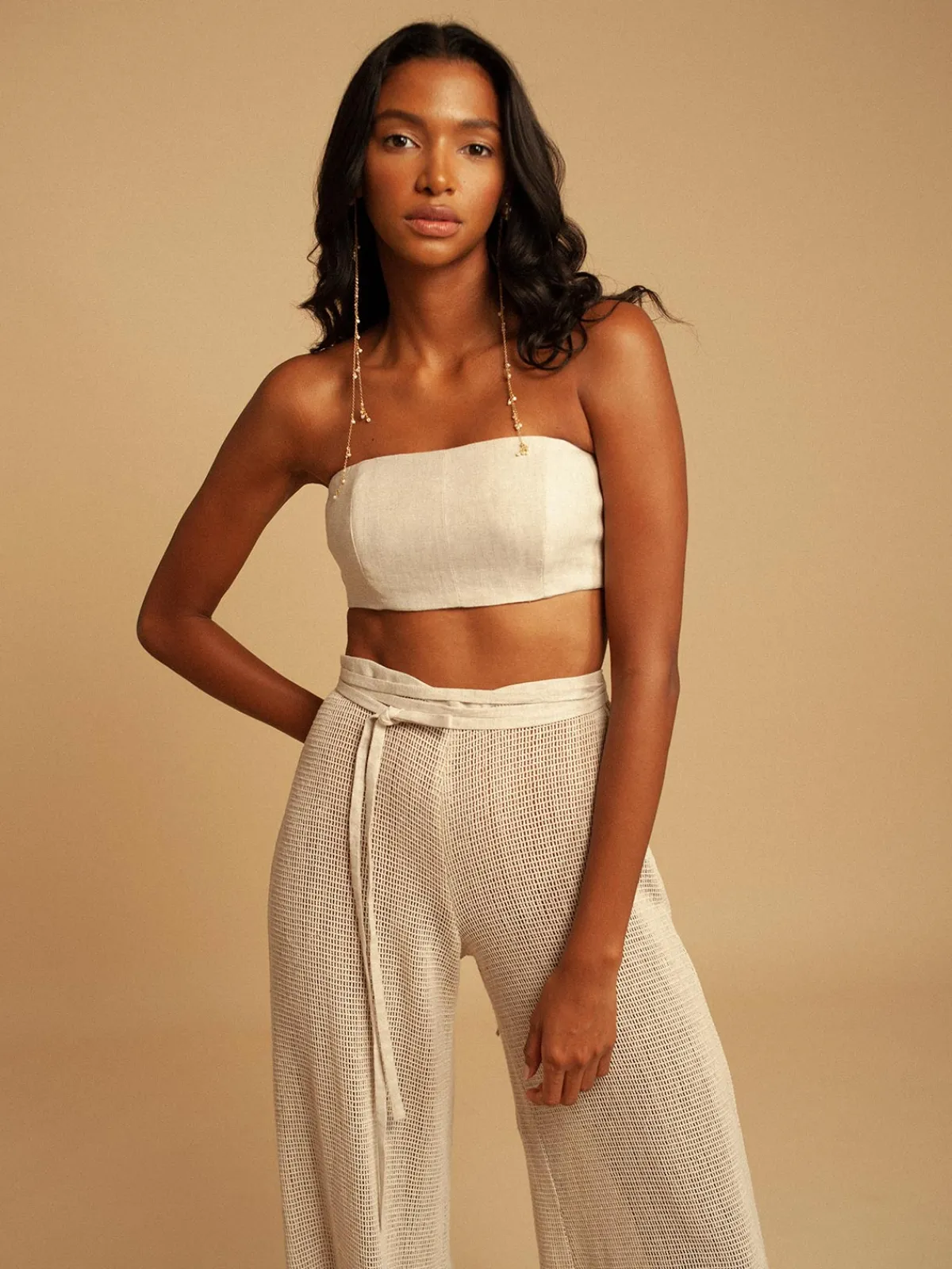 Our Francesca Miranda Isabella Bralette features a strapless cut and a cropped fit with straps that tie into a bow in the back. Handcrafted by female heads of households in Colombia.