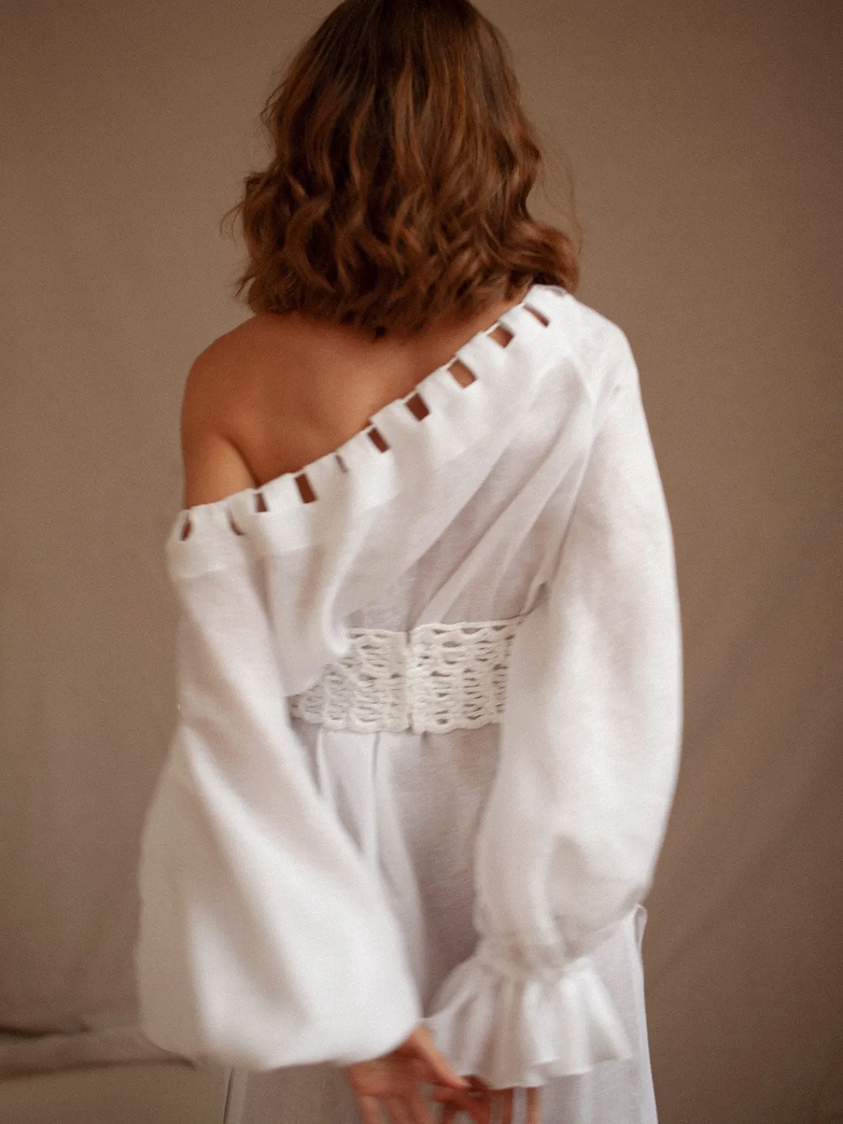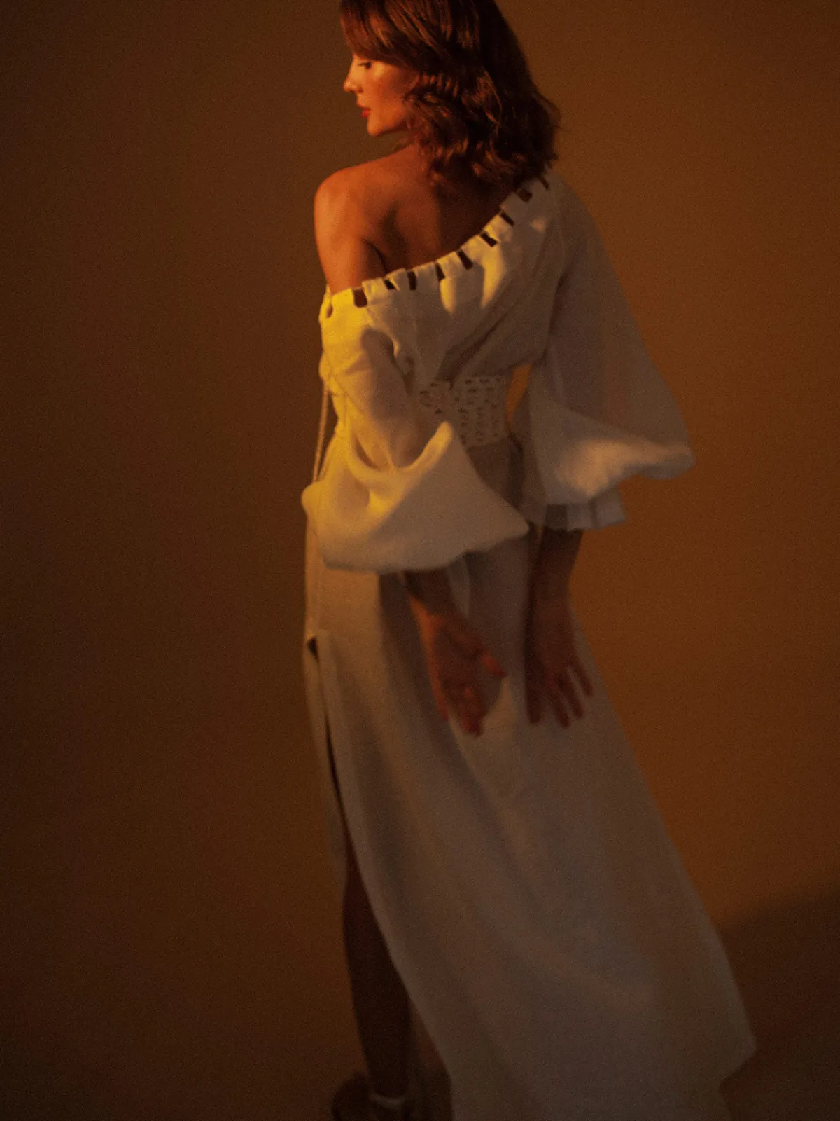 Our Francesca Miranda Jazmin Dress boasts boho elegance in an off the shoulder silhouette with long billowy sleeves and a full maxi skirt with side slits. Handcrafted by female heads of households in Colombia.