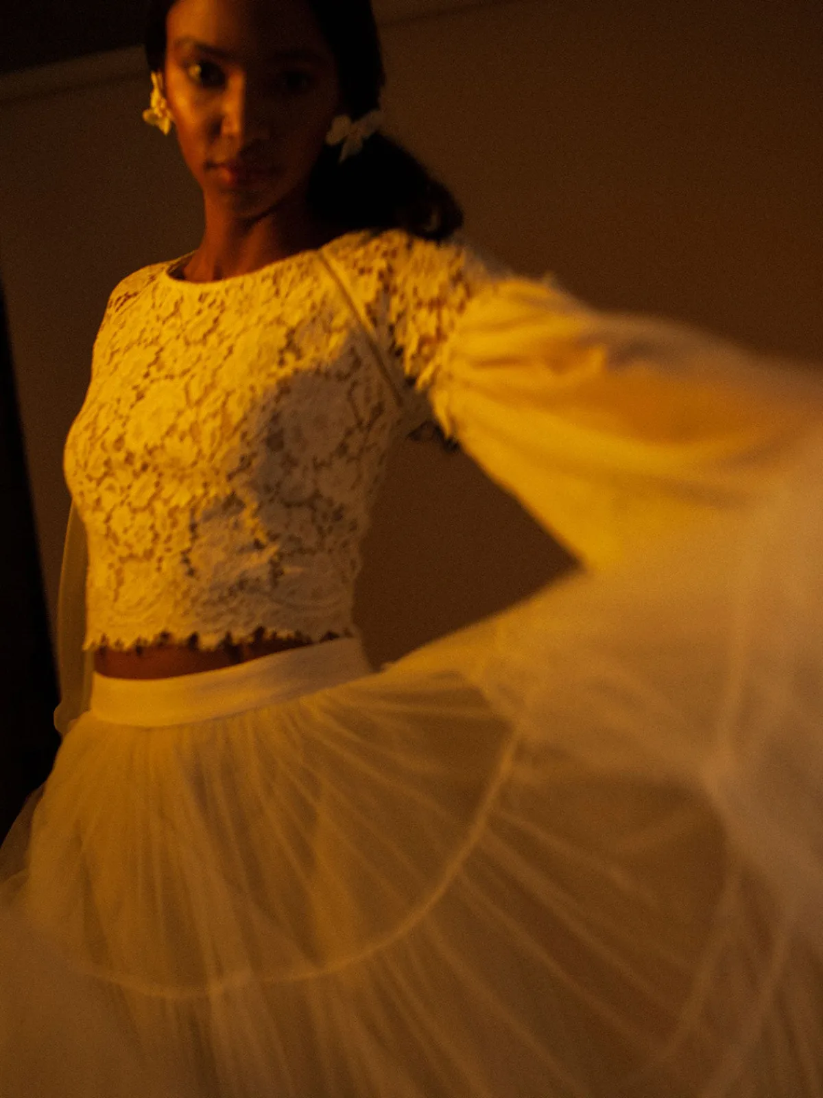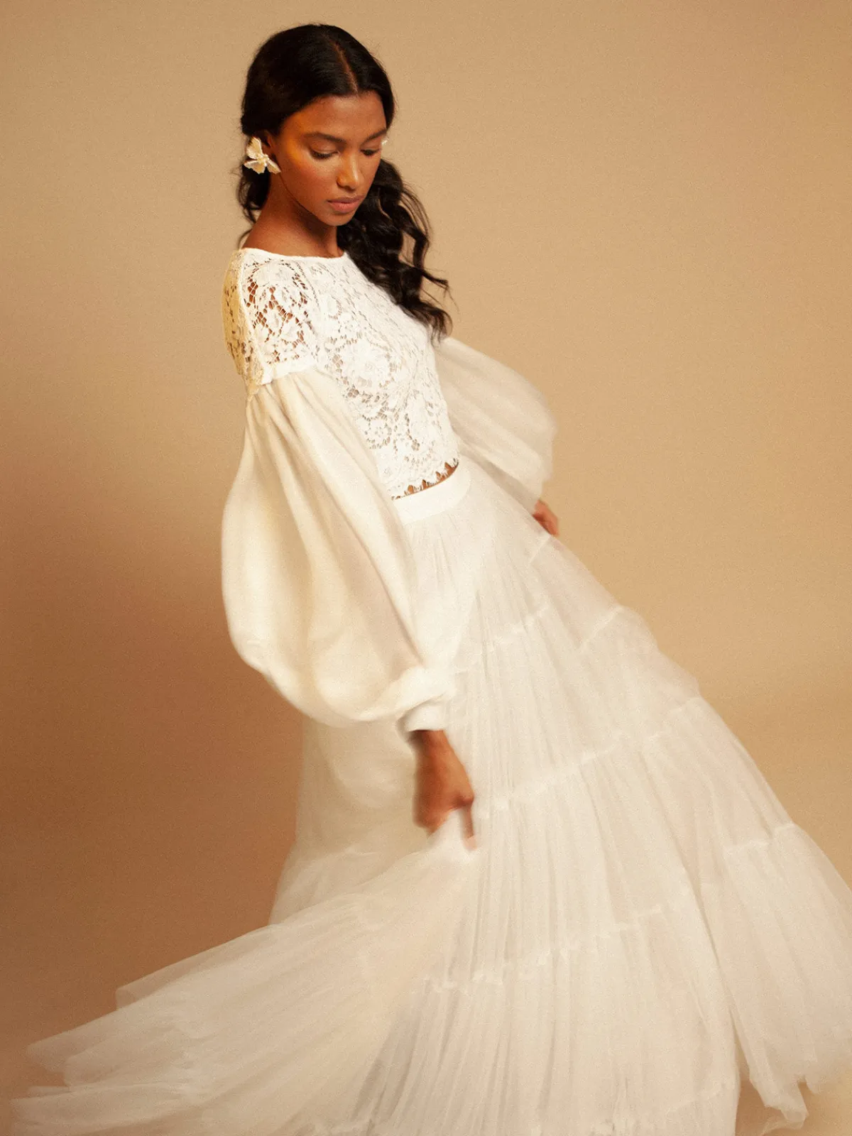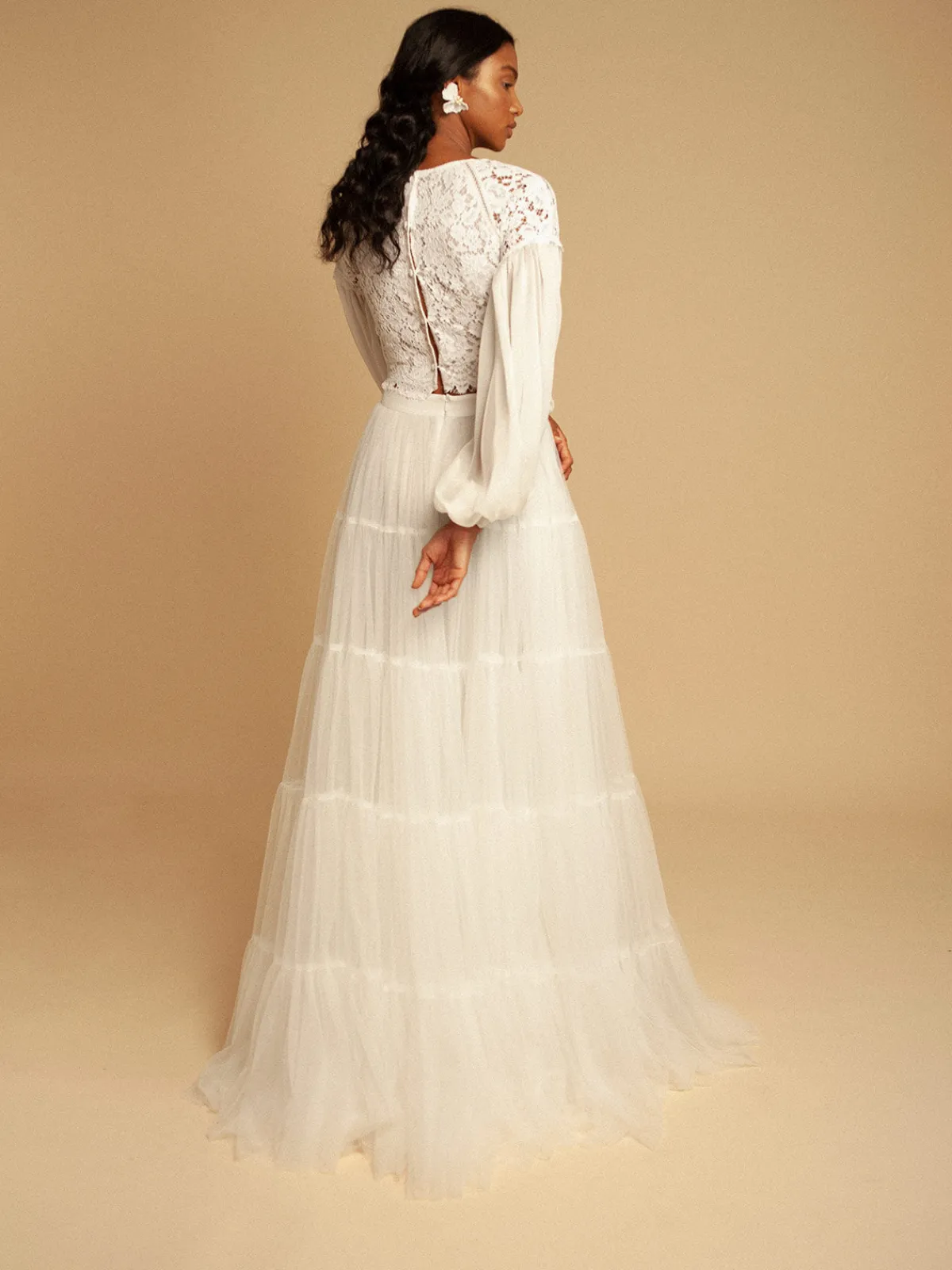 Our Francesca Miranda Juliane Blouse features a slightly cropped fit with a lace bodice, a round neckline, billowy chiffon sleeves, and button closures down the center back. Handcrafted by female heads of households in Colombia.