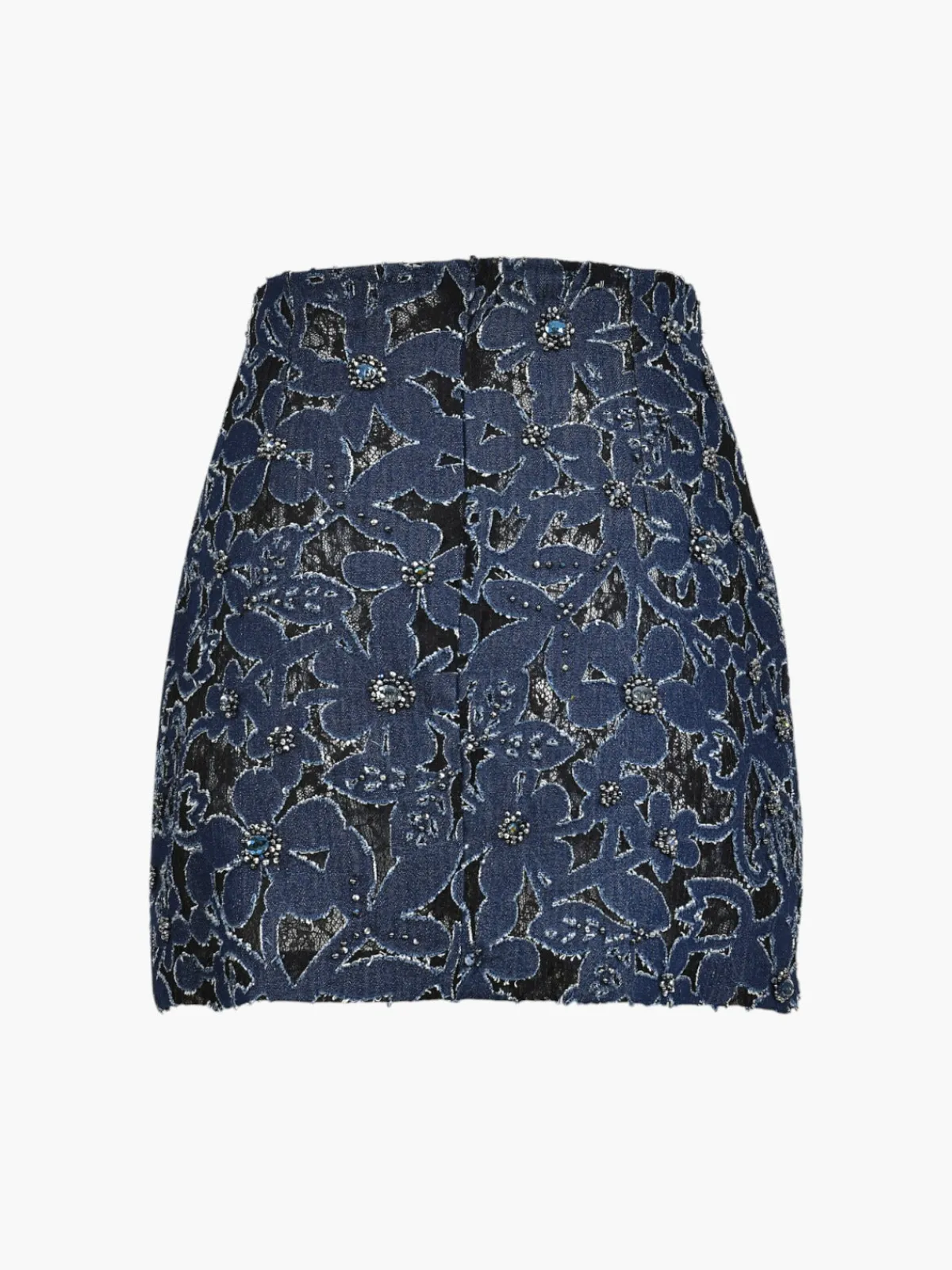Our Francesca MirandaLuces Denim Skirt is a hand-embroidered mini skirtthat is adorned with delicate lace.Handcrafted by female heads of households in Colombia.