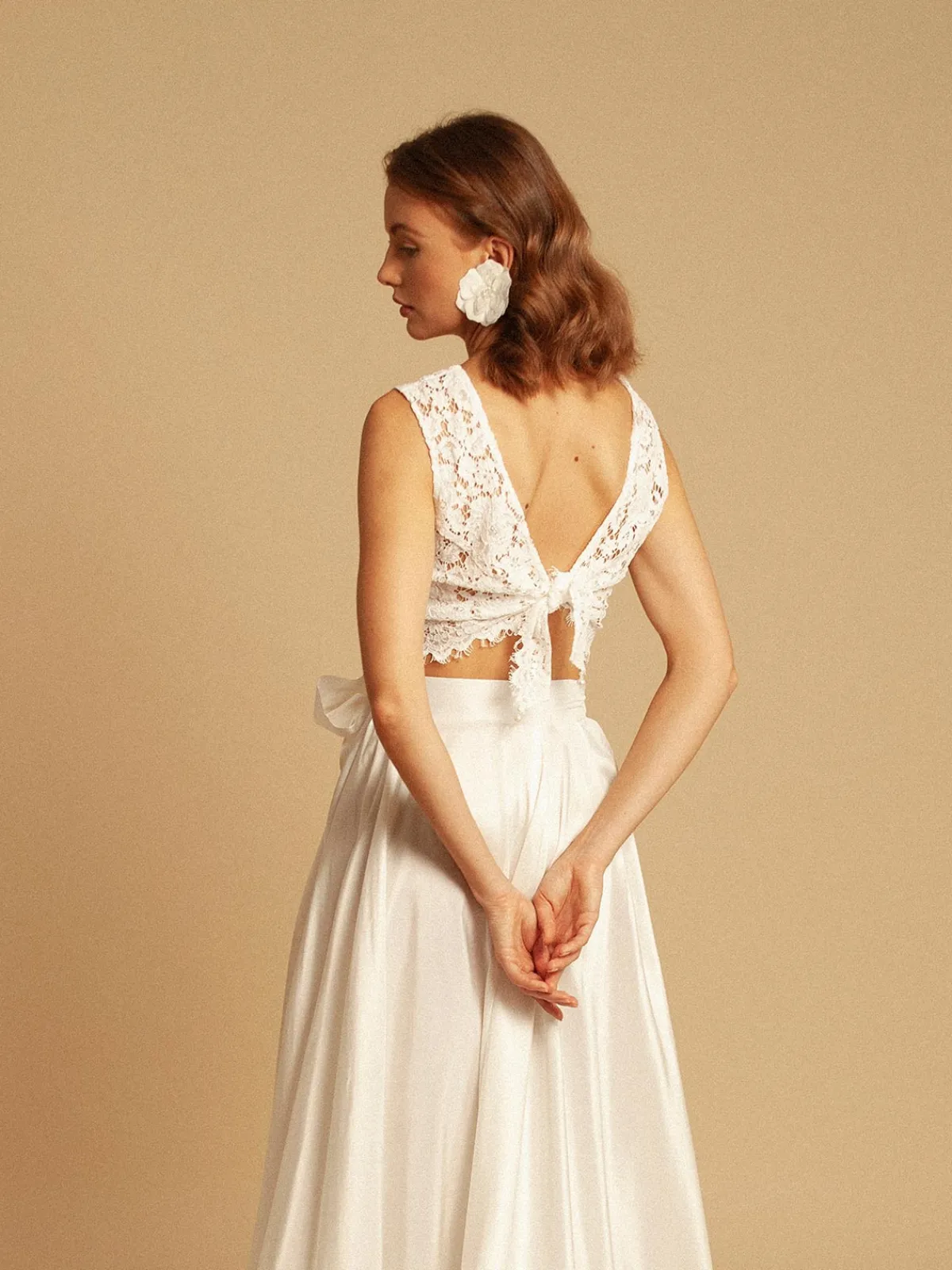 Our Francesca Miranda Odette Top features a slightly cropped silhouette in delicate lace with a sleeveless cut, a round neckline, and a V-shaped back with a twist knot. Handcrafted by female heads of households in Colombia.