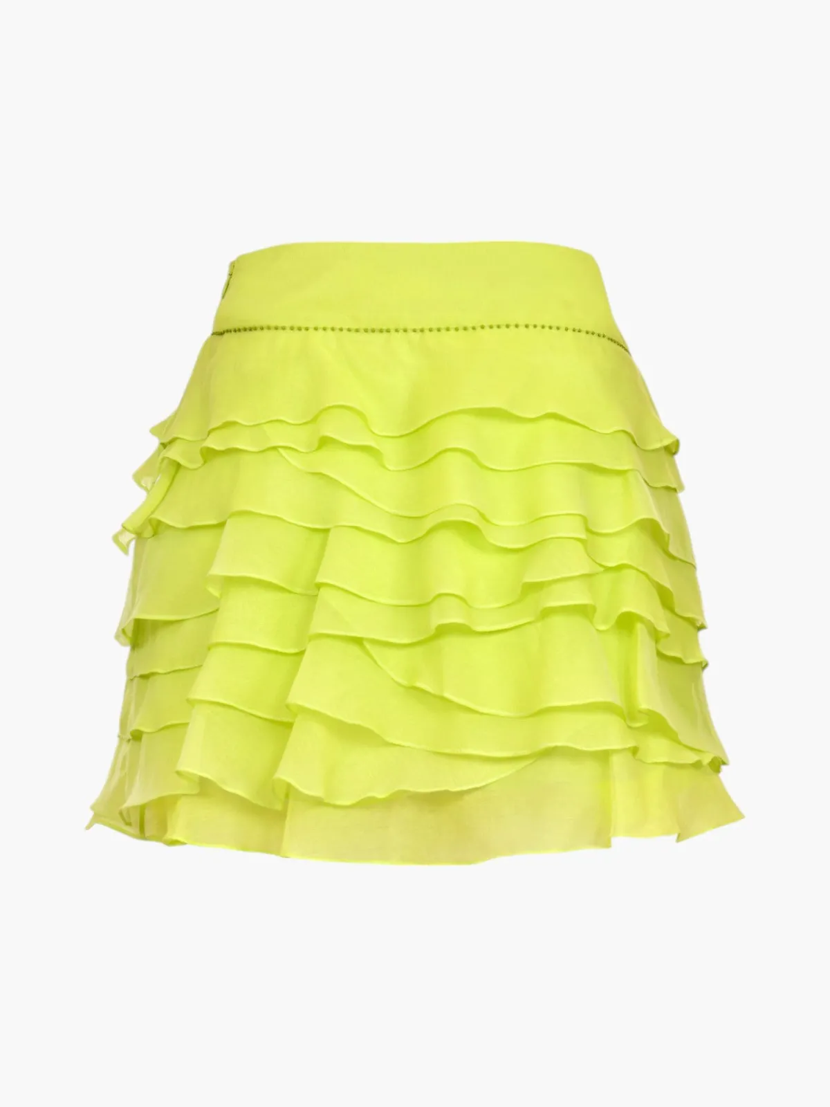 Our Francesca Miranda Olas Cotton Mini Skirt in Green strikes a balance between structure and fluidity, with gentle ruffles that imitate the gentle sway of a warm summer wind. The bright lime green color lends a romantic and refreshing touch, resulting in a garment that radiates effortless sophistication and graceful motion. Handcrafted by female heads of households in Colombia.